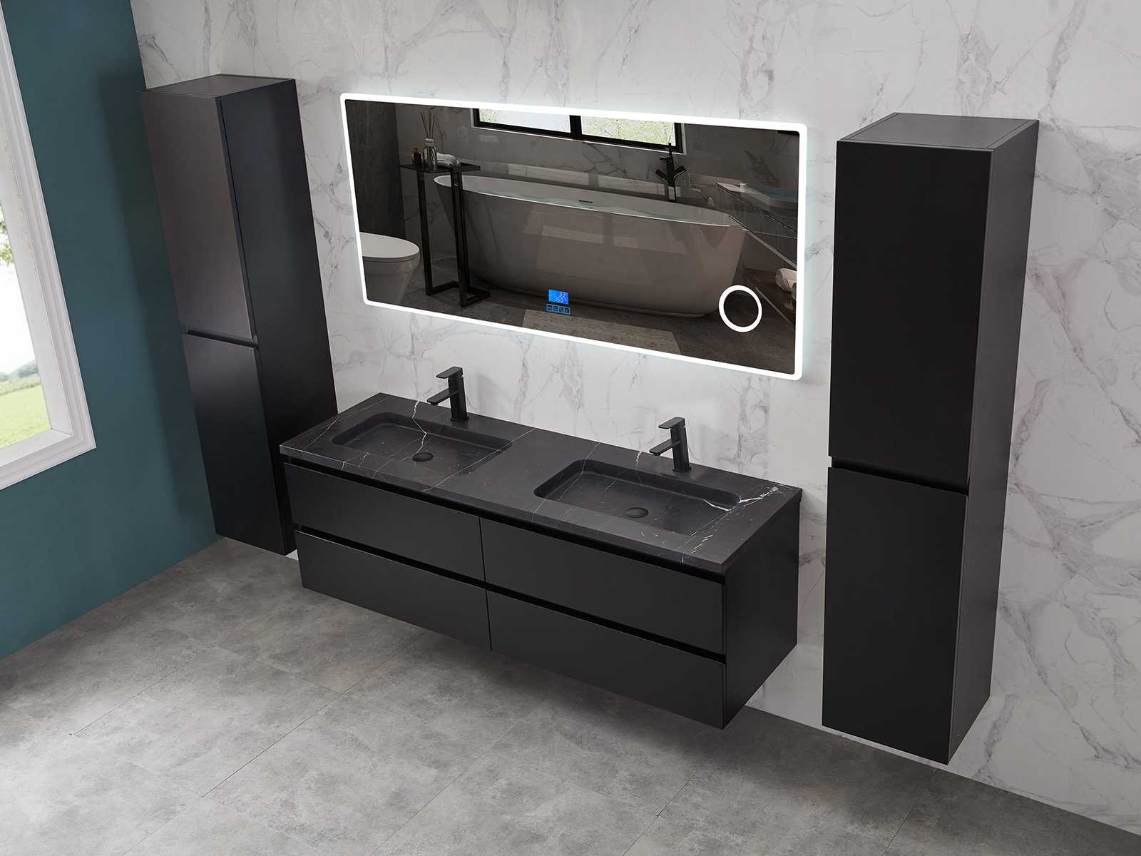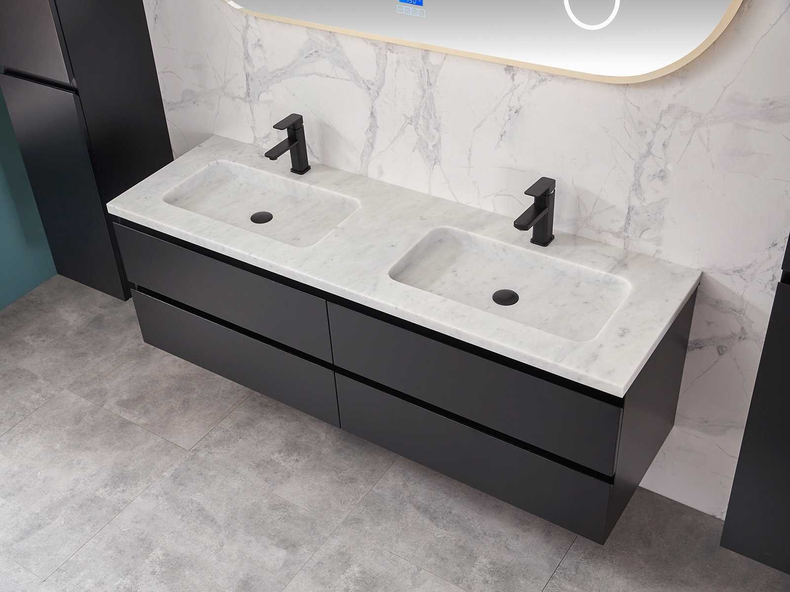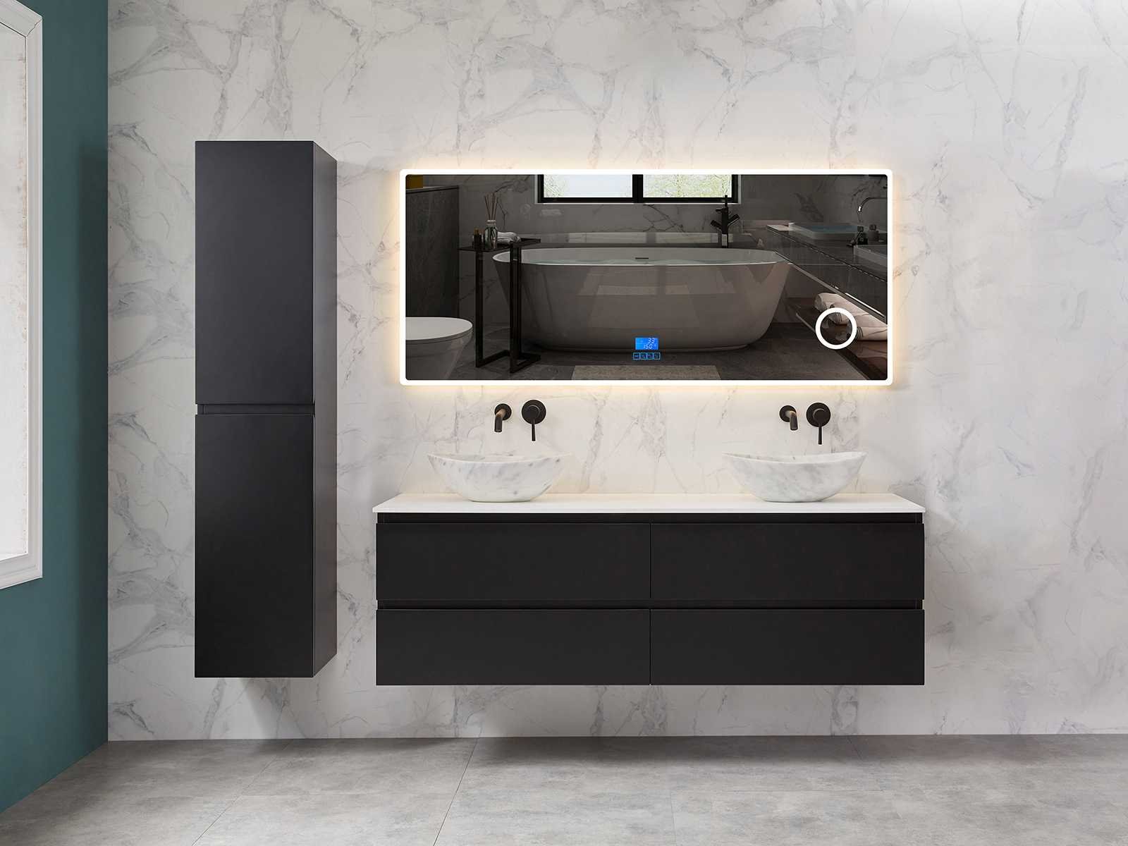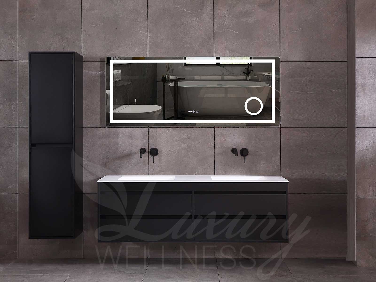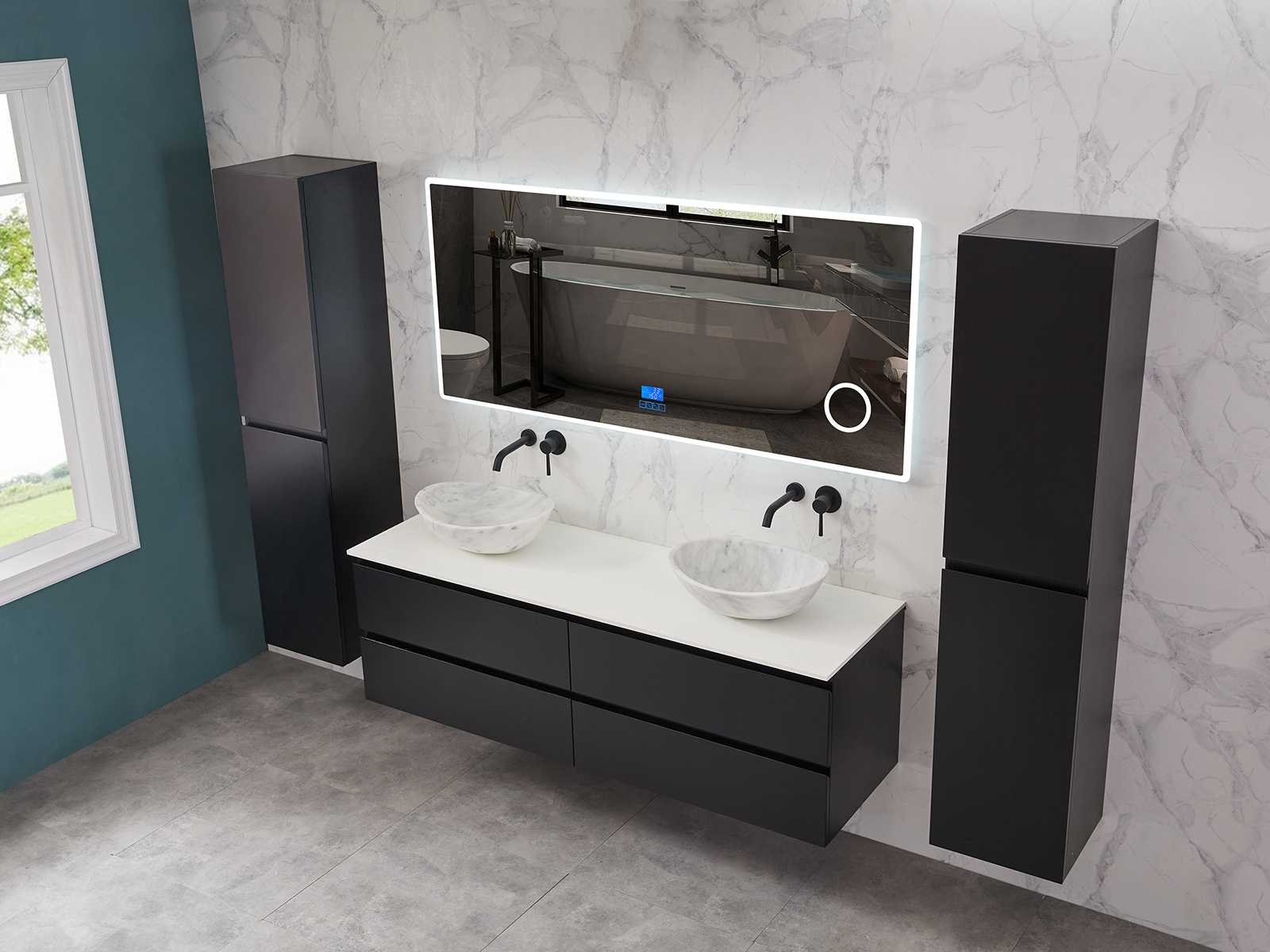 Afmeting meubel bxdxh 160x49x50cm - hangkast 35x35x160cm (1 hangkast zit bij de aankoop), kleur mat zwart, materiaal 2cm 5-laags multiplex(zeer sterk en vochtbestendig),met solid surface topplaat indien gewenst(mat wit of mat zwart), Hangkast softclose deuren en extra planchets (hangkast is universeel en kan zowel links als rechts naast het meubel gehangen worden), kranen exclusief , Lades 4 stuks met softclose, Wasbakken solid surface, natuursteen(met en zonder kraangaten beschikbaar de vaste wastafels) of italiaans marmer (keuze uit diverse modellen en kleuren van de laatste foto's graag doorgeven op afhaaldag), led spiegel met verwarming/radio/klok en vergrootglas met ledverlichting rondom aan de voorkant met 3 verstelbare kleuren led 3000/4500/6000k led-dioden (geel/blauw/wit licht) met de volgende opties digitaal display, geïntegreerde vergrotingsspiegel van 10cm doorsnede met ledverlichting(vergroot 3x), digitale klok, digitale temperatuur aanduiding, 220volt stekker(plug and play), afvoeren exclusief, Conditie: Nieuw in doos, Bijzonderheden 2 jaar garantie, gaten zijn niet in het topblad voorgeboord in u voor deze keuze gaat zodat u zowel muurkranen als kranen vanaf het blad kunt gebruiken of zelf 1 wastafel in plaats van 2 stuks(gaten boren is geen enkel probleem en zeer gemakkelijk uit te voeren bij solid surface) compleet met installatiekit, natuursteen wastafels zijn behandeld met coating, zeer hoge kwaliteit, let op! de hangkast mag geruild worden voor een set kranen en popup afvoeren naar keus of als u een extra hangkast nodig graag op de afhaaldag aangeven voor een passende aanbieding Merk: Mawialux Model: Brandon Hoogte: 50cm Lengte: 49cm Breedte: 160cm Materiaal: 2cm massief top en 5-laags multiplex(zeer sterk en vochtbestendig) Kleur: Mat zwart Kraan: exclusief Wastafel: diverse keuzes Waskom: diverse keuzes Spiegel met verlichting: ja Verlichting: ja Lades: 4 Softclose: true Bevestigingsmateriaal: true Zijkast: ja 1x