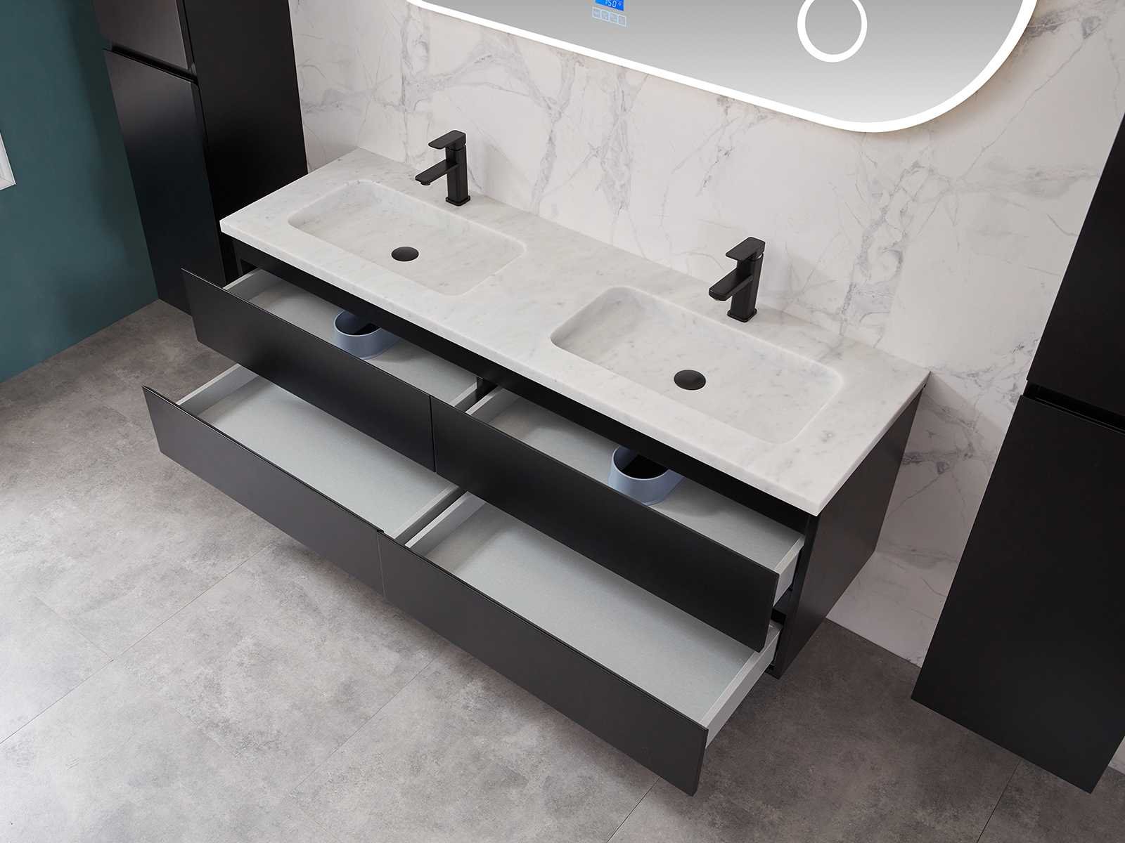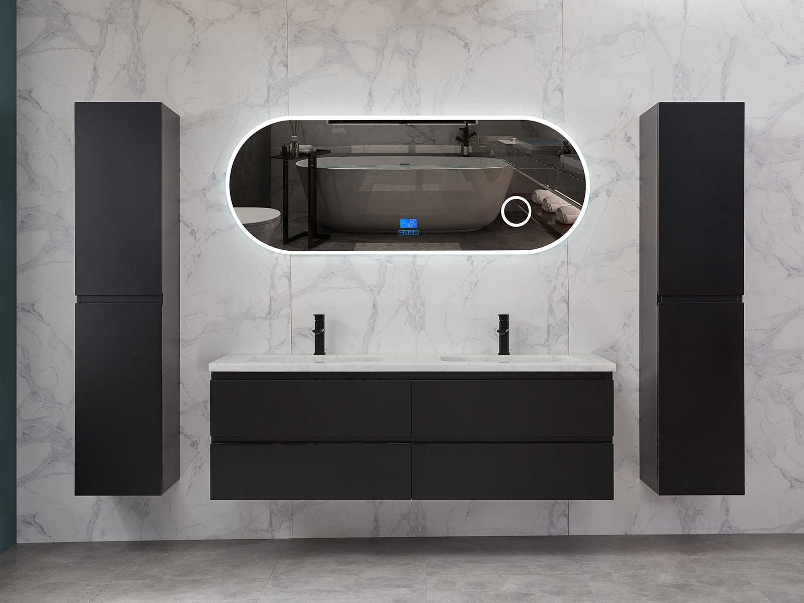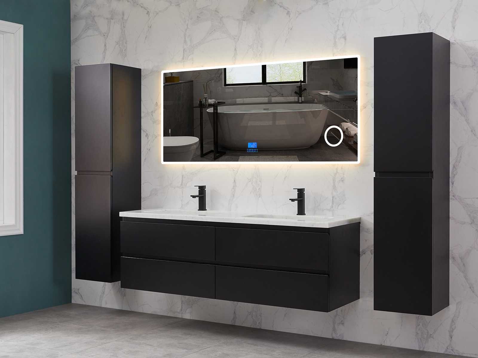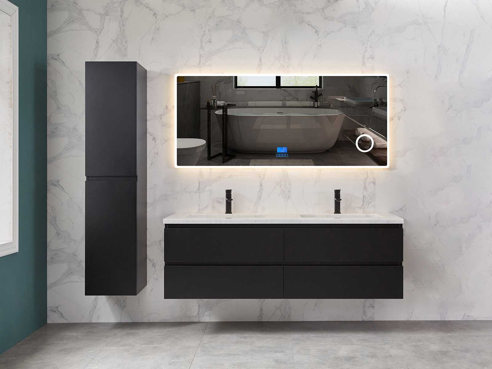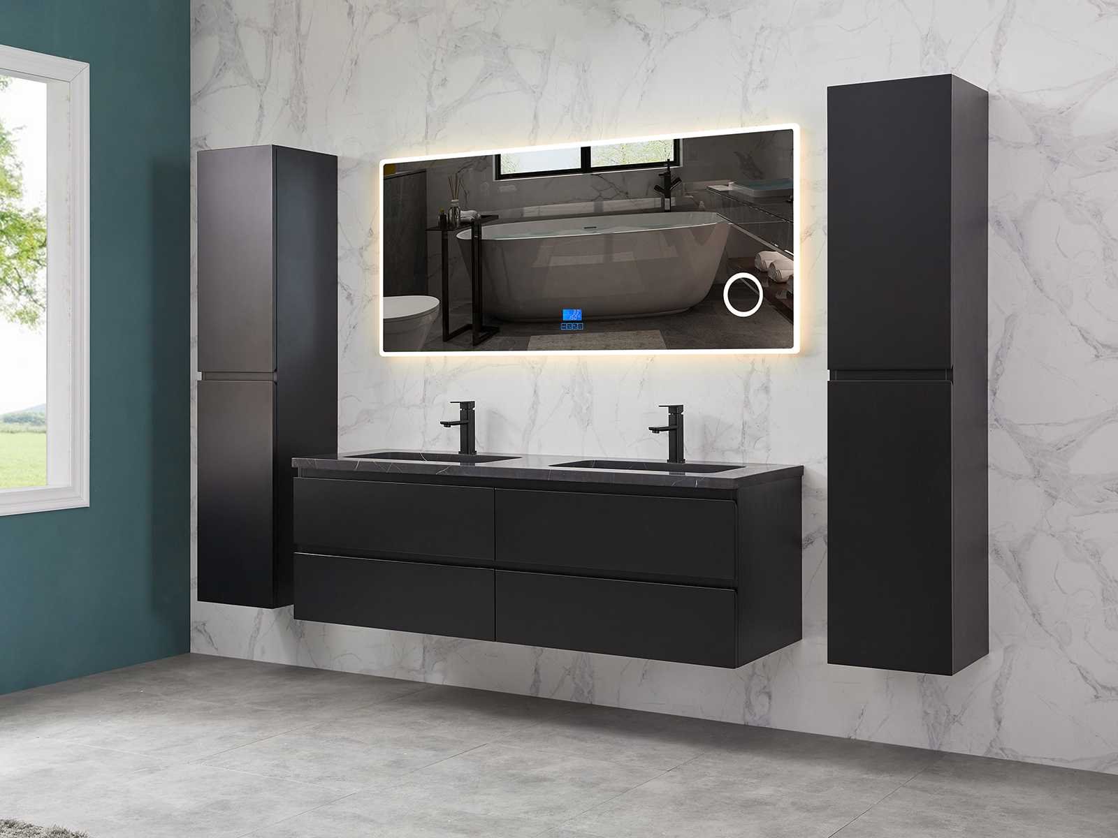 Afmeting meubel bxdxh 160x49x50cm - hangkast 35x35x160cm (1 hangkast zit bij de aankoop), kleur mat zwart, materiaal 2cm 5-laags multiplex(zeer sterk en vochtbestendig),met solid surface topplaat indien gewenst(mat wit of mat zwart), Hangkast softclose deuren en extra planchets (hangkast is universeel en kan zowel links als rechts naast het meubel gehangen worden), kranen exclusief , Lades 4 stuks met softclose, Wasbakken solid surface, natuursteen(met en zonder kraangaten beschikbaar de vaste wastafels) of italiaans marmer (keuze uit diverse modellen en kleuren van de laatste foto's graag doorgeven op afhaaldag), led spiegel met verwarming/radio/klok en vergrootglas met ledverlichting rondom aan de voorkant met 3 verstelbare kleuren led 3000/4500/6000k led-dioden (geel/blauw/wit licht) met de volgende opties digitaal display, geïntegreerde vergrotingsspiegel van 10cm doorsnede met ledverlichting(vergroot 3x), digitale klok, digitale temperatuur aanduiding, 220volt stekker(plug and play), afvoeren exclusief, Conditie: Nieuw in doos, Bijzonderheden 2 jaar garantie, gaten zijn niet in het topblad voorgeboord in u voor deze keuze gaat zodat u zowel muurkranen als kranen vanaf het blad kunt gebruiken of zelf 1 wastafel in plaats van 2 stuks(gaten boren is geen enkel probleem en zeer gemakkelijk uit te voeren bij solid surface) compleet met installatiekit, natuursteen wastafels zijn behandeld met coating, zeer hoge kwaliteit, let op! de hangkast mag geruild worden voor een set kranen en popup afvoeren naar keus of als u een extra hangkast nodig graag op de afhaaldag aangeven voor een passende aanbieding Merk: Mawialux Model: Brandon Hoogte: 50cm Lengte: 49cm Breedte: 160cm Materiaal: 2cm massief top en 5-laags multiplex(zeer sterk en vochtbestendig) Kleur: Mat zwart Kraan: exclusief Wastafel: diverse keuzes Waskom: diverse keuzes Spiegel met verlichting: ja Verlichting: ja Lades: 4 Softclose: true Bevestigingsmateriaal: true Zijkast: ja 1x