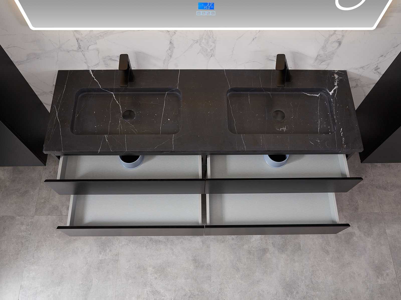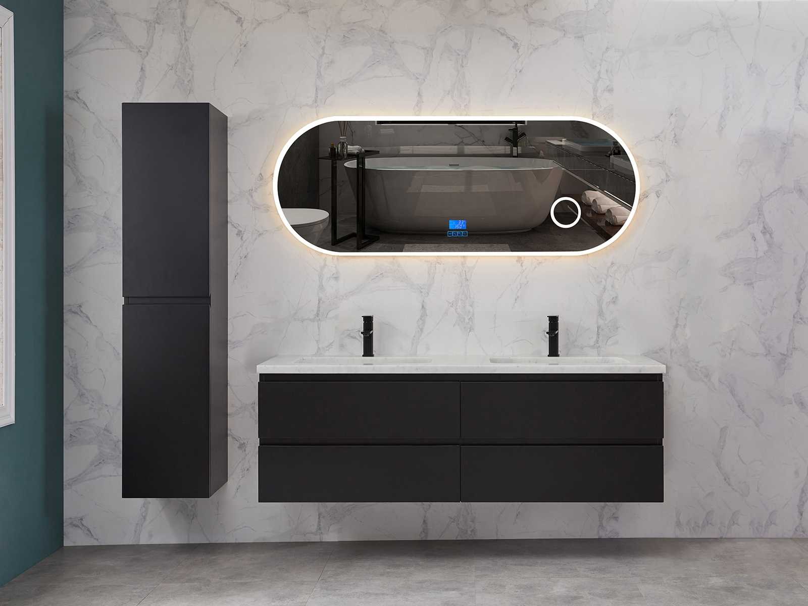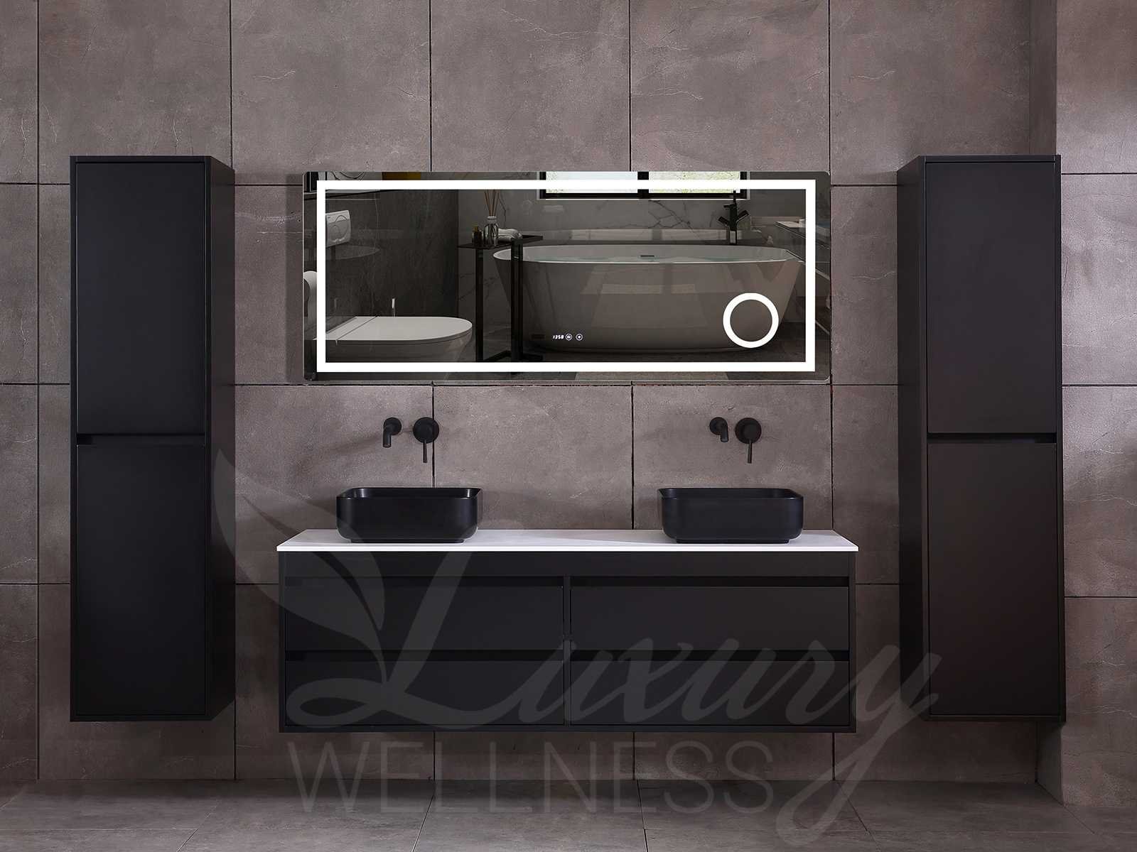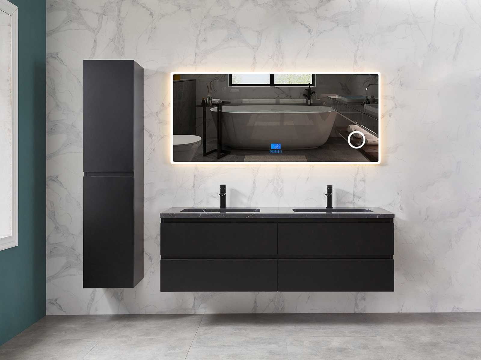 Afmeting meubel bxdxh 160x49x50cm - hangkast 35x35x160cm (1 hangkast zit bij de aankoop), kleur mat zwart, materiaal 2cm 5-laags multiplex(zeer sterk en vochtbestendig),met solid surface topplaat indien gewenst(mat wit of mat zwart), Hangkast softclose deuren en extra planchets (hangkast is universeel en kan zowel links als rechts naast het meubel gehangen worden), kranen exclusief , Lades 4 stuks met softclose, Wasbakken solid surface, natuursteen(met en zonder kraangaten beschikbaar de vaste wastafels) of italiaans marmer (keuze uit diverse modellen en kleuren van de laatste foto's graag doorgeven op afhaaldag), led spiegel met verwarming/radio/klok en vergrootglas met ledverlichting rondom aan de voorkant met 3 verstelbare kleuren led 3000/4500/6000k led-dioden (geel/blauw/wit licht) met de volgende opties digitaal display, geïntegreerde vergrotingsspiegel van 10cm doorsnede met ledverlichting(vergroot 3x), digitale klok, digitale temperatuur aanduiding, 220volt stekker(plug and play), afvoeren exclusief, Conditie: Nieuw in doos, Bijzonderheden 2 jaar garantie, gaten zijn niet in het topblad voorgeboord in u voor deze keuze gaat zodat u zowel muurkranen als kranen vanaf het blad kunt gebruiken of zelf 1 wastafel in plaats van 2 stuks(gaten boren is geen enkel probleem en zeer gemakkelijk uit te voeren bij solid surface) compleet met installatiekit, natuursteen wastafels zijn behandeld met coating, zeer hoge kwaliteit, let op! de hangkast mag geruild worden voor een set kranen en popup afvoeren naar keus of als u een extra hangkast nodig graag op de afhaaldag aangeven voor een passende aanbieding Merk: Mawialux Model: Brandon Hoogte: 50cm Lengte: 49cm Breedte: 160cm Materiaal: 2cm massief top en 5-laags multiplex(zeer sterk en vochtbestendig) Kleur: Mat zwart Kraan: exclusief Wastafel: diverse keuzes Waskom: diverse keuzes Spiegel met verlichting: ja Verlichting: ja Lades: 4 Softclose: true Bevestigingsmateriaal: true Zijkast: ja 1x