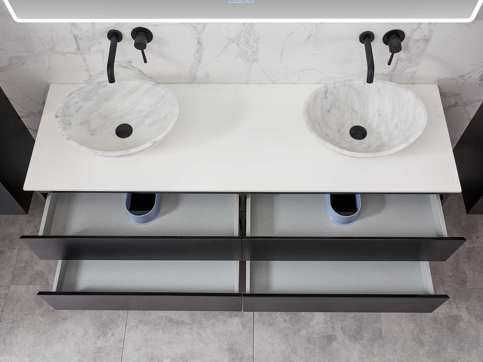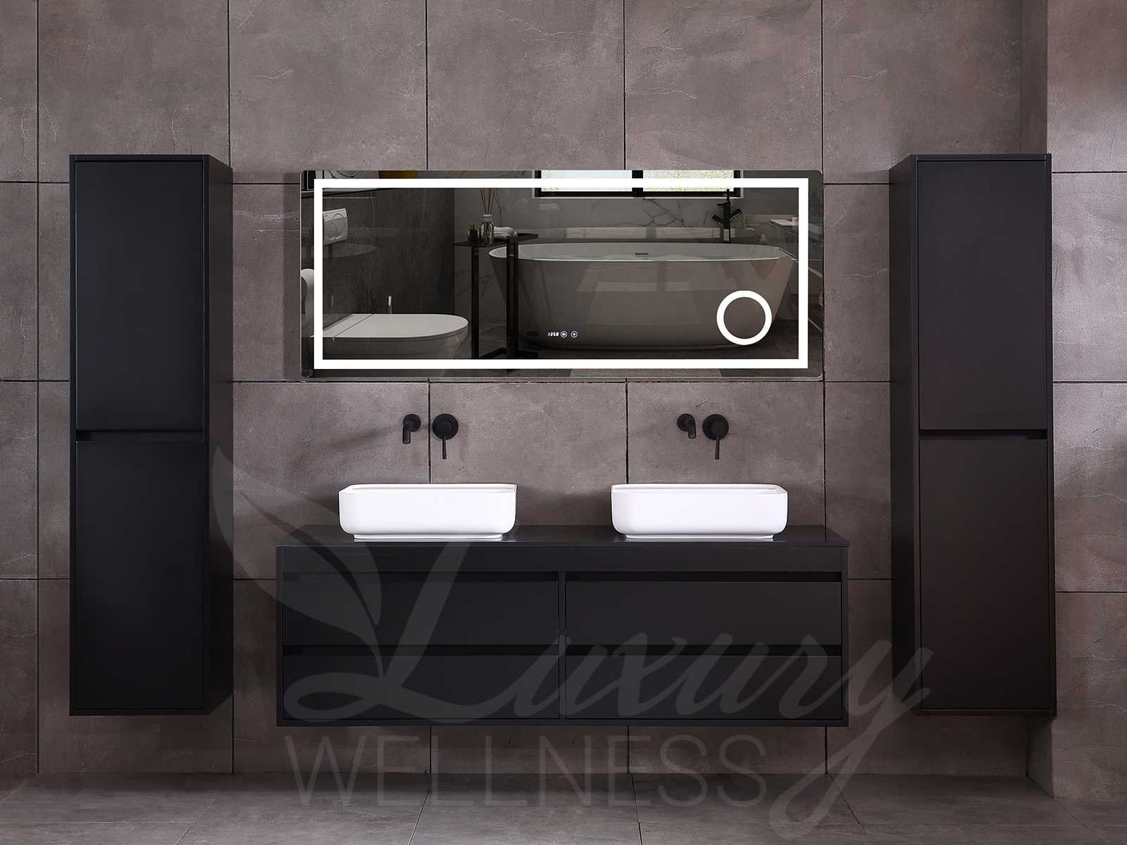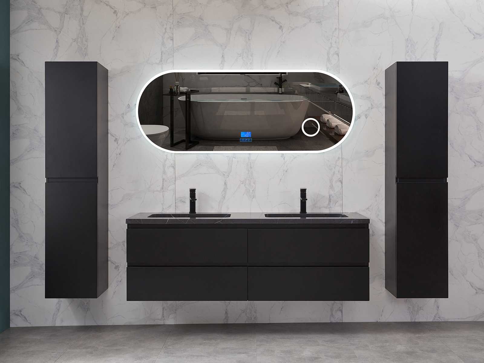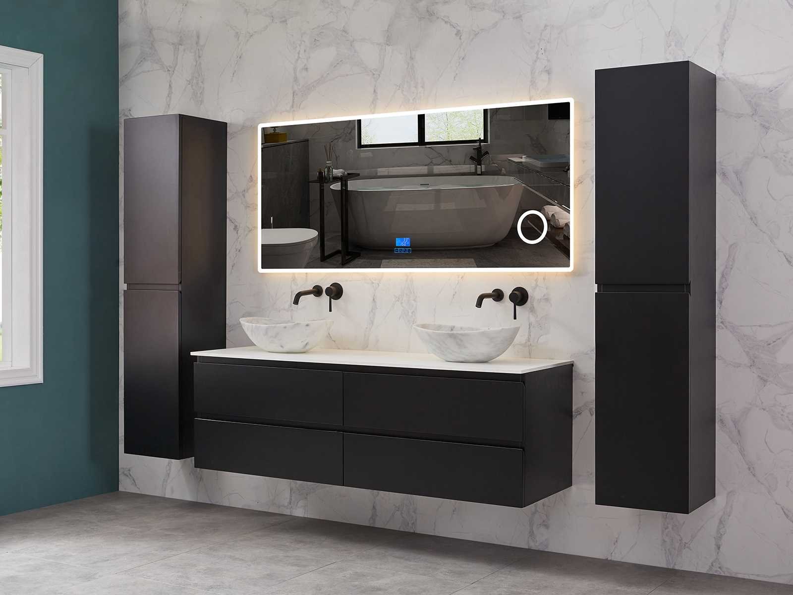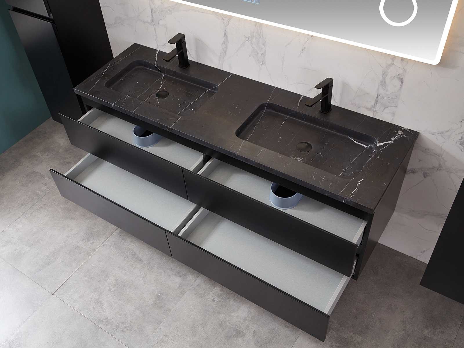 Afmeting meubel bxdxh 160x49x50cm - hangkast 35x35x160cm (1 hangkast zit bij de aankoop), kleur mat zwart, materiaal 2cm 5-laags multiplex(zeer sterk en vochtbestendig),met solid surface topplaat indien gewenst(mat wit of mat zwart), Hangkast softclose deuren en extra planchets (hangkast is universeel en kan zowel links als rechts naast het meubel gehangen worden), kranen exclusief , Lades 4 stuks met softclose, Wasbakken solid surface, natuursteen(met en zonder kraangaten beschikbaar de vaste wastafels) of italiaans marmer (keuze uit diverse modellen en kleuren van de laatste foto's graag doorgeven op afhaaldag), led spiegel met verwarming/radio/klok en vergrootglas met ledverlichting rondom aan de voorkant met 3 verstelbare kleuren led 3000/4500/6000k led-dioden (geel/blauw/wit licht) met de volgende opties digitaal display, geïntegreerde vergrotingsspiegel van 10cm doorsnede met ledverlichting(vergroot 3x), digitale klok, digitale temperatuur aanduiding, 220volt stekker(plug and play), afvoeren exclusief, Conditie: Nieuw in doos, Bijzonderheden 2 jaar garantie, gaten zijn niet in het topblad voorgeboord in u voor deze keuze gaat zodat u zowel muurkranen als kranen vanaf het blad kunt gebruiken of zelf 1 wastafel in plaats van 2 stuks(gaten boren is geen enkel probleem en zeer gemakkelijk uit te voeren bij solid surface) compleet met installatiekit, natuursteen wastafels zijn behandeld met coating, zeer hoge kwaliteit, let op! de hangkast mag geruild worden voor een set kranen en popup afvoeren naar keus of als u een extra hangkast nodig graag op de afhaaldag aangeven voor een passende aanbieding Merk: Mawialux Model: Brandon Hoogte: 50cm Lengte: 49cm Breedte: 160cm Materiaal: 2cm massief top en 5-laags multiplex(zeer sterk en vochtbestendig) Kleur: Mat zwart Kraan: exclusief Wastafel: diverse keuzes Waskom: diverse keuzes Spiegel met verlichting: ja Verlichting: ja Lades: 4 Softclose: true Bevestigingsmateriaal: true Zijkast: ja 1x