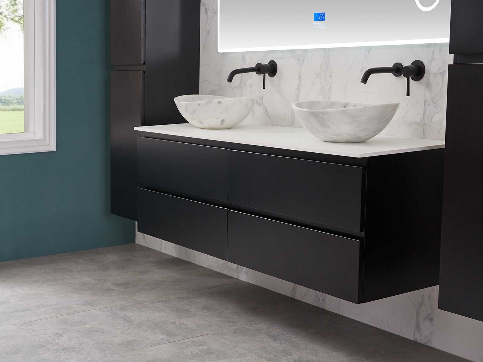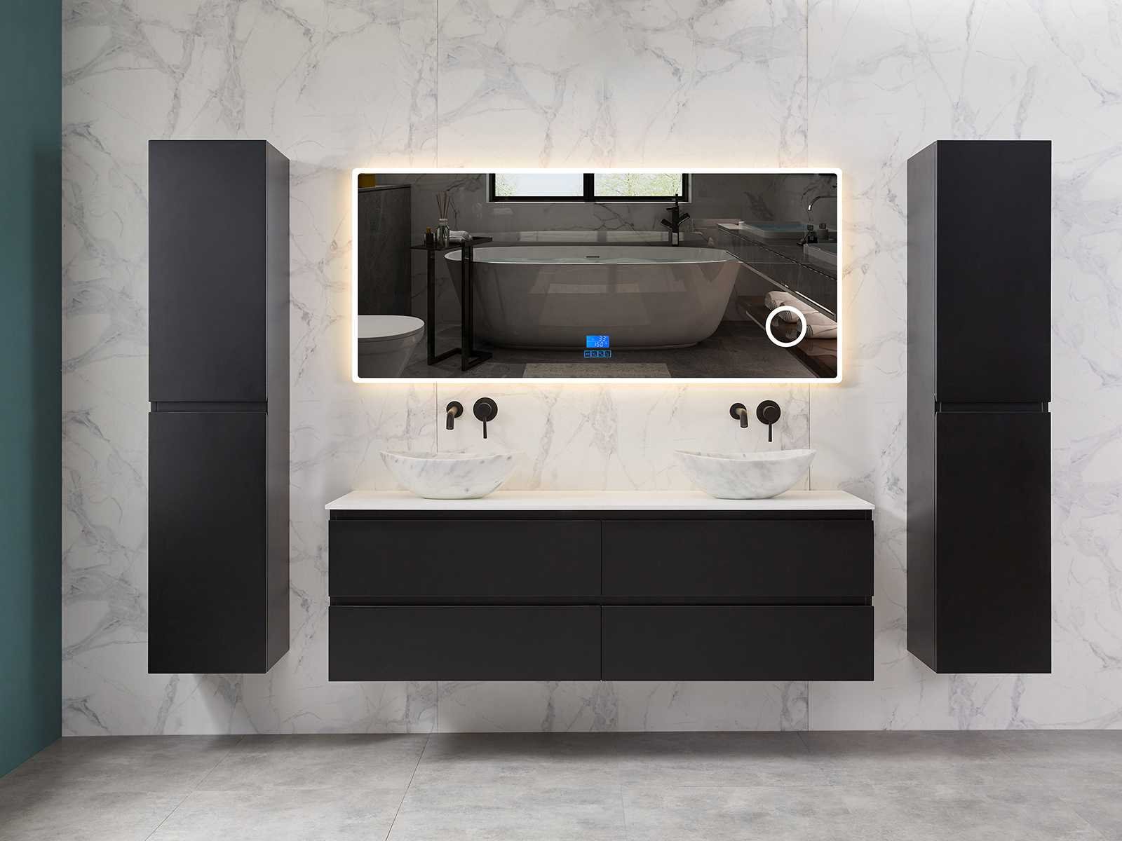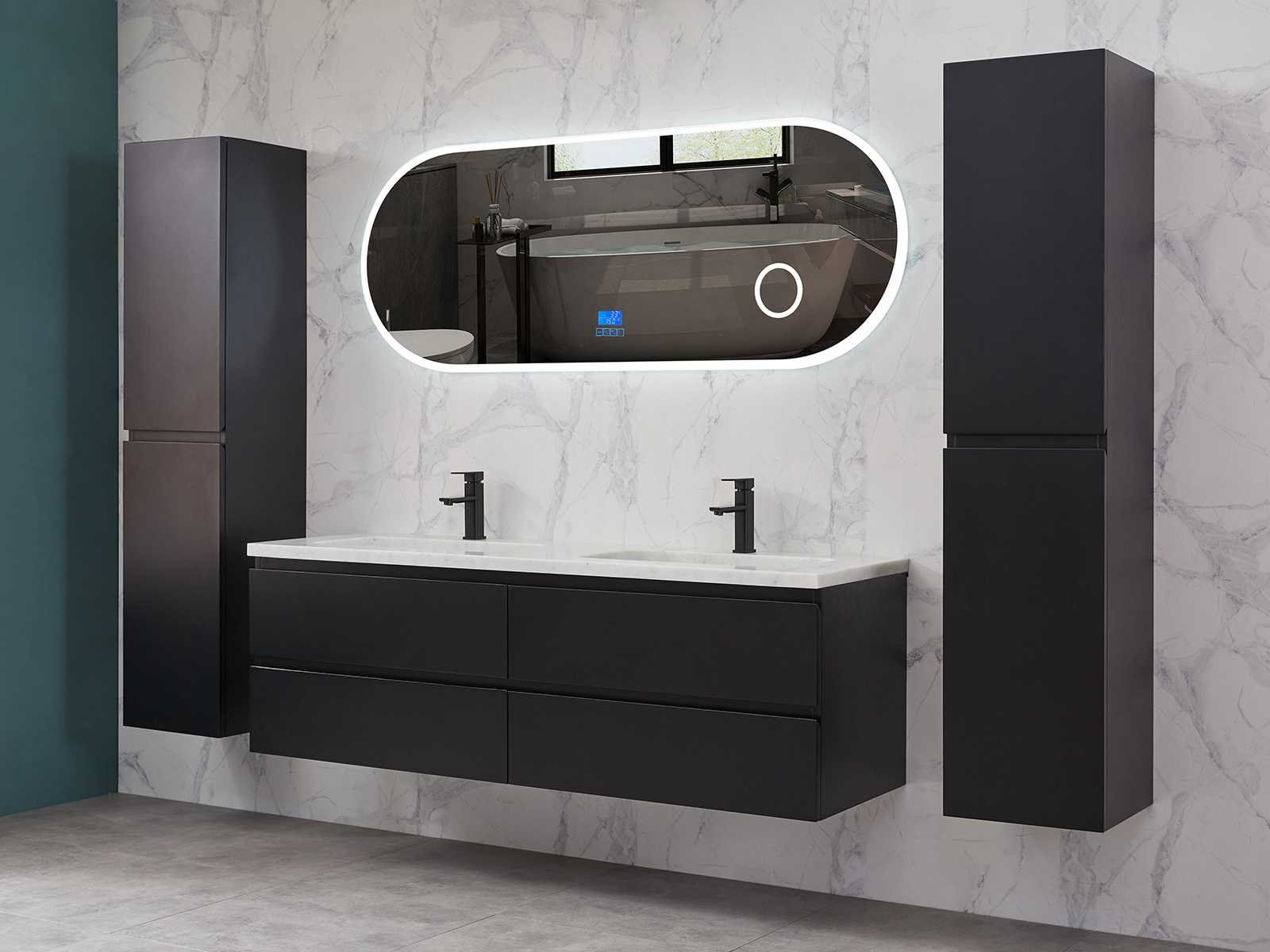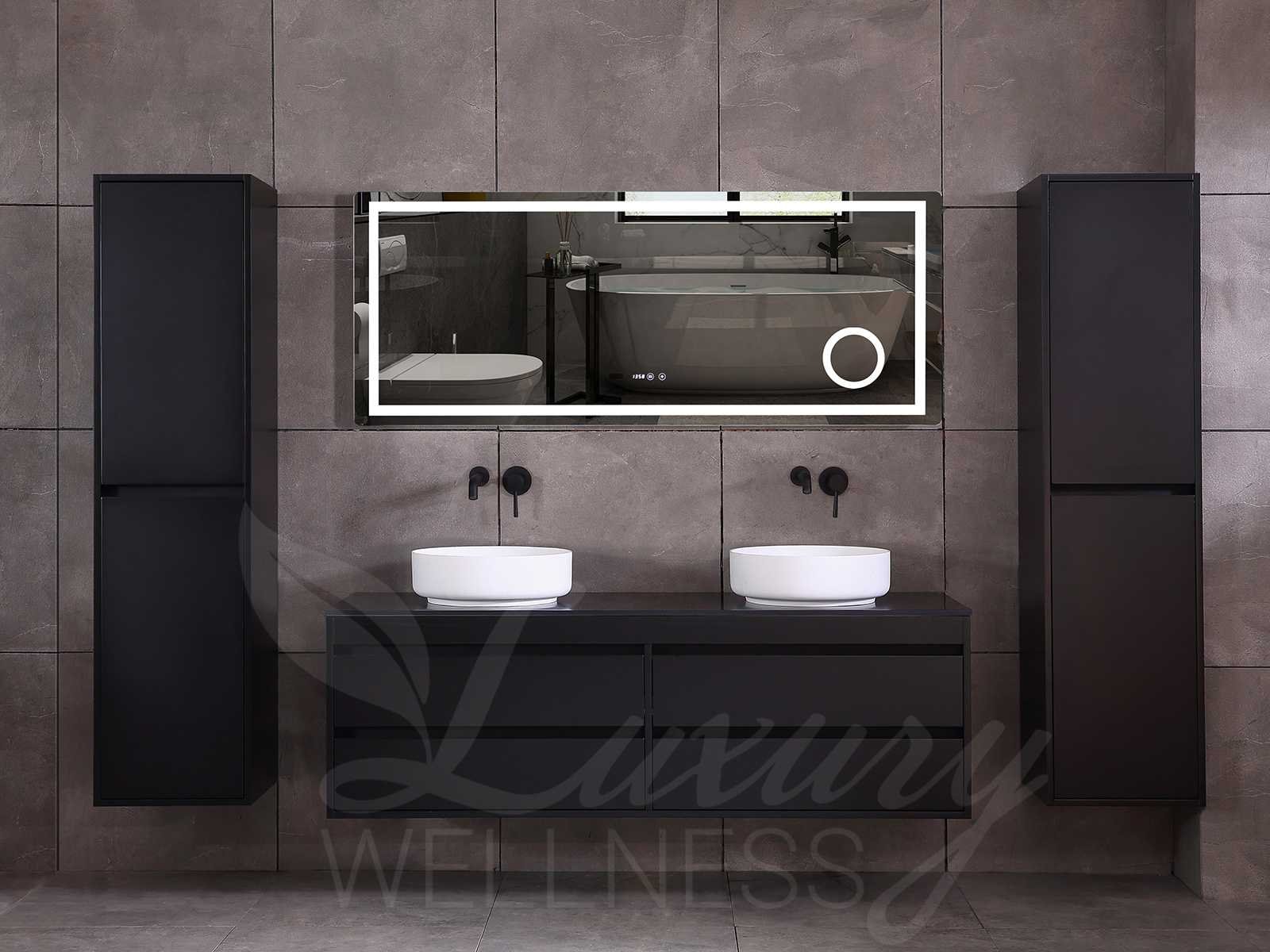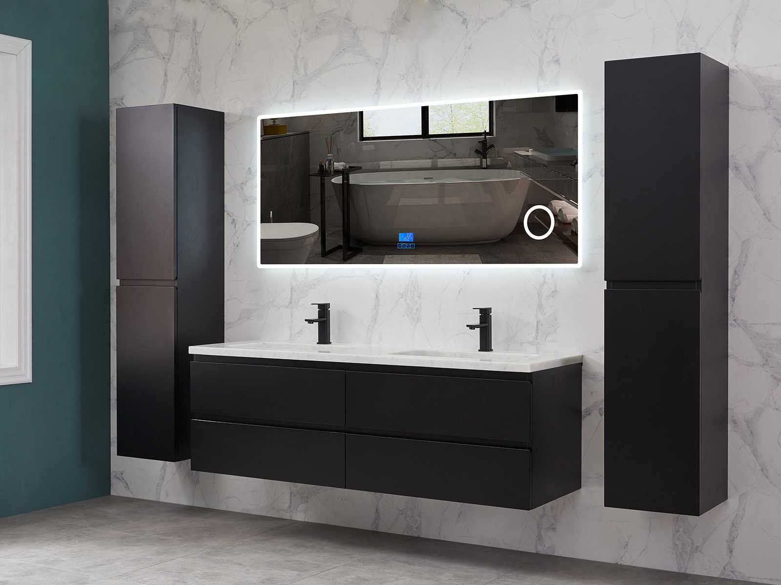 Afmeting meubel bxdxh 160x49x50cm - hangkast 35x35x160cm (1 hangkast zit bij de aankoop), kleur mat zwart, materiaal 2cm 5-laags multiplex(zeer sterk en vochtbestendig),met solid surface topplaat indien gewenst(mat wit of mat zwart), Hangkast softclose deuren en extra planchets (hangkast is universeel en kan zowel links als rechts naast het meubel gehangen worden), kranen exclusief , Lades 4 stuks met softclose, Wasbakken solid surface, natuursteen(met en zonder kraangaten beschikbaar de vaste wastafels) of italiaans marmer (keuze uit diverse modellen en kleuren van de laatste foto's graag doorgeven op afhaaldag), led spiegel met verwarming/radio/klok en vergrootglas met ledverlichting rondom aan de voorkant met 3 verstelbare kleuren led 3000/4500/6000k led-dioden (geel/blauw/wit licht) met de volgende opties digitaal display, geïntegreerde vergrotingsspiegel van 10cm doorsnede met ledverlichting(vergroot 3x), digitale klok, digitale temperatuur aanduiding, 220volt stekker(plug and play), afvoeren exclusief, Conditie: Nieuw in doos, Bijzonderheden 2 jaar garantie, gaten zijn niet in het topblad voorgeboord in u voor deze keuze gaat zodat u zowel muurkranen als kranen vanaf het blad kunt gebruiken of zelf 1 wastafel in plaats van 2 stuks(gaten boren is geen enkel probleem en zeer gemakkelijk uit te voeren bij solid surface) compleet met installatiekit, natuursteen wastafels zijn behandeld met coating, zeer hoge kwaliteit, let op! de hangkast mag geruild worden voor een set kranen en popup afvoeren naar keus of als u een extra hangkast nodig graag op de afhaaldag aangeven voor een passende aanbieding Merk: Mawialux Model: Brandon Hoogte: 50cm Lengte: 49cm Breedte: 160cm Materiaal: 2cm massief top en 5-laags multiplex(zeer sterk en vochtbestendig) Kleur: Mat zwart Kraan: exclusief Wastafel: diverse keuzes Waskom: diverse keuzes Spiegel met verlichting: ja Verlichting: ja Lades: 4 Softclose: true Bevestigingsmateriaal: true Zijkast: ja 1x