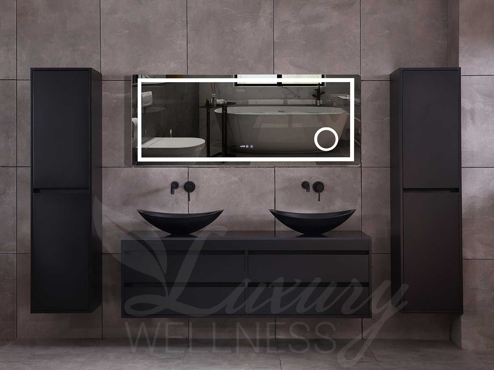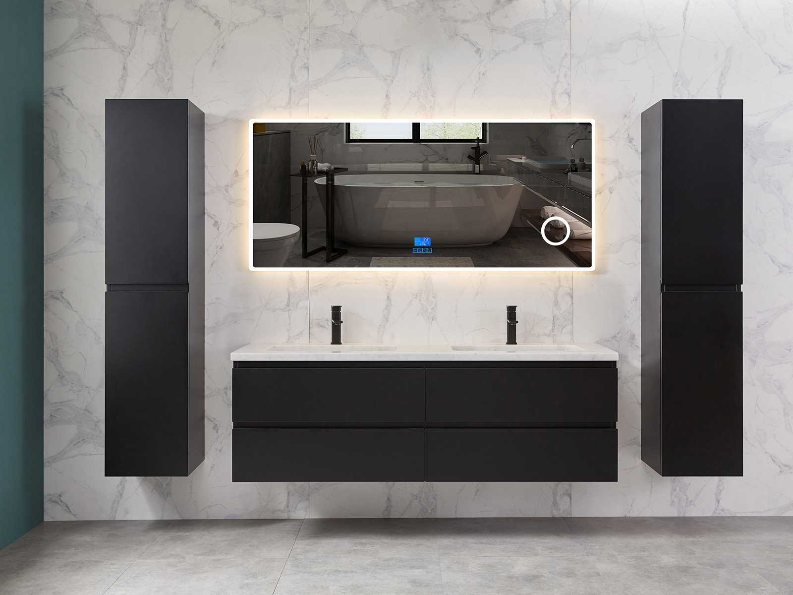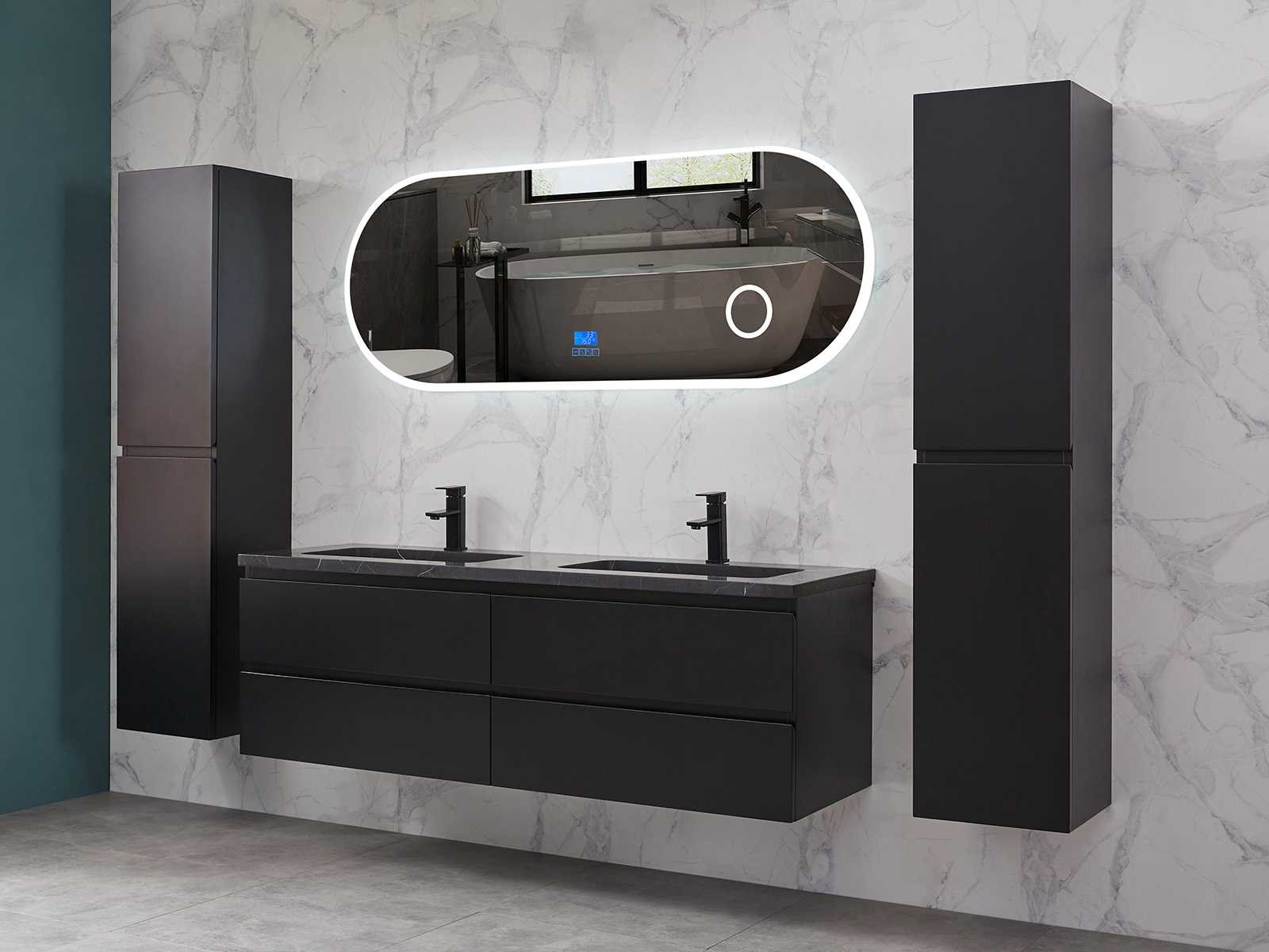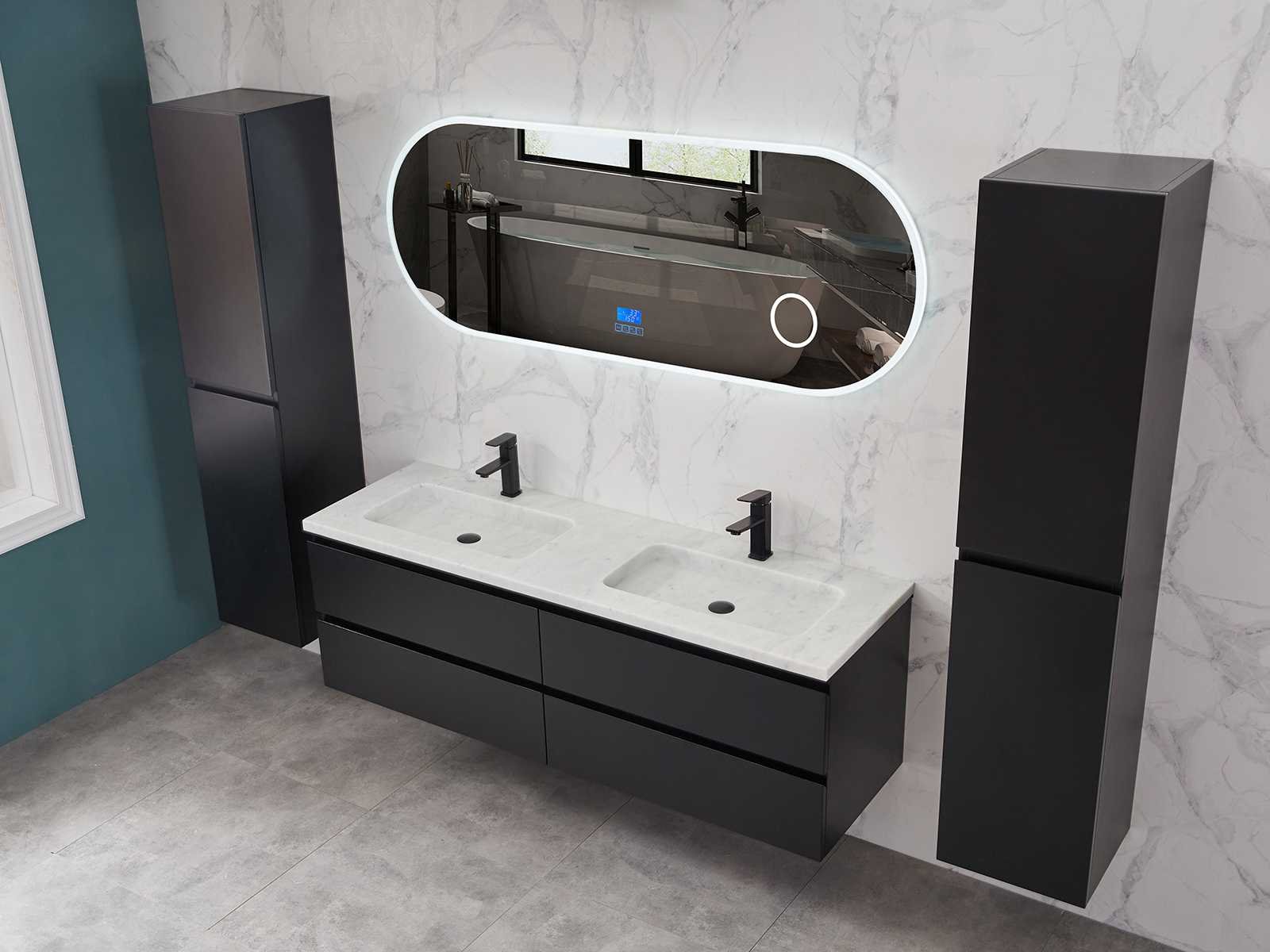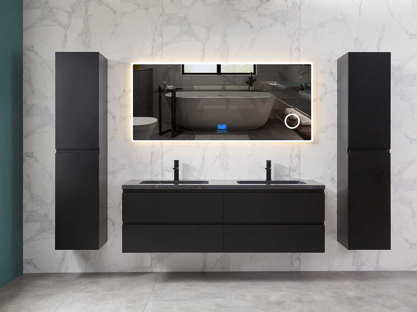 Afmeting meubel bxdxh 160x49x50cm - hangkast 35x35x160cm (1 hangkast zit bij de aankoop), kleur mat zwart, materiaal 2cm 5-laags multiplex(zeer sterk en vochtbestendig),met solid surface topplaat indien gewenst(mat wit of mat zwart), Hangkast softclose deuren en extra planchets (hangkast is universeel en kan zowel links als rechts naast het meubel gehangen worden), kranen exclusief , Lades 4 stuks met softclose, Wasbakken solid surface, natuursteen(met en zonder kraangaten beschikbaar de vaste wastafels) of italiaans marmer (keuze uit diverse modellen en kleuren van de laatste foto's graag doorgeven op afhaaldag), led spiegel met verwarming/radio/klok en vergrootglas met ledverlichting rondom aan de voorkant met 3 verstelbare kleuren led 3000/4500/6000k led-dioden (geel/blauw/wit licht) met de volgende opties digitaal display, geïntegreerde vergrotingsspiegel van 10cm doorsnede met ledverlichting(vergroot 3x), digitale klok, digitale temperatuur aanduiding, 220volt stekker(plug and play), afvoeren exclusief, Conditie: Nieuw in doos, Bijzonderheden 2 jaar garantie, gaten zijn niet in het topblad voorgeboord in u voor deze keuze gaat zodat u zowel muurkranen als kranen vanaf het blad kunt gebruiken of zelf 1 wastafel in plaats van 2 stuks(gaten boren is geen enkel probleem en zeer gemakkelijk uit te voeren bij solid surface) compleet met installatiekit, natuursteen wastafels zijn behandeld met coating, zeer hoge kwaliteit, let op! de hangkast mag geruild worden voor een set kranen en popup afvoeren naar keus of als u een extra hangkast nodig graag op de afhaaldag aangeven voor een passende aanbieding Merk: Mawialux Model: Brandon Hoogte: 50cm Lengte: 49cm Breedte: 160cm Materiaal: 2cm massief top en 5-laags multiplex(zeer sterk en vochtbestendig) Kleur: Mat zwart Kraan: exclusief Wastafel: diverse keuzes Waskom: diverse keuzes Spiegel met verlichting: ja Verlichting: ja Lades: 4 Softclose: true Bevestigingsmateriaal: true Zijkast: ja 1x