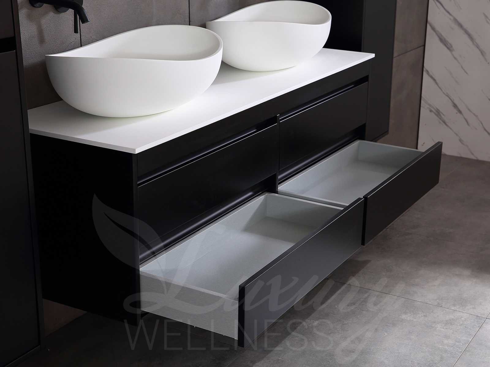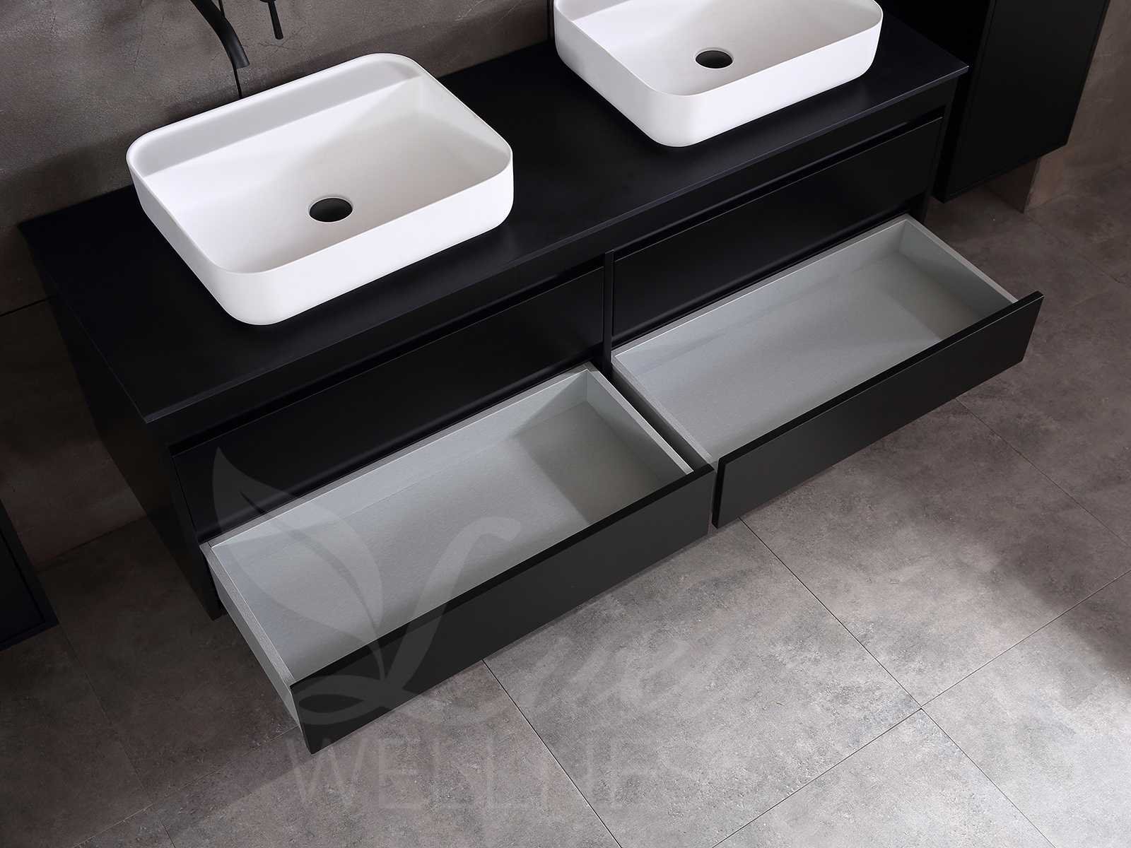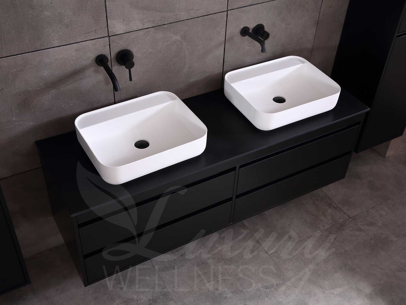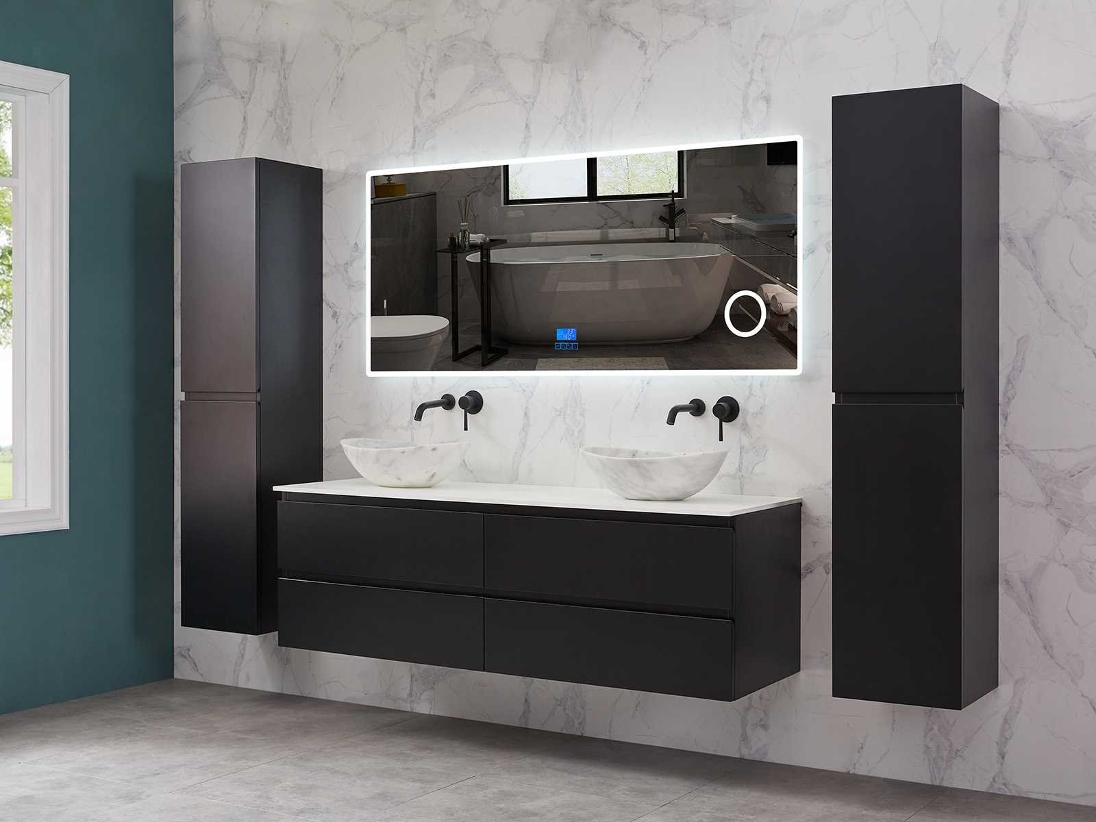Afmeting meubel bxdxh 160x49x50cm - hangkast 35x35x160cm (1 hangkast zit bij de aankoop), kleur mat zwart, materiaal 2cm 5-laags multiplex(zeer sterk en vochtbestendig),met solid surface topplaat indien gewenst(mat wit of mat zwart), Hangkast softclose deuren en extra planchets (hangkast is universeel en kan zowel links als rechts naast het meubel gehangen worden), kranen exclusief , Lades 4 stuks met softclose, Wasbakken solid surface, natuursteen(met en zonder kraangaten beschikbaar de vaste wastafels) of italiaans marmer (keuze uit diverse modellen en kleuren van de laatste foto's graag doorgeven op afhaaldag), led spiegel met verwarming/radio/klok en vergrootglas met ledverlichting rondom aan de voorkant met 3 verstelbare kleuren led 3000/4500/6000k led-dioden (geel/blauw/wit licht) met de volgende opties digitaal display, geïntegreerde vergrotingsspiegel van 10cm doorsnede met ledverlichting(vergroot 3x), digitale klok, digitale temperatuur aanduiding, 220volt stekker(plug and play), afvoeren exclusief, Conditie: Nieuw in doos, Bijzonderheden 2 jaar garantie, gaten zijn niet in het topblad voorgeboord in u voor deze keuze gaat zodat u zowel muurkranen als kranen vanaf het blad kunt gebruiken of zelf 1 wastafel in plaats van 2 stuks(gaten boren is geen enkel probleem en zeer gemakkelijk uit te voeren bij solid surface) compleet met installatiekit, natuursteen wastafels zijn behandeld met coating, zeer hoge kwaliteit, let op! de hangkast mag geruild worden voor een set kranen en popup afvoeren naar keus of als u een extra hangkast nodig graag op de afhaaldag aangeven voor een passende aanbieding Merk: Mawialux Model: Brandon Hoogte: 50cm Lengte: 49cm Breedte: 160cm Materiaal: 2cm massief top en 5-laags multiplex(zeer sterk en vochtbestendig) Kleur: Mat zwart Kraan: exclusief Wastafel: diverse keuzes Waskom: diverse keuzes Spiegel met verlichting: ja Verlichting: ja Lades: 4 Softclose: true Bevestigingsmateriaal: true Zijkast: ja 1x
