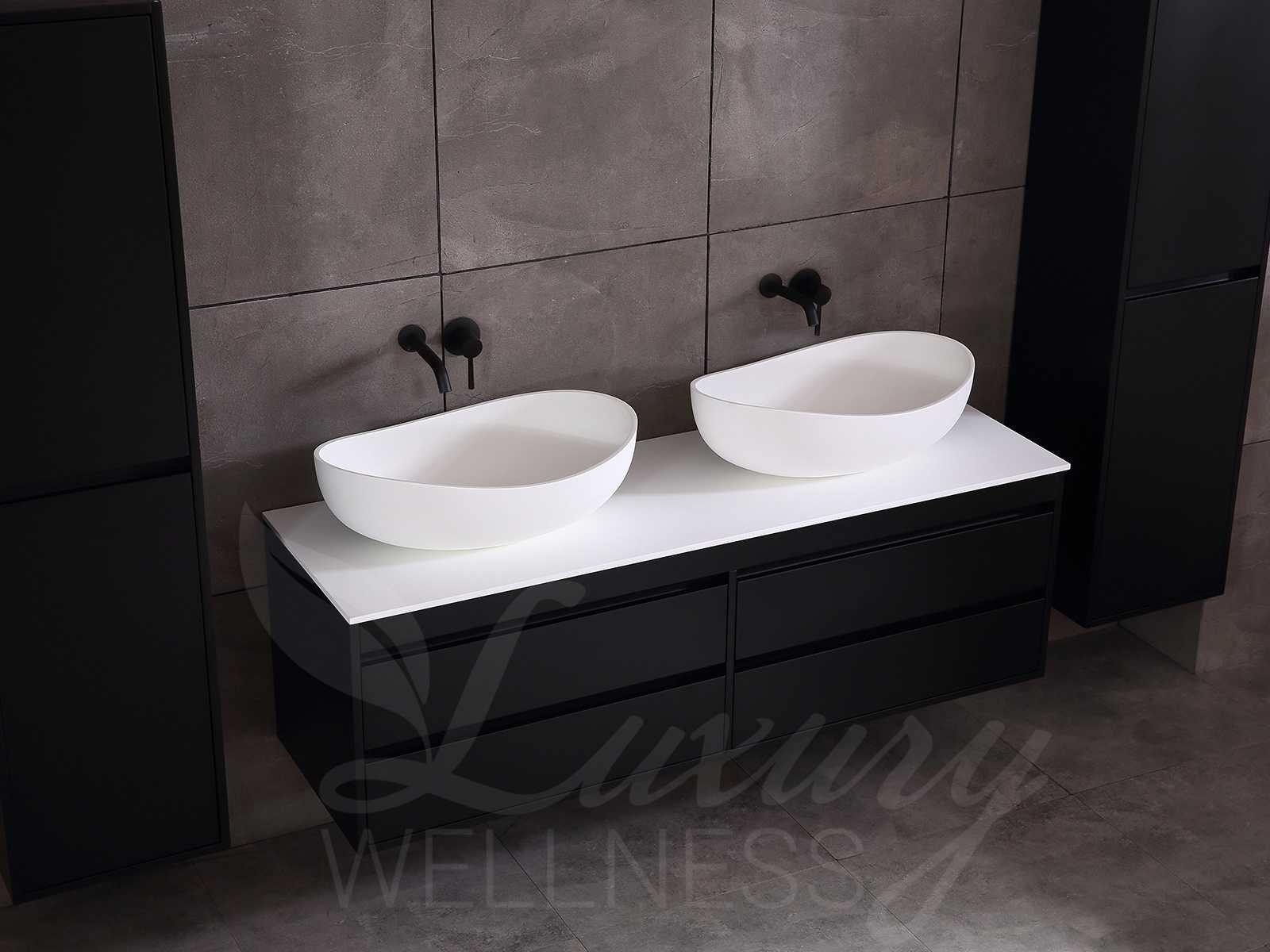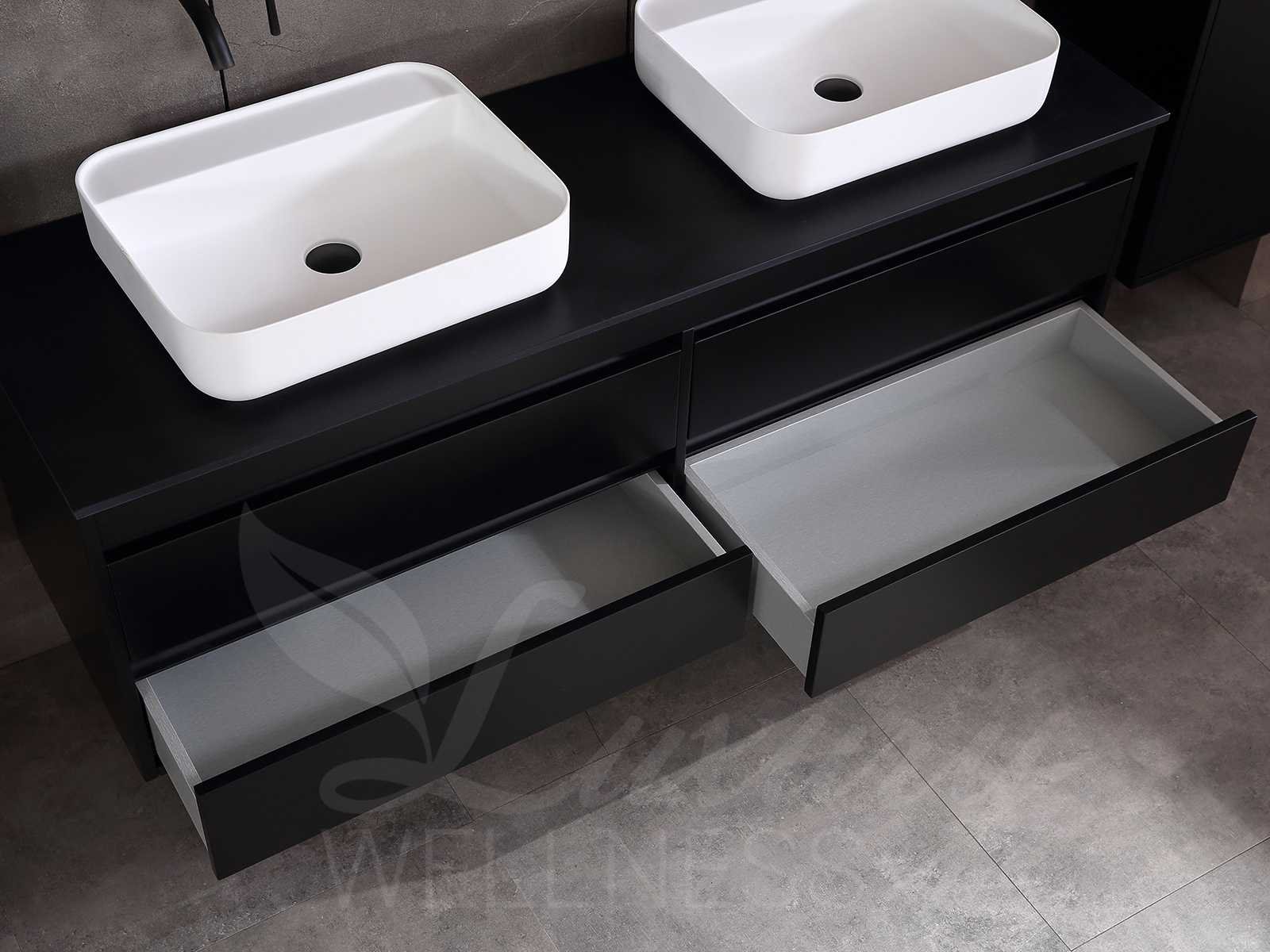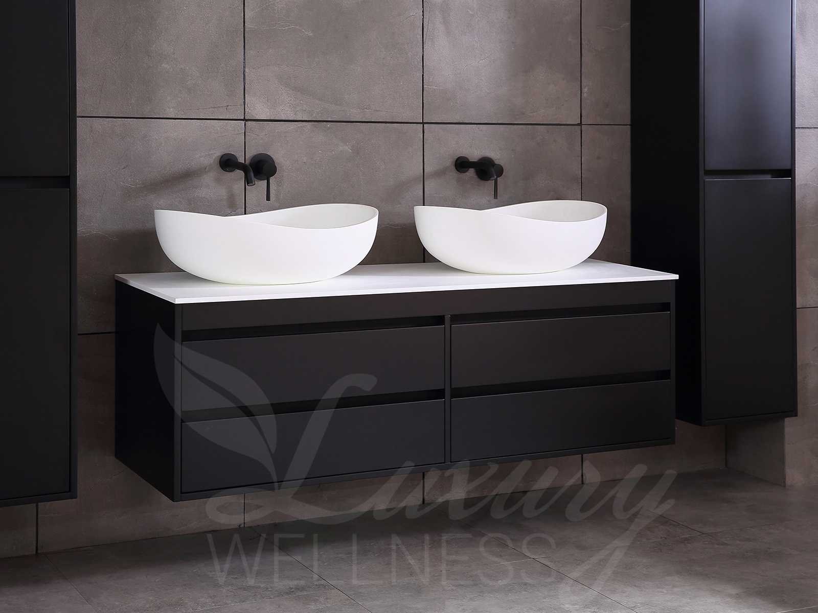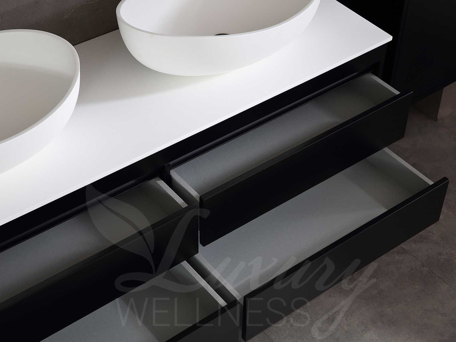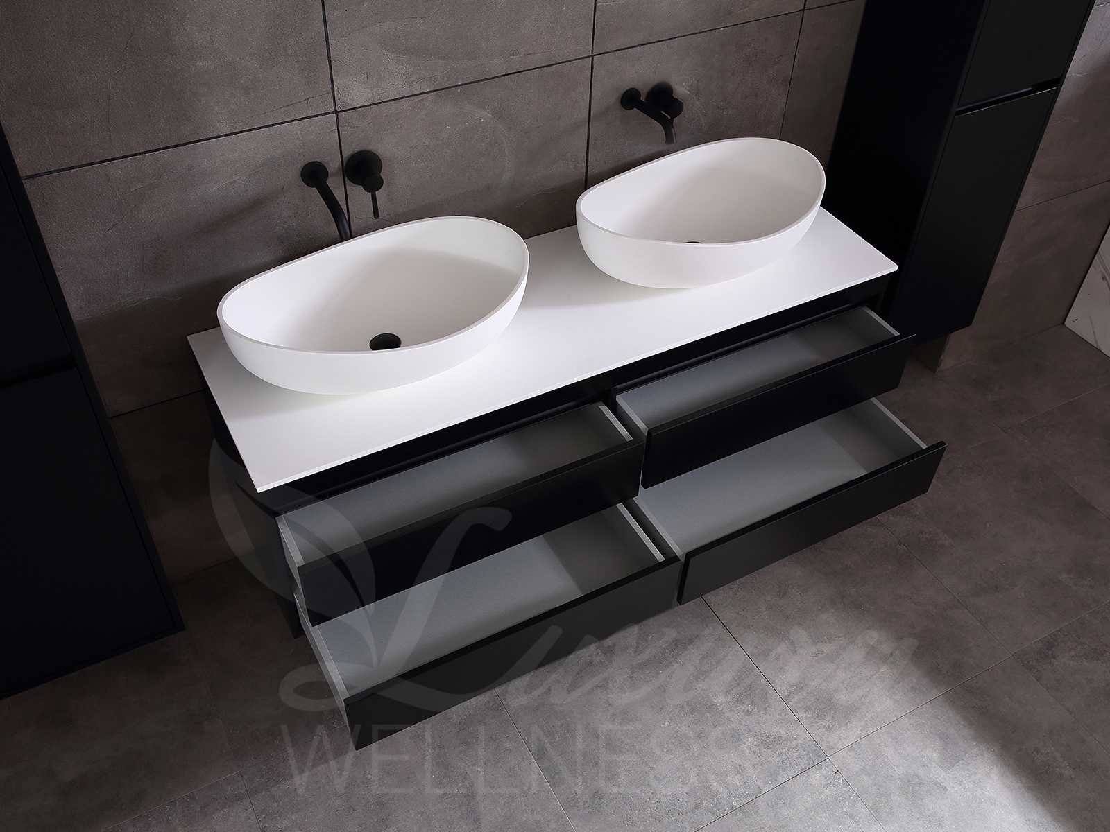 Afmeting meubel bxdxh 160x49x50cm - hangkast 35x35x160cm (1 hangkast zit bij de aankoop), kleur mat zwart, materiaal 2cm 5-laags multiplex(zeer sterk en vochtbestendig),met solid surface topplaat indien gewenst(mat wit of mat zwart), Hangkast softclose deuren en extra planchets (hangkast is universeel en kan zowel links als rechts naast het meubel gehangen worden), kranen exclusief , Lades 4 stuks met softclose, Wasbakken solid surface, natuursteen(met en zonder kraangaten beschikbaar de vaste wastafels) of italiaans marmer (keuze uit diverse modellen en kleuren van de laatste foto's graag doorgeven op afhaaldag), led spiegel met verwarming/radio/klok en vergrootglas met ledverlichting rondom aan de voorkant met 3 verstelbare kleuren led 3000/4500/6000k led-dioden (geel/blauw/wit licht) met de volgende opties digitaal display, geïntegreerde vergrotingsspiegel van 10cm doorsnede met ledverlichting(vergroot 3x), digitale klok, digitale temperatuur aanduiding, 220volt stekker(plug and play), afvoeren exclusief, Conditie: Nieuw in doos, Bijzonderheden 2 jaar garantie, gaten zijn niet in het topblad voorgeboord in u voor deze keuze gaat zodat u zowel muurkranen als kranen vanaf het blad kunt gebruiken of zelf 1 wastafel in plaats van 2 stuks(gaten boren is geen enkel probleem en zeer gemakkelijk uit te voeren bij solid surface) compleet met installatiekit, natuursteen wastafels zijn behandeld met coating, zeer hoge kwaliteit, let op! de hangkast mag geruild worden voor een set kranen en popup afvoeren naar keus of als u een extra hangkast nodig graag op de afhaaldag aangeven voor een passende aanbieding Merk: Mawialux Model: Brandon Hoogte: 50cm Lengte: 49cm Breedte: 160cm Materiaal: 2cm massief top en 5-laags multiplex(zeer sterk en vochtbestendig) Kleur: Mat zwart Kraan: exclusief Wastafel: diverse keuzes Waskom: diverse keuzes Spiegel met verlichting: ja Verlichting: ja Lades: 4 Softclose: true Bevestigingsmateriaal: true Zijkast: ja 1x