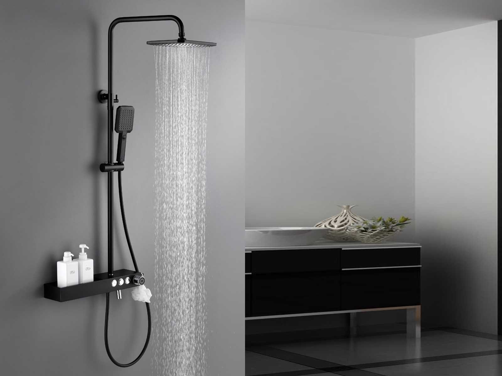 De doucheset is uitgerust met drie functies. De hoofddouche, handdouche (met twee standen) en een baduitloop. Deze functies worden afzonderlijk van elkaar gebruikt doormiddel van drukknoppen. Door de aanwezigheid van de baduitloop is deze doucheset ook geschikt voor douchebaden. De doucheset beschikt over keramische binnenwerken zodat je jarenlang plezier zult hebben van jouw regendoucheset. Doordat de doucheset in hoogte verstelbaar is past hij in vrijwel elke badkamer! De hartafstand van deze doucheset is 15cm. Materiaal: messing. Kleur: mat zwart (met chrome toetsen en baduitloop). Kraan: thermostaatkraan. Binnenwerk: keramisch. Douchekop: 26 x 20 cm. Handdouche: met 2 waterfuncties en doucheslang. In hoogte en draairichting verstelbare ophanging. Hoogte: verstelbaar. Voorzien van: 3 druktoetsen waarmee de 3 waterfuncties bediend kunnen worden. Douchekop met kunststof wateruitlopen om gemakkelijk kalkaanslag te verwijderen. Douchekop kantel en draaibaar. Keramisch binnenwerk. Bijzonderheden: h.o.h. afstand van 150mm. Merk: Mawialux Model: Anto Kleur: mat zwart/chroom