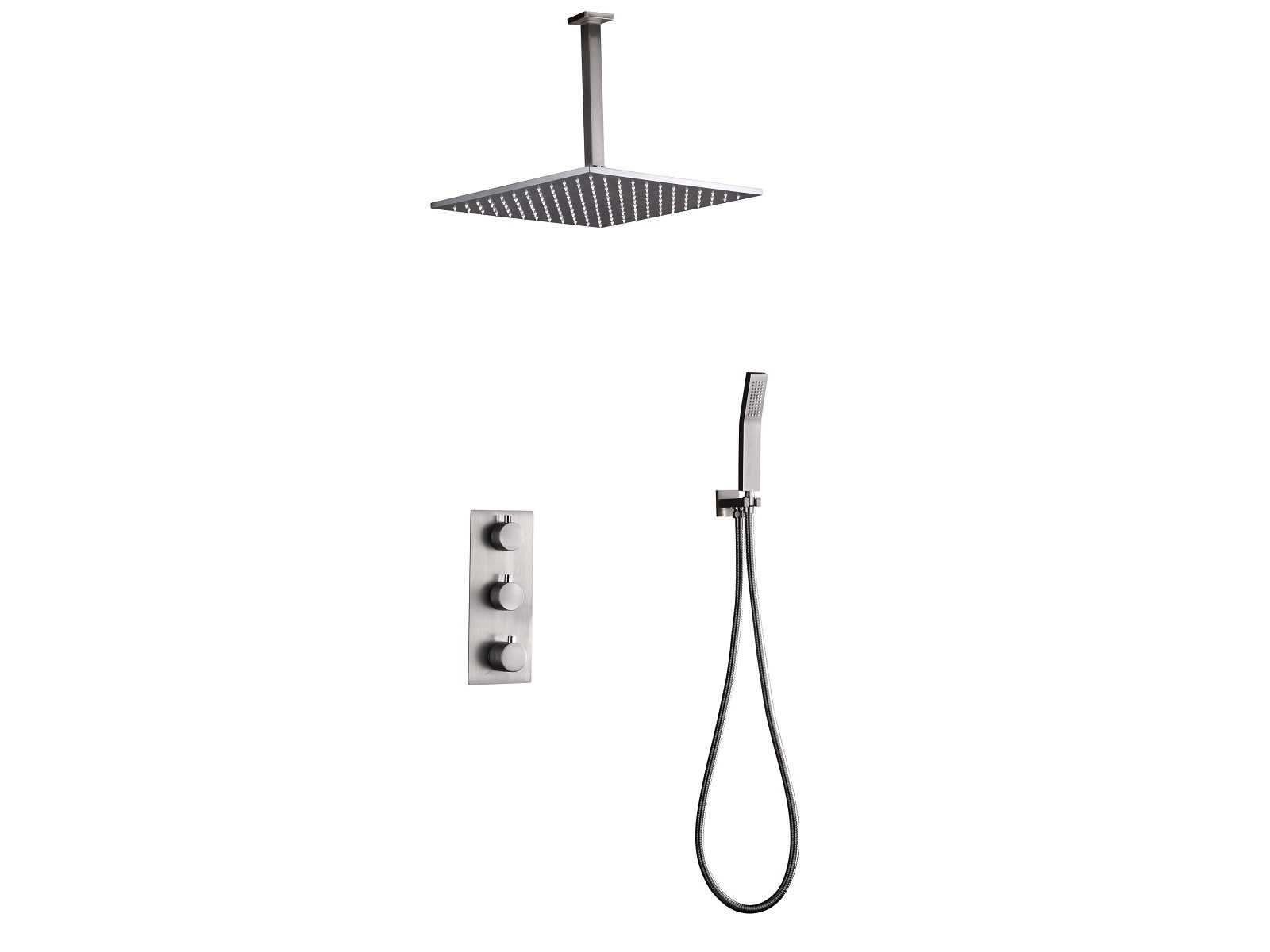 Keuze uit 2 kleuren: chroom of geborsteld RVS (kleurkeuze graag aangeven op de afhaaldag) materiaal messing , smart control thermostaatkraan, binnenwerk keramisch, douchekop 40x40 cm, handdouche verstelbaar met doucheslang en ophanging van messing, douchekop met kunststof wateruitlopen om gemakkelijk kalkaanslag te verwijderen, douchekop kantel en draaibaar, dit betreft een nieuw product in verpakking Merk: Mawialux Model: Hake Kleur: keuze