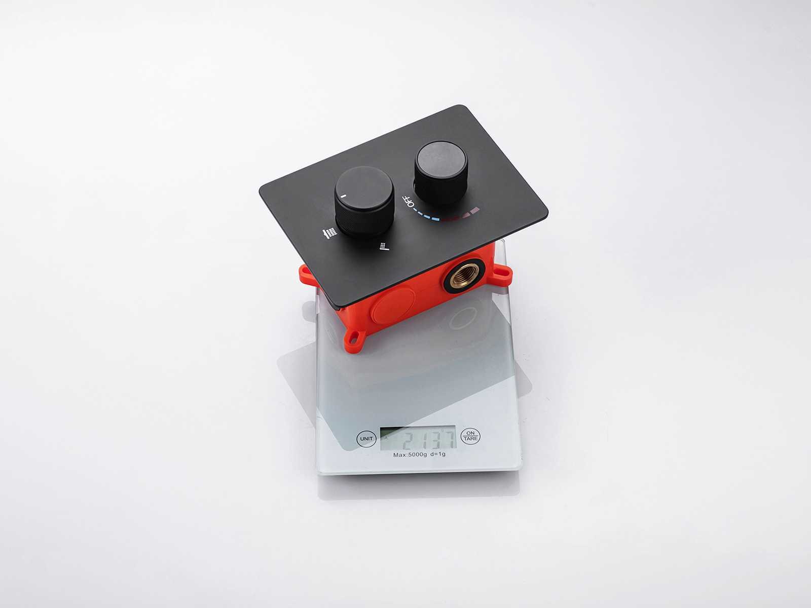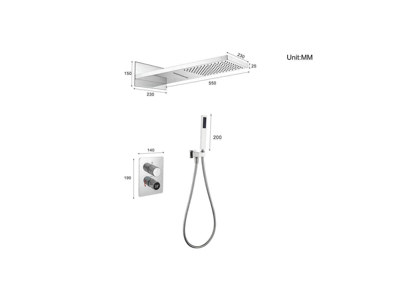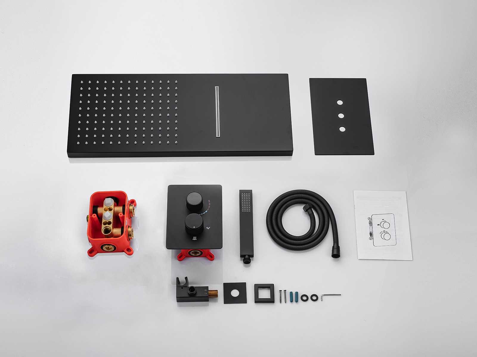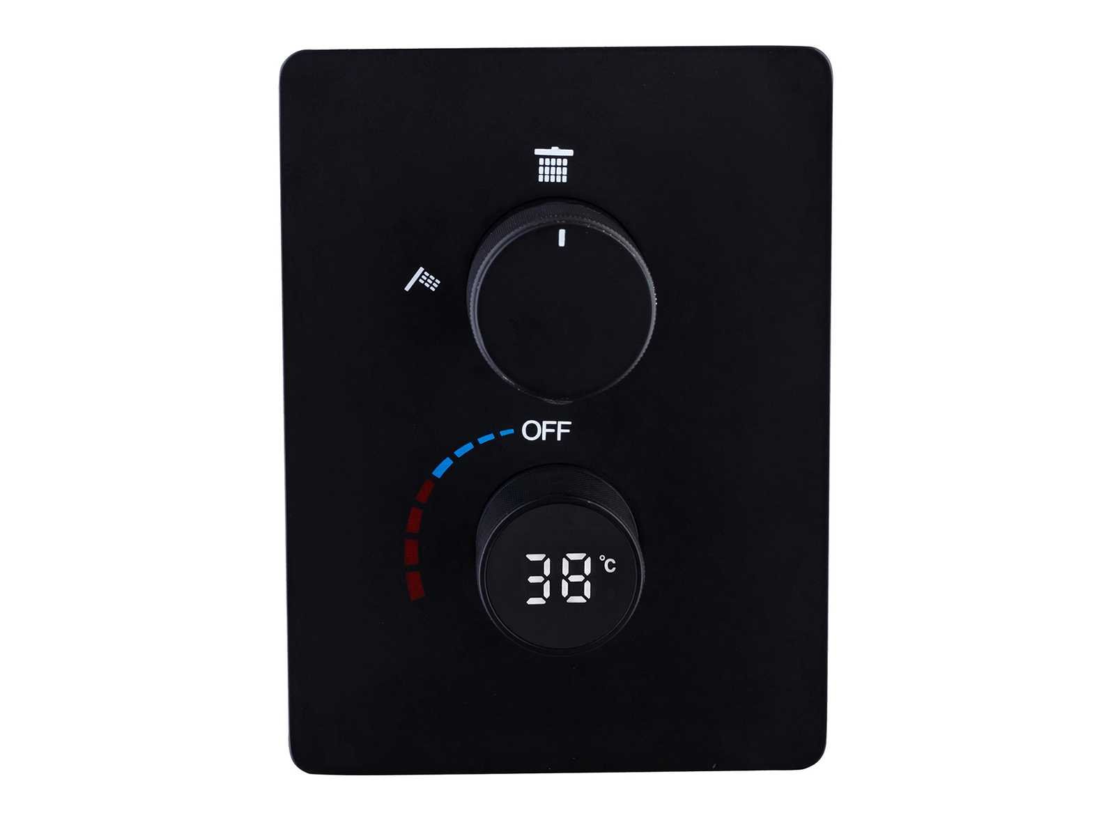 Kleurkeuze in 3 kleuren: Mat zwart of gunmetal grey(kleurkeuze op afhaaldag aangeven), materiaal messing en 304 rvs, mengkraan, binnenwerk keramisch, douchekop L55xB23cm, handdouche verstelbaar met doucheslang en ophanging van messing, douchekop met 2 waterfuncties (waterval en regendouche) met kunststof wateruitlopen, voorzien van digitale micromotor aansturing door middel van waterflow, geen stroom nodig, temperatuur digitaal afleesbaar, digitale aanduiding tijdsduur, anti kalk behandeld, messing muurplaat, met inbouwbox voor makkelijke installatie, dit betreft een nieuw product in verpakking Merk: Mawialux Model: Jayden