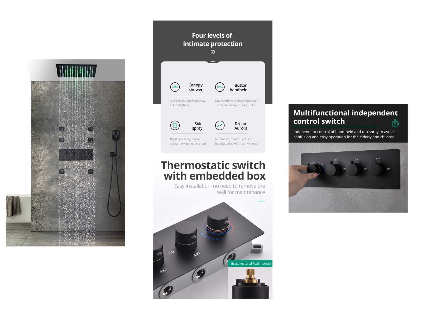 Materiaal messing en 304 rvs, kleur mat zwart, smart control thermostaatkraan met 3 regelknoppen, binnenwerk keramisch, douchekop 50x36 cm uit 304 rvs en 6 stuks ledverlichting, handdouche verstelbaar met 2 functies en doucheslang met draaibare messing ophanging, voorzien van 4 stuks messing massagejets van 10cm doorsnee (draaibaar), grote douchekop met kunststof wateruitlopen om gemakkelijk kalkaanslag te verwijderen, keramisch binnenwerk, werking temperatuur 0 tot 90 graden celsius, anti kalk behandelddouchekop en handdouche en massagejets kunnen allemaal tegelijk of onafzondelijk gebruikt/geregeld worden Merk: Mawialux Model: Boxer Kleur: mat zwart
