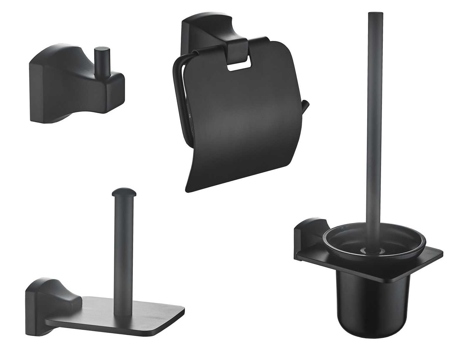 Set 4-delig, materiaal messing, kleur mat zwart, voorzien van toiletborstel met houder, toiletrolhouder met klep, reserverol houder, haak, bevestigingsmateriaal, LET OP: boven een bod van 60,- euro excl BTW en veilingkosten versturen we dit product gratis binnen de benelux naar u toe per post. Merk: Mawialux