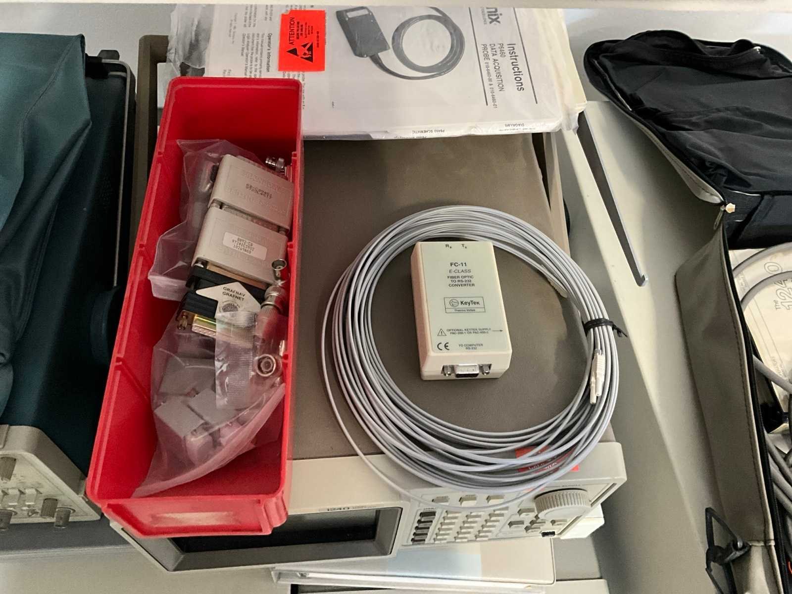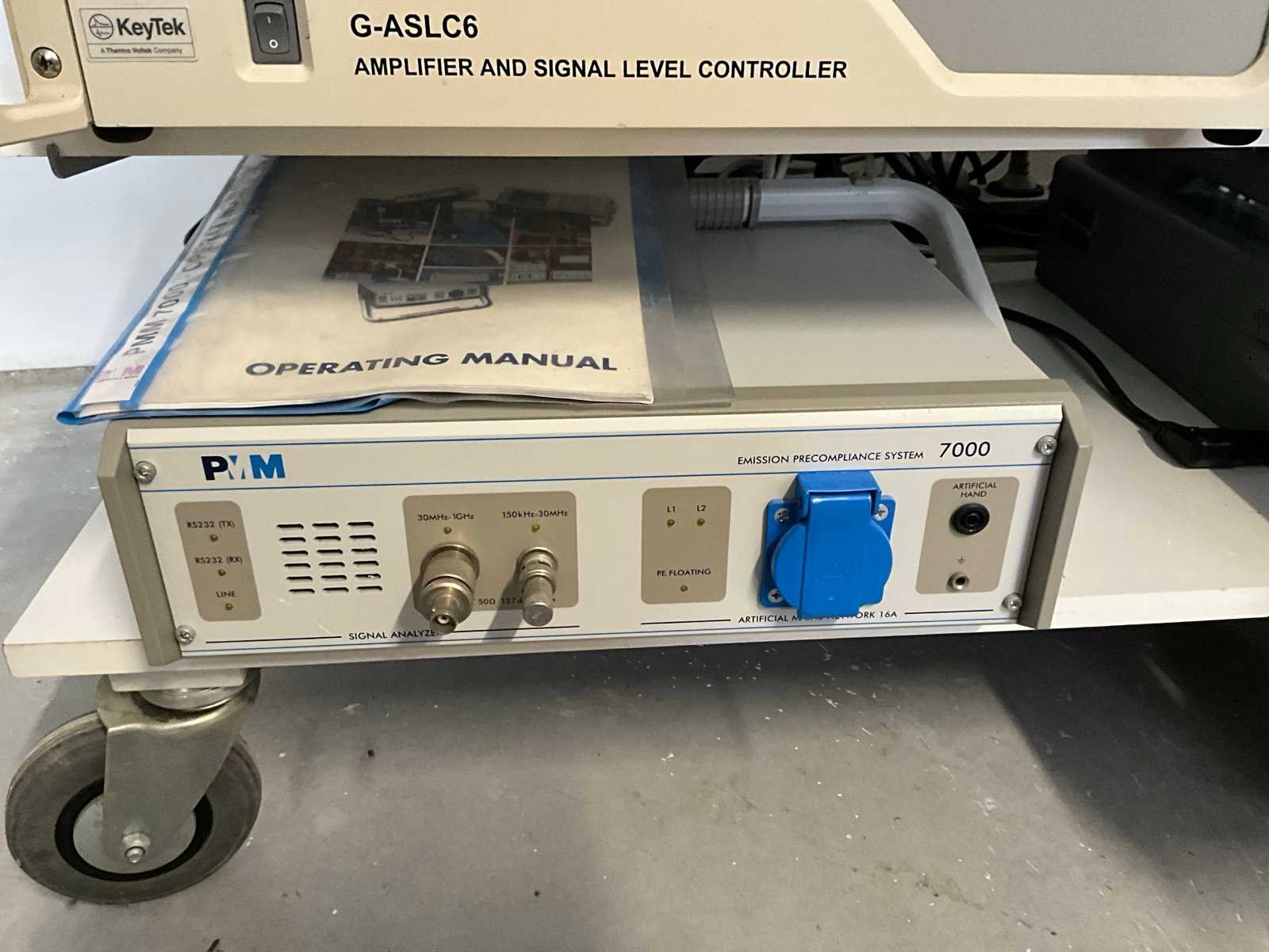HP 8648A Signaalgenerator 100 kHz-1 GHz, PMM 7000 emission precompliant system, Keytek G-ASLC^6 Amplifier and signal level controller, Ferriet cable clamp, PC's met besturingssoftware en licenties, Tektronix 2445 4-kanaals oscilloscoop met probes, Tektronix 1240 logic analyser met probes, inclusief meetkar