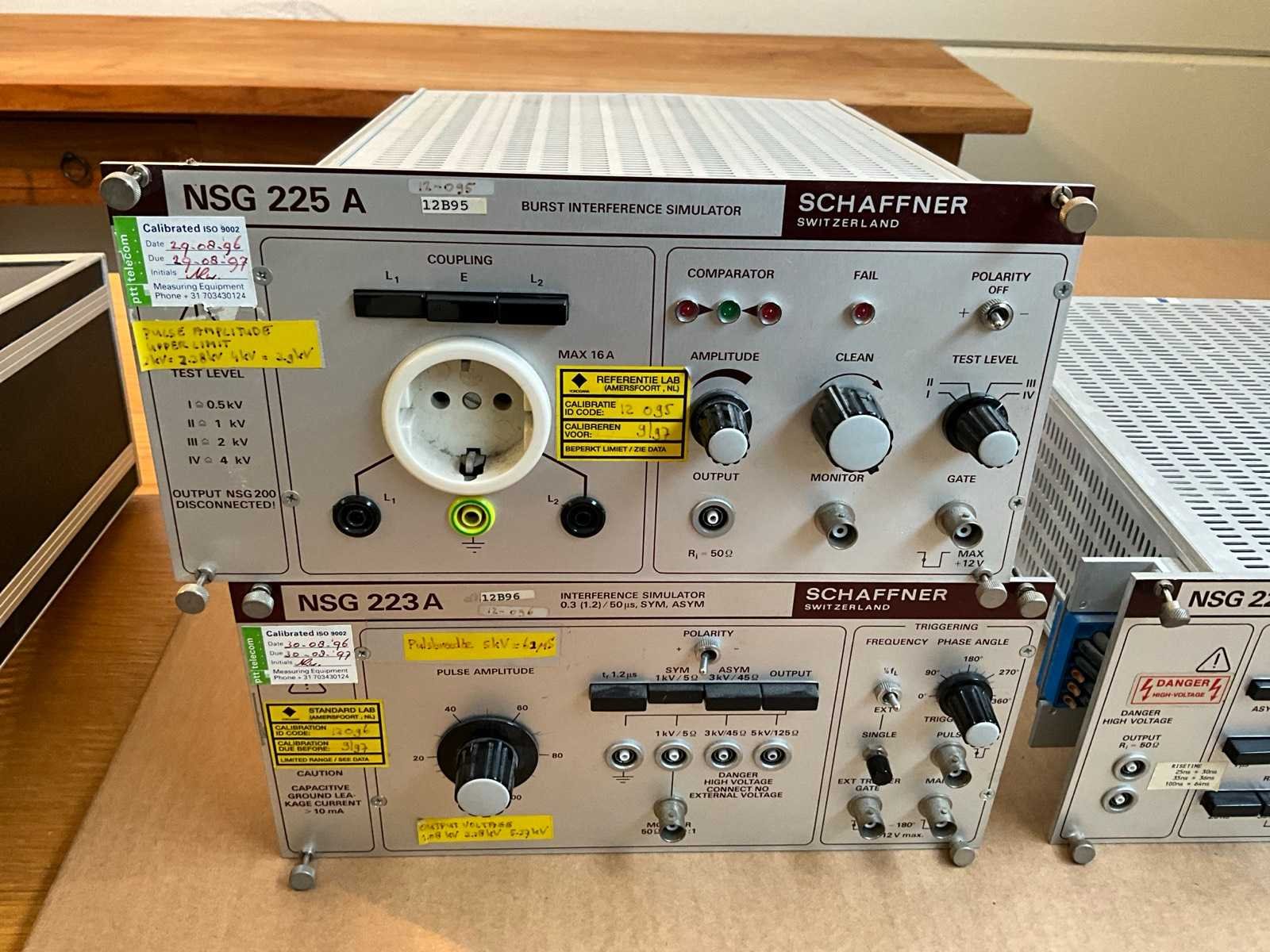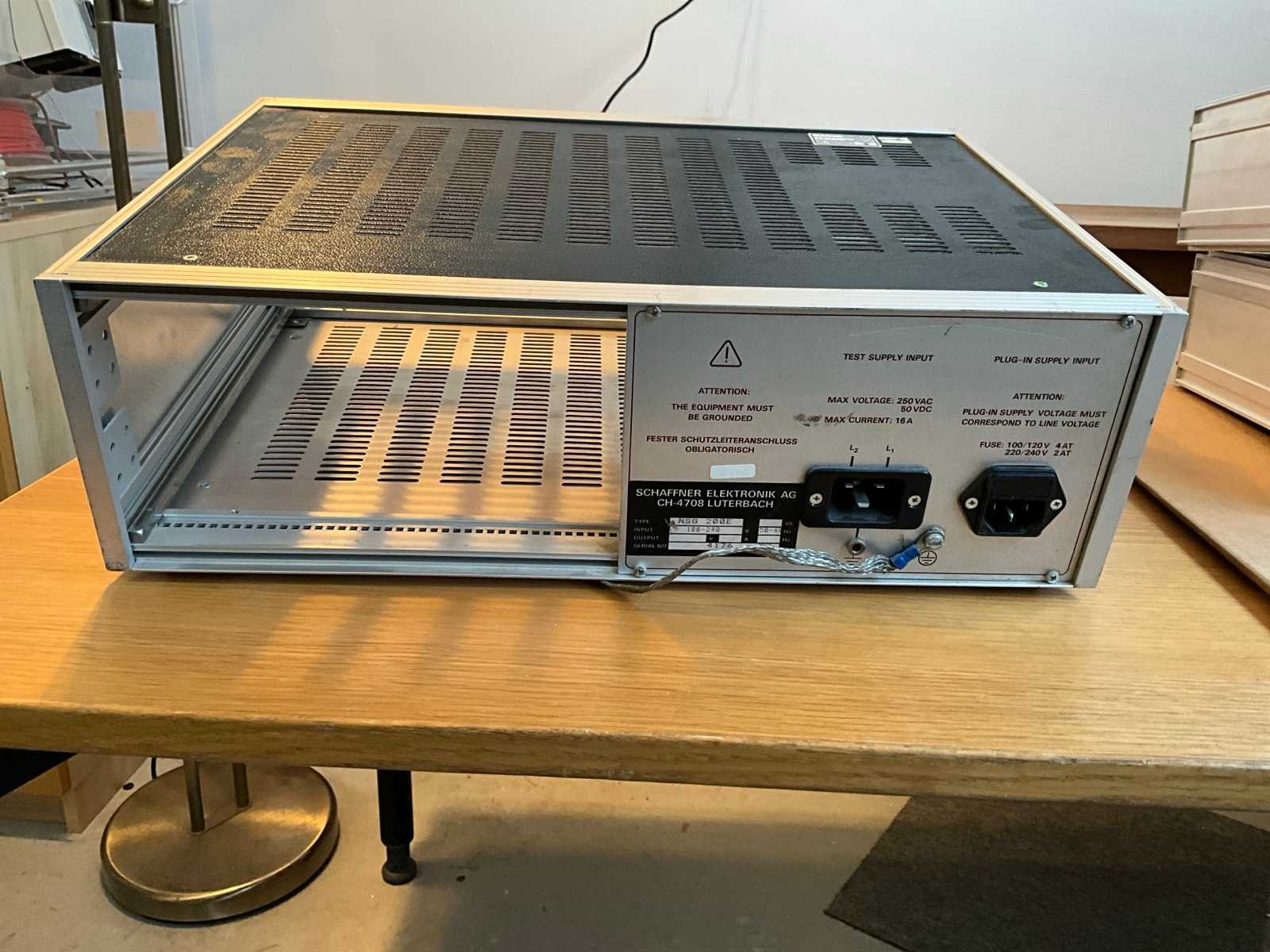 Schaffner NSG200E EMC immuniteits precompliance meetset. De NSG200E is de mainframe. Per type test kan een bijpassende module worden ingestoken. De stoorsignalen kunnen zowel op de lichtnet lijnen als op signaallijnen worden geïnjecteerd. NSG223A interference simulator High Energy Pulses (surge) 1.5 - 5 us, max 5 kV NSG224 interference simulator Medium Energy Pulses (surge), max 150 mJ NSG225A burst (electrical fast transients, EFT) generator 500V - 4000V burst sequences Merk: Schaffner Type: NSG200E Lengte: 44cm Breedte: 34cm Hoogte: 15cm Leveringsvoorwaarden: Niet gefundeerd - onverpakt
