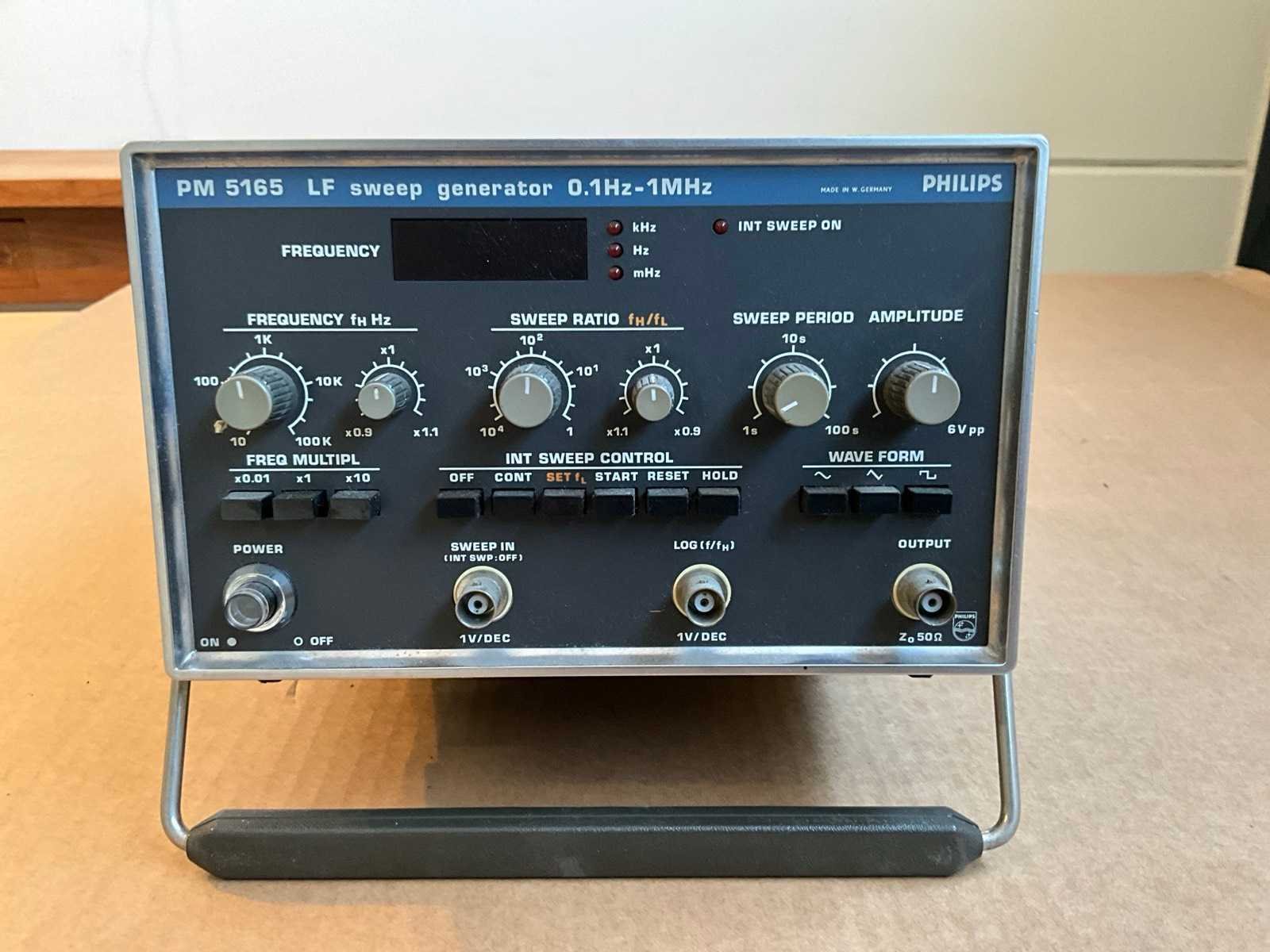 De Philips PM5165 LF sweep generator 0.1 Hz - 1 MHz produceert sinusvormige, driehoek en blokgolf signalen over een frequentiebereik van 0,1 Hz tot 1 MHz. Perfect voor het karakteriseren van filters en versterkers, van audio tot middenfrequent en middengolf. De sweeptijd is instelbaar tussen 1 en 100 sec. Een analoge output is beschikbaar als X-as signaal voor een X/Y recorder of een oscilloscoop. Merk: Philips Type: PM5165 Leveringsvoorwaarden: Niet gefundeerd - onverpakt