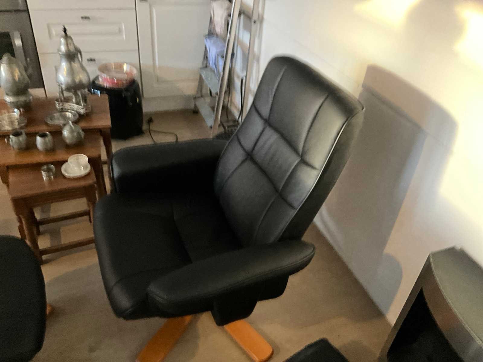 Relax stoel met voetenbank en los massagekussen. Bioethanol kachel, wijnkoelkast, bijzettafel, nestbare 3 delige tafel met divers tinnen drinkgerei Kleur: Zwart Lengte: 65cm Breedte: 77cm Hoogte: 92cm Zithoogte: 41cm