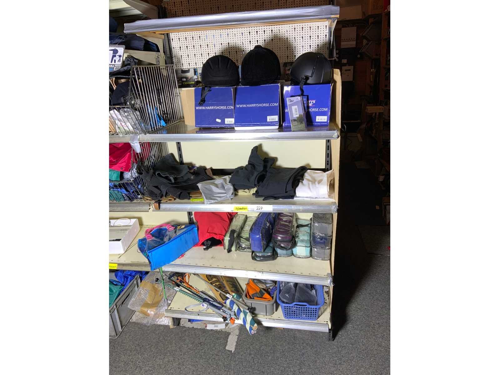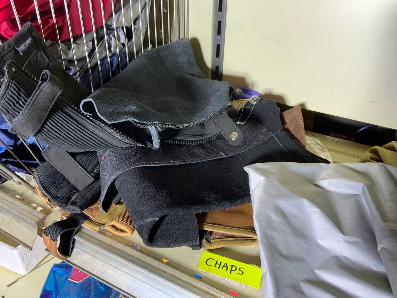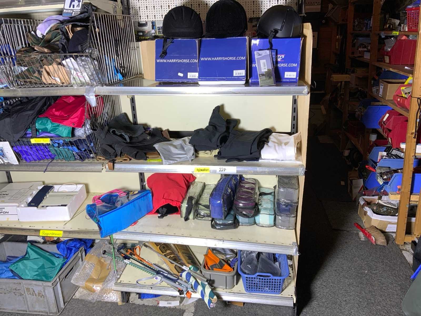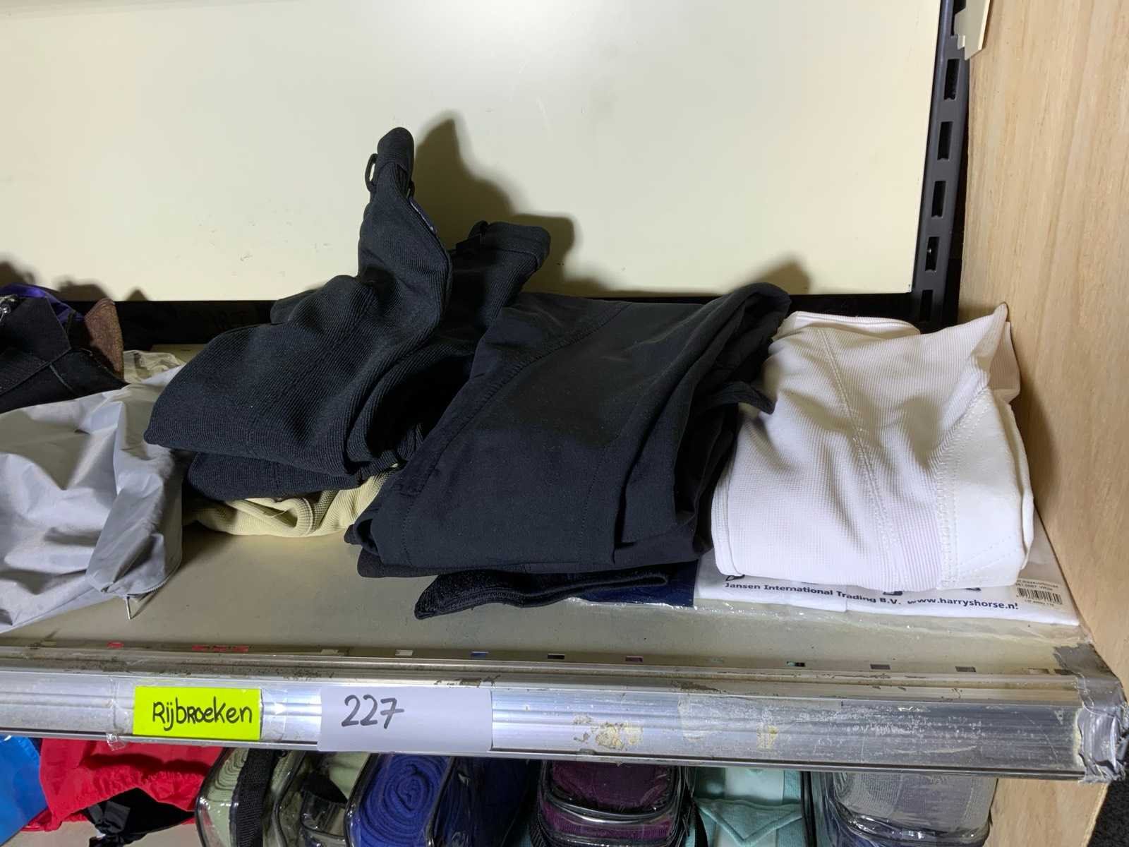 Op 4 schappen waaronder 3 caps chaps kinderrijbroeken bandages zweepjes en divers