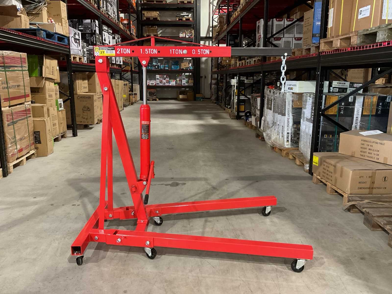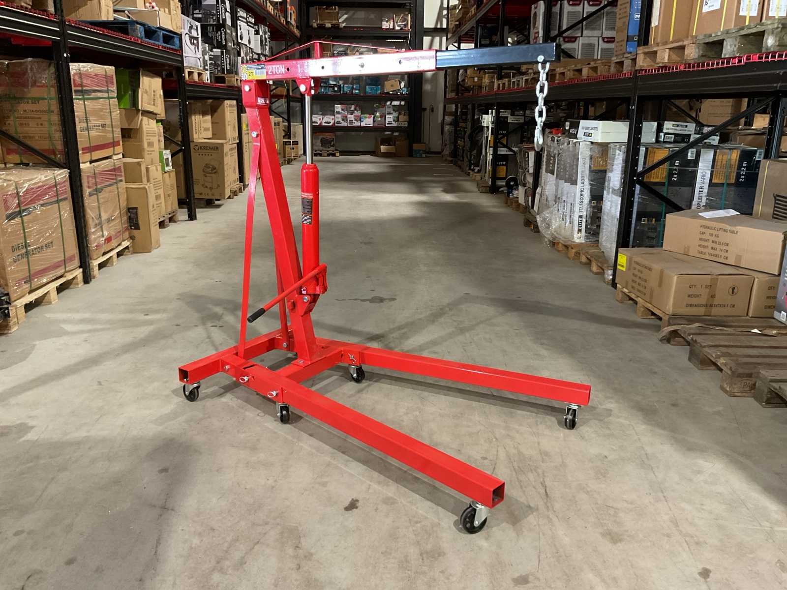 Voorzien van zwenk wielen; telescoop arm; 4 verschillende standen (500, 1000, 1500 en 2000 kilo); lengte van 107 tot 160 cm; Maximale reikhoogte van 270 cm; Binnenbreedte tussen de wielen: 88 cm en de hoogte van de wielen bedraagt 12 cm; Ongebruikt in doos (Afmeting transport verpakking doos 1 - 1385x310x155 mm / Doos 2 - 830x580x80 lxbxh, gewicht 75 kg) Merk: Benson Tools Type: 2 Ton Bouwjaar: 2025 Eigen gewicht: 75kg Totale afmeting Hoogte: 2700mm