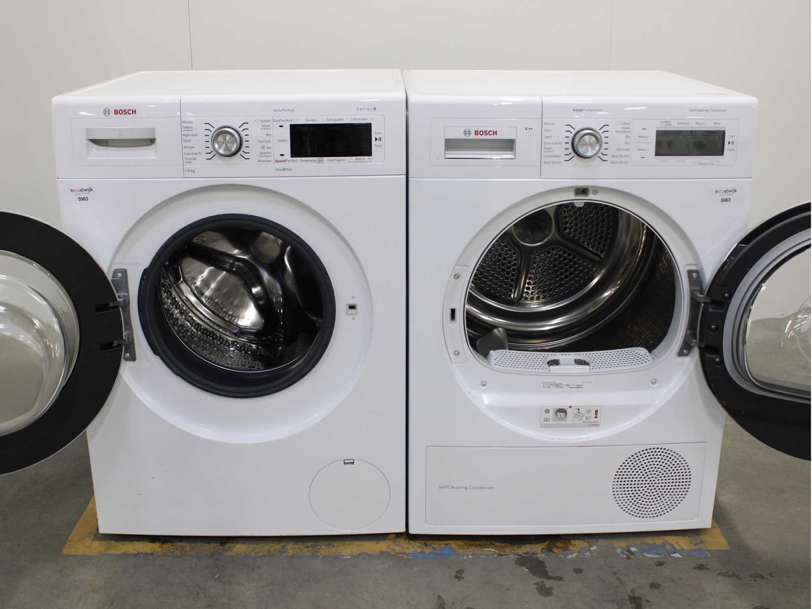 Deze wasmachine en wasdroger komen uit een partij jong gebruikt A-Merk witgoed. De machines zijn volledig getest, gereinigd en indien nodig gerepareerd. Houdt er rekening mee dat de machines lichte gebruikssporen kunnen hebben. Wasmachines en wasdrogers hebben vaak standaard afmetingen. Hoogte 85cm, Breedte 60cm en Diepte 60 tot 70cm, incl. uitstekende slangen e.d. aan de achterzijde. Als de machine vrij komt te staan is de afmeting minder relevant. Wil je de machine in een nis plaatsen of inbouwen? Controleer dan de exacte afmetingen op basis van het aangeboden merk en model/type. Within 7 days Merk: Bosch Serienummer: WAW32542NL/11 en WTY87700NL/16