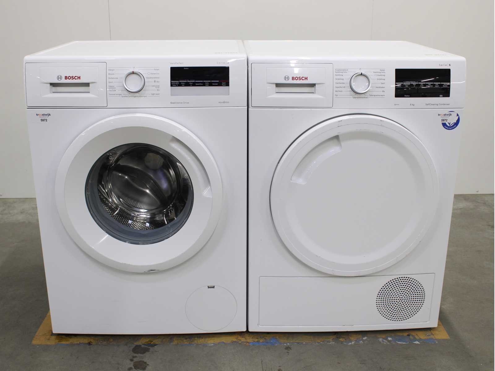Deze wasmachine en wasdroger komen uit een partij jong gebruikt A-Merk witgoed. De machines zijn volledig getest, gereinigd en indien nodig gerepareerd. Houdt er rekening mee dat de machines lichte gebruikssporen kunnen hebben. Wasmachines en wasdrogers hebben vaak standaard afmetingen. Hoogte 85cm, Breedte 60cm en Diepte 60 tot 70cm, incl. uitstekende slangen e.d. aan de achterzijde. Als de machine vrij komt te staan is de afmeting minder relevant. Wil je de machine in een nis plaatsen of inbouwen? Controleer dan de exacte afmetingen op basis van het aangeboden merk en model/type. Within 7 days Merk: Bosch Serienummer: WAN282M2NL en WTW8446ENL