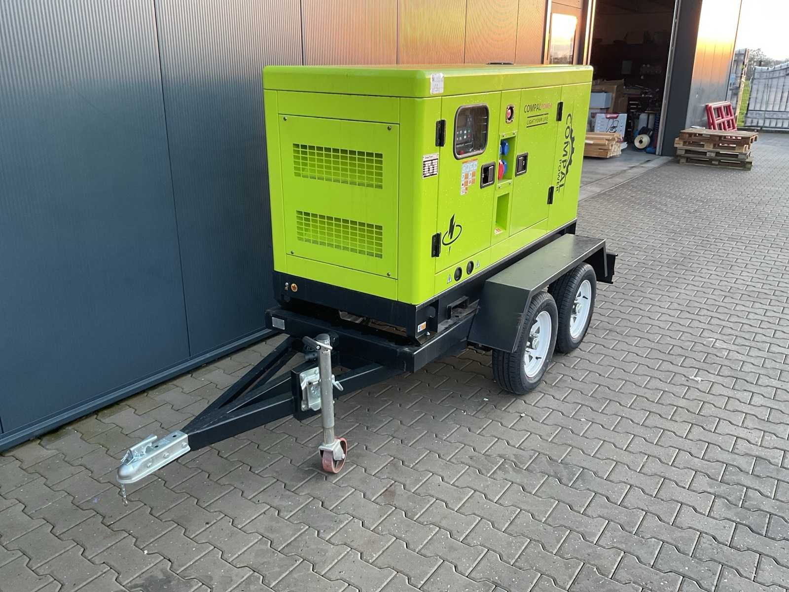 Voorzien van Trailer; Stationaire dieselgenerator (3-fasen); Nominaal vermogen: ca. 30 kW; Apparent vermogen: ca. 37,5 kVA; Spanning: 400/230 V, 3-fasen; Frequentie: 50 Hz; Nominale stroom (400 V): ca. 54 A; Toerental: 1500 rpm; Motortype: K4100D dieselmotor; Watergekoeld; Alternator: Type 184H; Ongebruikt Merk: Compal Power Type: VG-R30 Bouwjaar: 2025 Capaciteit.: 37.5kVA Diesel: true Type motor: K4100D Aantal cilinders: 4 Motorvermogen (kW): 45kW Watergekoeld: true Mobiel: true Handboek aanwezig: true Machinegewicht: 900kg Totale afmeting L: 2100mm Totale afmeting Breedte: 850mm Totale afmeting Hoogte: 1200mm