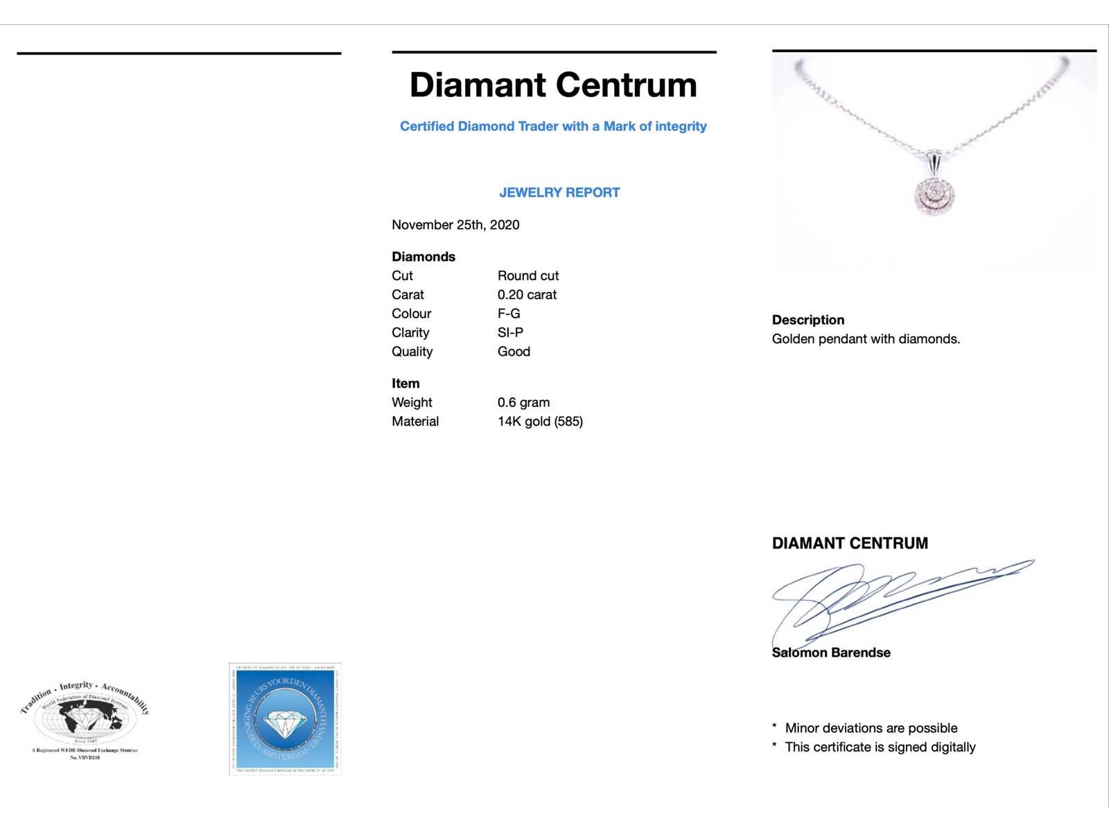 Samenvatting van gegevens Witgouden hanger met diamanten Diamant: Natuurlijk; Slijpvorm: Rond geslepen; Gewicht (carat): 0.20 carat; Kleur: F-G; Zuiverheid: SI-P; Slijpkwaliteit: Goed; Juweel: Hanger (excl. ketting); Gewicht: 0.6 gram; Materiaal: 14 karaat (585); Conditie: Nieuw; Verpakking: Luxe sieradendoos; Toelichting: De kwaliteit is overgenomen van het rapport behorend bij item. De waardebepaling is een beoordeling van een gecertificeerde diamantair, gebaseerd op consumentenprijzen.; Consumentenprijs: € 578,- Within 14 days Voornaamste diamant: Natuurlijk Kleur diamant: F-G Gewicht diamant: 0.20ct Slijpvorm diamant: Rond geslepen Slijpkwaliteit diamant: Goed Zuiverheidsgraad diamant: SI-P Totaal gewicht: 0.6g Keurmerk: 585