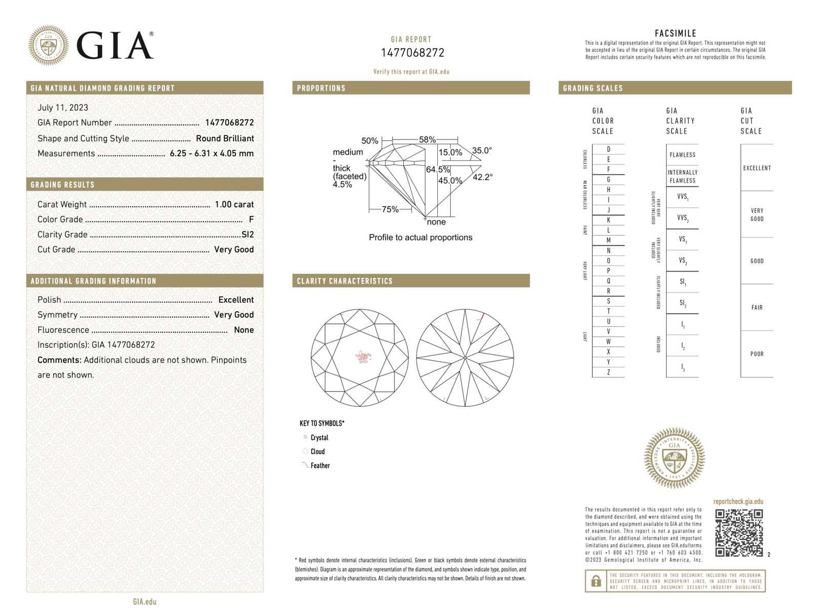 Samenvatting van gegevens Diamant - 1.00 carat briljant geslepen diamant met een GIA certificaat (gecertificeerd) Diamant: Natuurlijk; Aantal: 1 stuk; Slijpvorm: Briljant geslepen; Gewicht (carat): 1.00 carat; Kleur: F; Zuiverheid: SI2; Slijpkwaliteit: Very good; Certificaat: GIA; Certificaat nummer: 1477068272; Conditie: Nieuw; Verpakking: Edelsteendoos; Toelichting: De kwaliteit is overgenomen van het rapport behorend bij item. De waardebepaling is een beoordeling van een gecertificeerde diamantair, gebaseerd op consumentenprijzen.; Consumentenprijs: € 10.800,- Within 14 days Voornaamste diamant: Natuurlijk Kleur diamant: F Gewicht diamant: 1.00ct Slijpvorm diamant: Briljant geslepen Slijpkwaliteit diamant: Very good Zuiverheidsgraad diamant: SI2 Certificaat: GIA