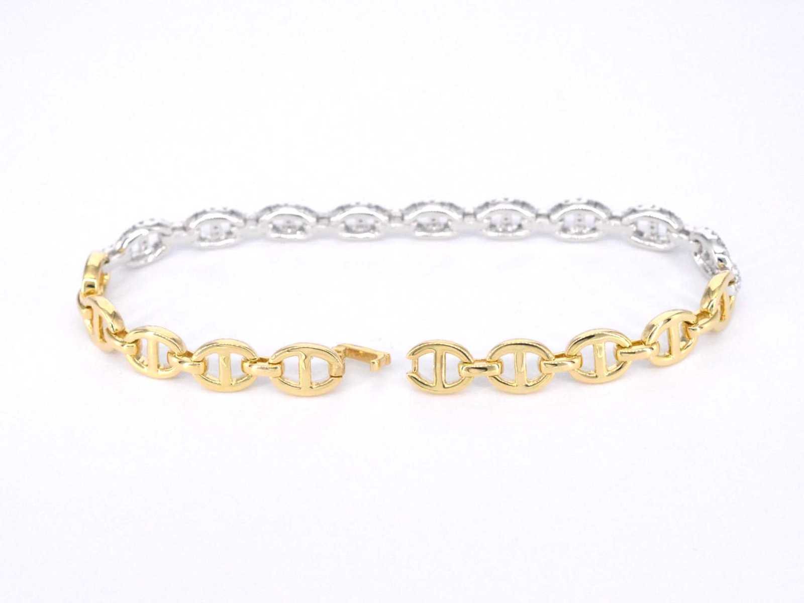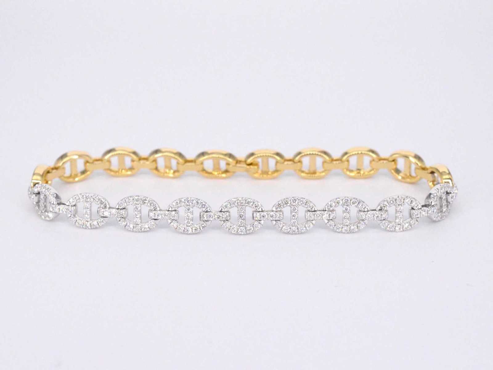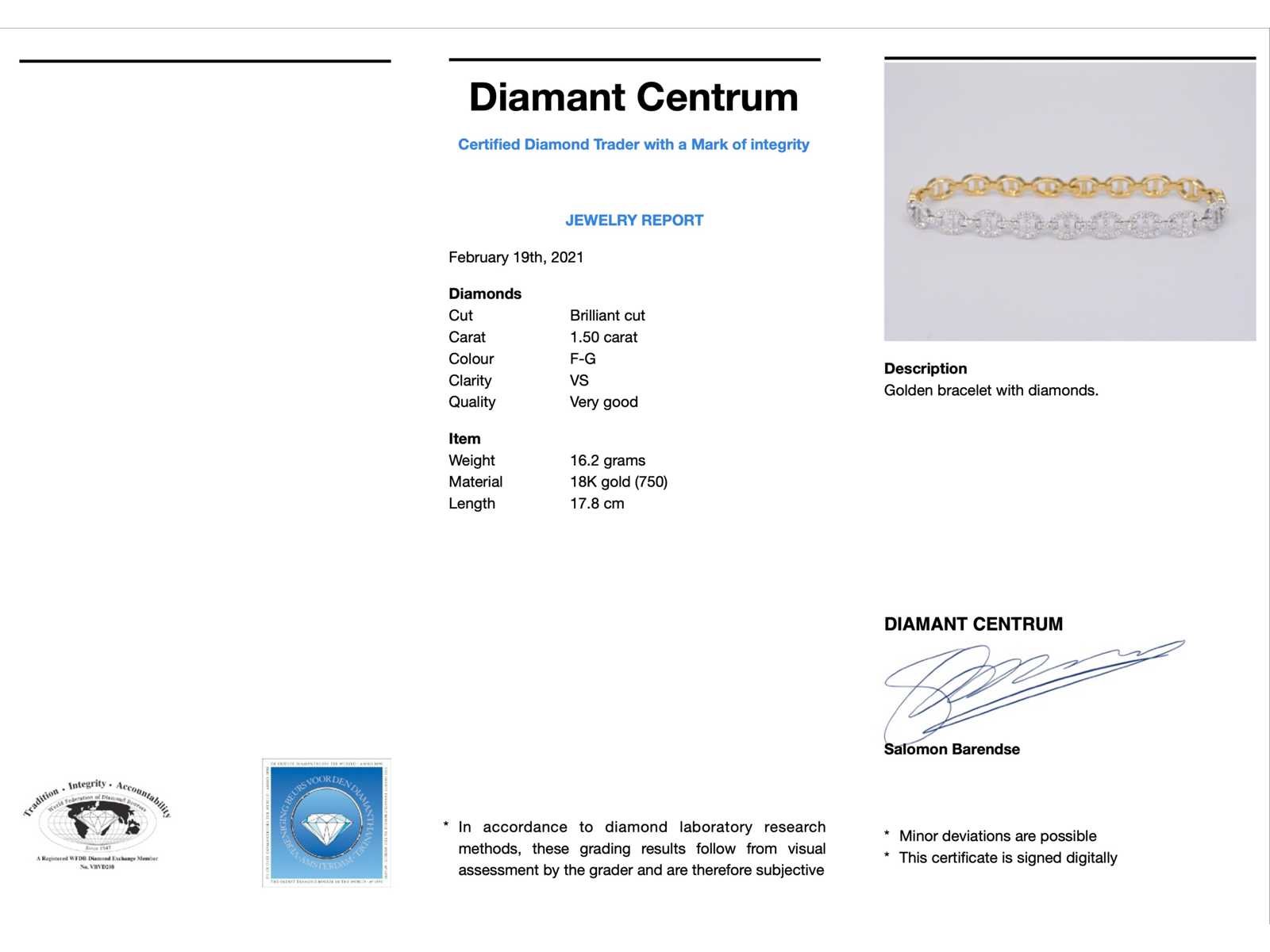 Samenvatting van gegevens Gouden tennisarmband met diamanten schakels met 157 diamanten Diamant: Natuurlijk; Aantal: 157 stuks; Slijpvorm: Briljant geslepen; Gewicht (carat): 1.50 carat; Kleur: F-G; Zuiverheid: VS; Slijpkwaliteit: Zeer mooi; Juweel: Armband; Gewicht: 16.2 gram; Afmetingen/lengte: 17,8 cm; Materiaal: 18K goud (750); Conditie: Nieuw; Verpakking: Luxe sieradendoos; Toelichting: De kwaliteit is overgenomen van het rapport behorend bij item. De waardebepaling is een beoordeling van een gecertificeerde diamantair, gebaseerd op consumentenprijzen.; Consumentenprijs: € 15.453,- Within 14 days Materiaal: Goud Voornaamste diamant: Natuurlijk Kleur diamant: F-G Gewicht diamant: 1.50ct Slijpvorm diamant: Briljant geslepen Slijpkwaliteit diamant: Zeer mooi Zuiverheidsgraad diamant: VS Totaal gewicht: 16.2g Keurmerk: 750