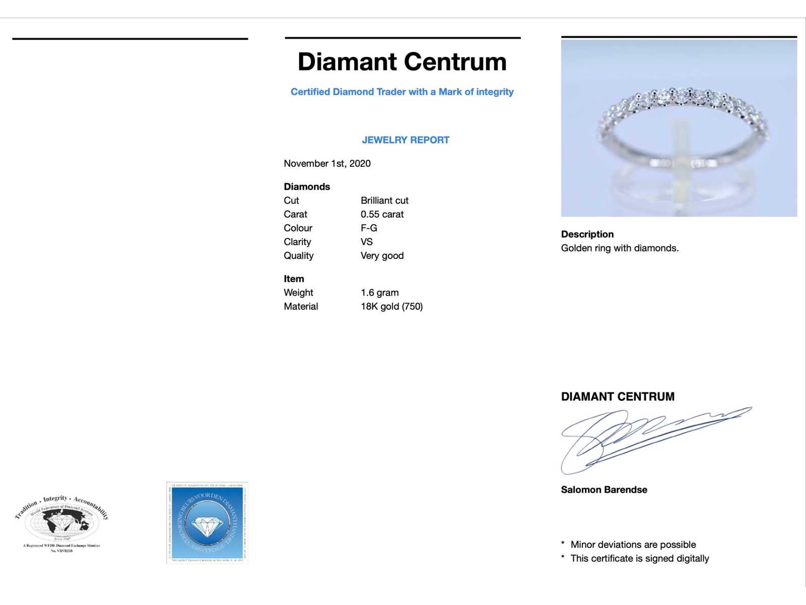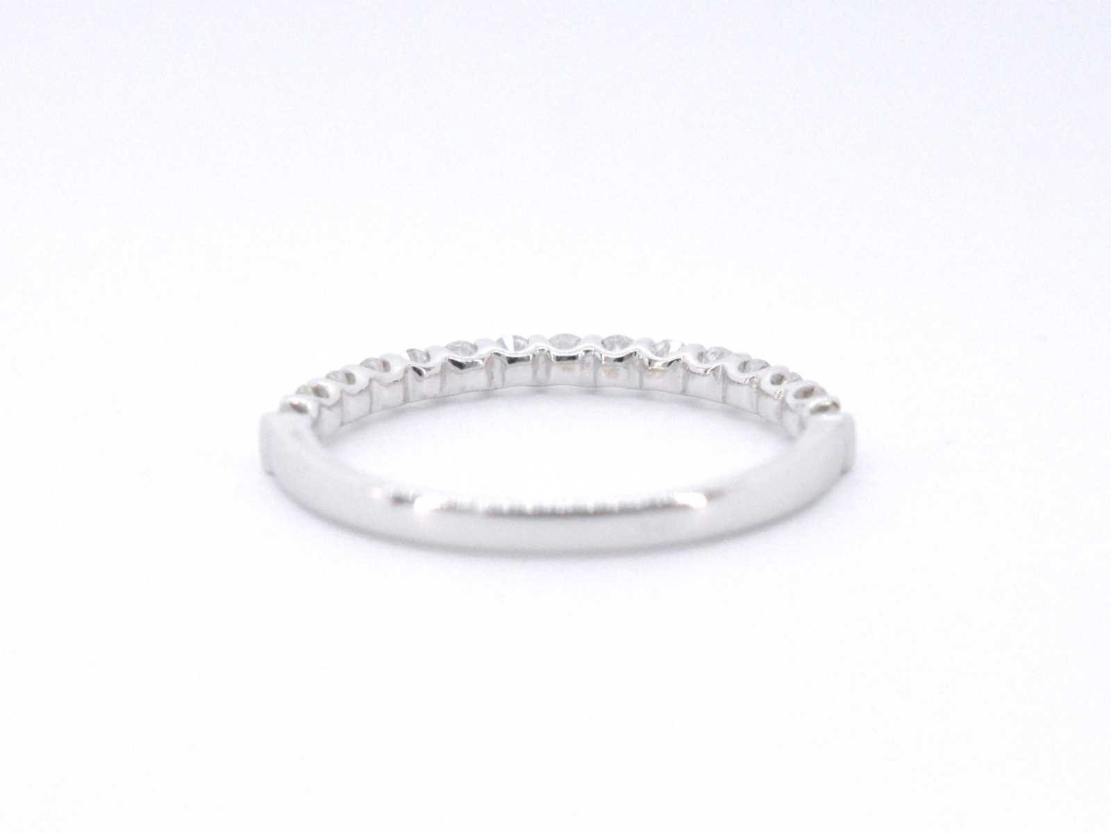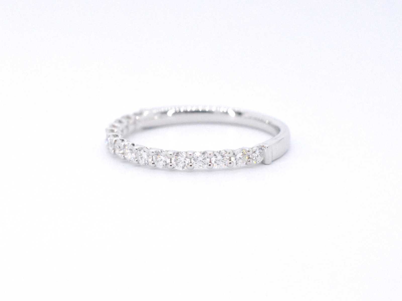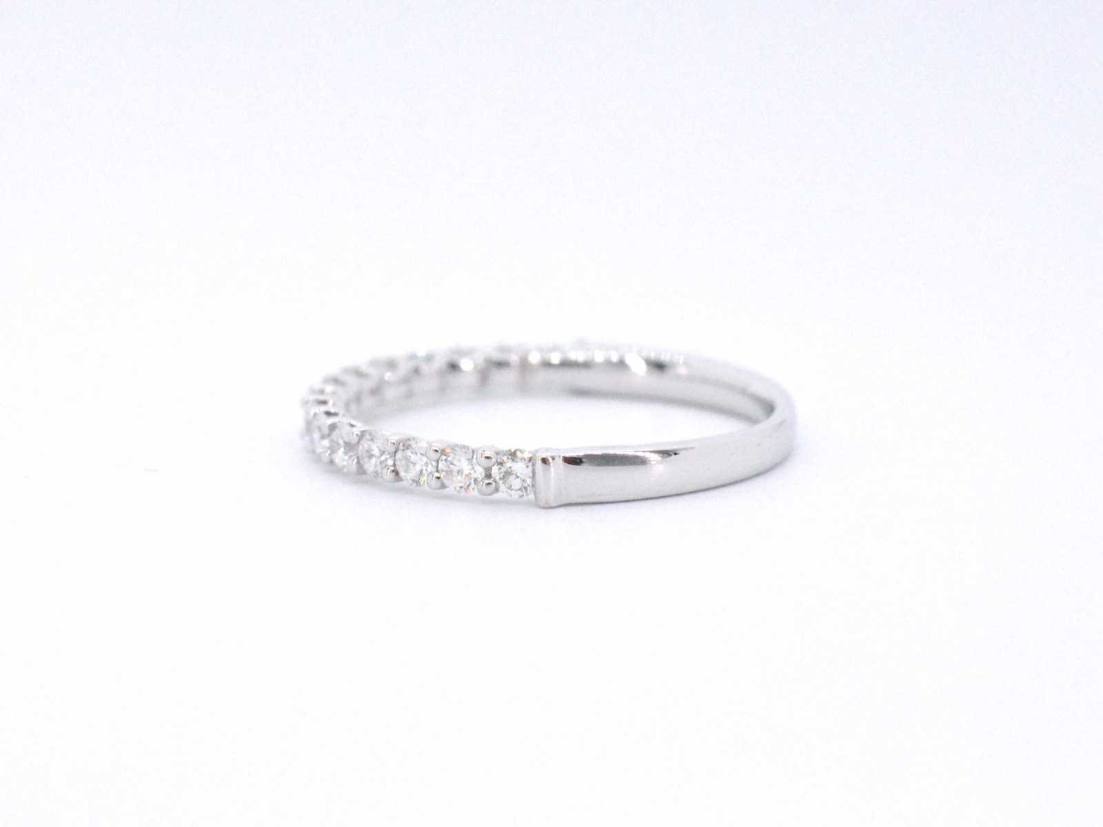 Samenvatting van gegevens Witgouden rijring bezet met briljant geslepen diamanten Diamant: Natuurlijk; Aantal: 15 stuks; Slijpvorm: Briljant geslepen; Gewicht (carat): 0.55 carat; Kleur: F-G; Zuiverheid: VS; Juweel: Ring; Gewicht: 1.6 gram; Ringmaat (op maat gemaakt*): 53 (17 mm); Materiaal: 18K goud (750); Conditie: Nieuw; Verpakking: Luxe sieradendoos; Toelichting: De kwaliteit is overgenomen van het rapport behorend bij item. De waardebepaling is een beoordeling van een gecertificeerde diamantair, gebaseerd op consumentenprijzen.; Consumentenprijs: € 3.133,- Within 14 days Materiaal: Goud Voornaamste diamant: Natuurlijk Gewicht diamant: 0.55ct Totaal gewicht: 1.6g Keurmerk: 750 Kleur diamant: F-G Slijpvorm diamant: Briljant geslepen Zuiverheidsgraad diamant: VS