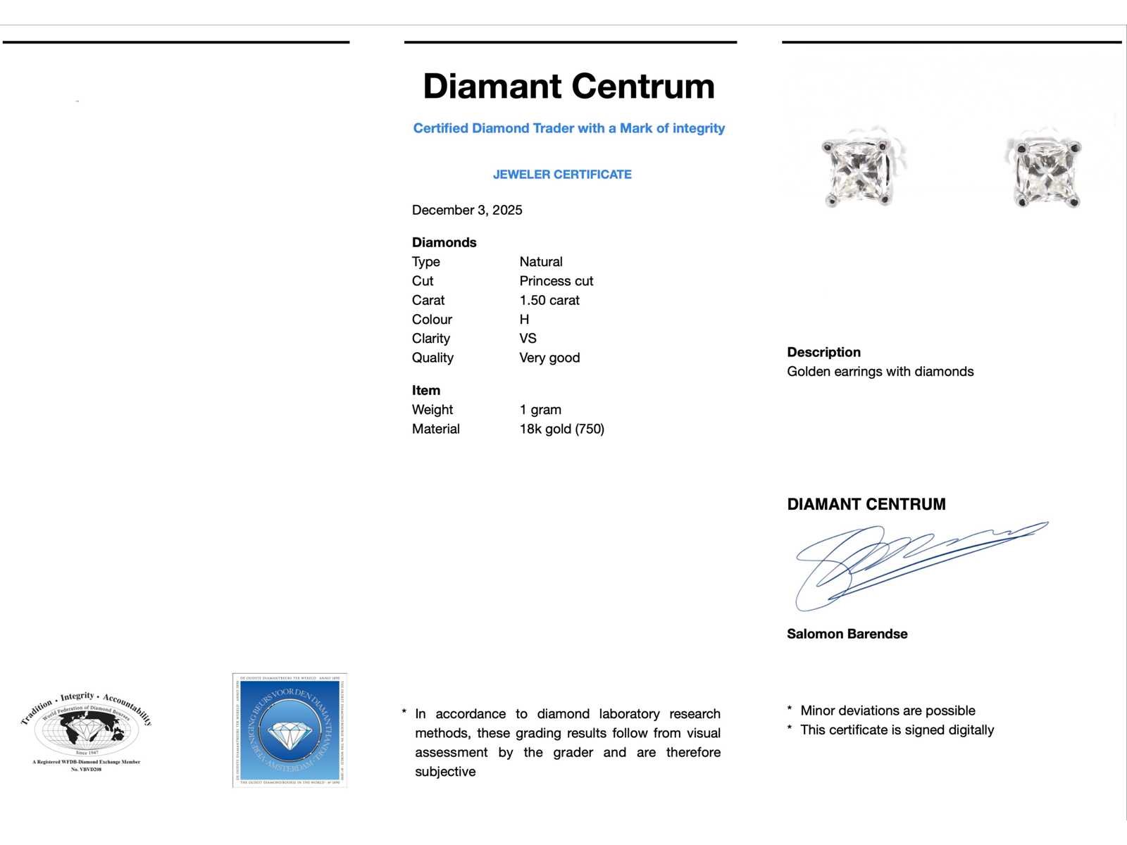 Samenvatting van gegevens Witgouden oorbellen met princess geslepen diamanten 1.50 carat Diamant: Natuurlijk; Aantal: 2 stuks; Slijpvorm: prinses geslepen; Gewicht (carat): 1.50 carat; Kleur: H; Zuiverheid: VS; Slijpkwaliteit: Exceptioneel; Juweel: Oorbellen; Gewicht: 1 gram; Materiaal: 18K goud (750); Conditie: Nieuw; Verpakking: Luxe sieradendoos; Toelichting: De kwaliteit is overgenomen van het rapport behorend bij item. De waardebepaling is een beoordeling van een gecertificeerde diamantair, gebaseerd op consumentenprijzen.; Consumentenprijs: € 12.000,- Within 14 days Materiaal: Goud Voornaamste diamant: Natuurlijk Kleur diamant: H Gewicht diamant: 1.50ct Slijpvorm diamant: prinses geslepen Slijpkwaliteit diamant: Exceptioneel Zuiverheidsgraad diamant: VS Totaal gewicht: 1g Keurmerk: 750