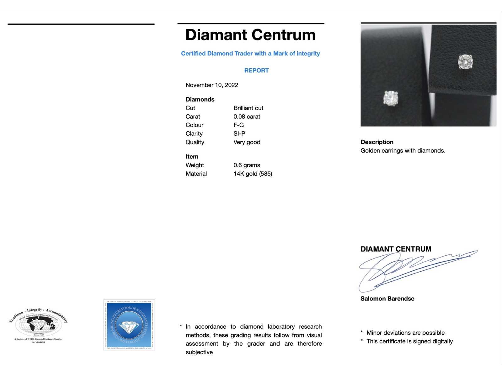 Samenvatting van gegevens Witgouden oorbellen met diamant Diamant: Natuurlijk; Slijpvorm: Briljant geslepen; Gewicht (carat): 0.08 carat; Kleur: F-G; Zuiverheid: SI-P; Slijpkwaliteit: Zeer mooi; Juweel: Oorbellen; Gewicht: 0.5 gram; Afmetingen/lengte: 2 mm; Materiaal: 14 karaat (585); Conditie: Nieuw; Verpakking: Luxe sieradendoos; Toelichting: De kwaliteit is overgenomen van het rapport behorend bij item. De waardebepaling is een beoordeling van een gecertificeerde diamantair, gebaseerd op consumentenprijzen.; Consumentenprijs: € 578,- Within 14 days Voornaamste diamant: Natuurlijk Kleur diamant: F-G Gewicht diamant: 0.08ct Slijpvorm diamant: Briljant geslepen Slijpkwaliteit diamant: Zeer mooi Zuiverheidsgraad diamant: SI-P Totaal gewicht: 0.5g Keurmerk: 585
