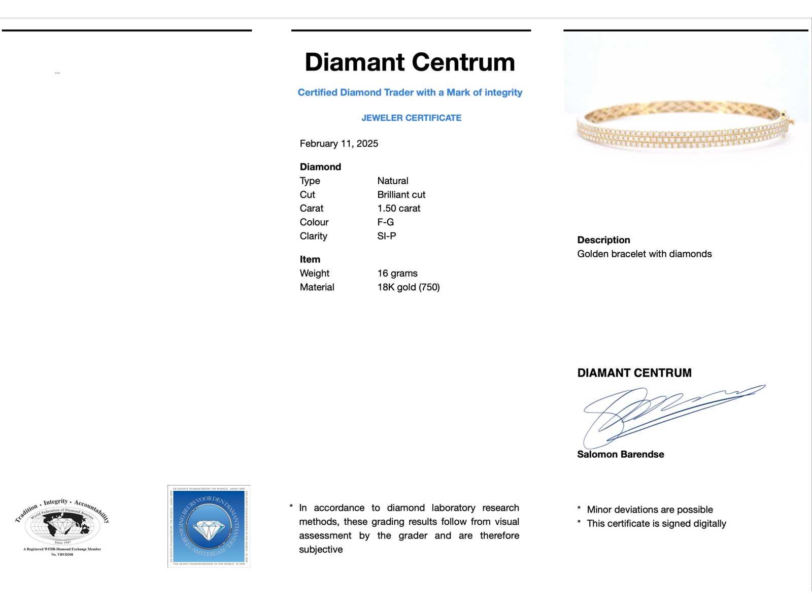 Samenvatting van gegevens Gouden vaste armband met briljant geslepen diamant Diamant: Natuurlijk; Aantal: 151 stuks; Slijpvorm: Briljant geslepen; Gewicht (carat): 1.50 carat; Kleur: F-G; Zuiverheid: SI-P; Juweel: Armband; Gewicht: 16 gram; Afmetingen/lengte: maat: 17 (56 mm); Materiaal: 18K goud (750); Conditie: Nieuw; Verpakking: Luxe sieradendoos; Toelichting: De kwaliteit is overgenomen van het rapport behorend bij item. De waardebepaling is een beoordeling van een gecertificeerde diamantair, gebaseerd op consumentenprijzen.; Consumentenprijs: € 12.250,- Within 14 days Materiaal: Goud Voornaamste diamant: Natuurlijk Kleur diamant: F-G Gewicht diamant: 1.50ct Slijpvorm diamant: Briljant geslepen Zuiverheidsgraad diamant: SI-P Totaal gewicht: 16g Keurmerk: 750