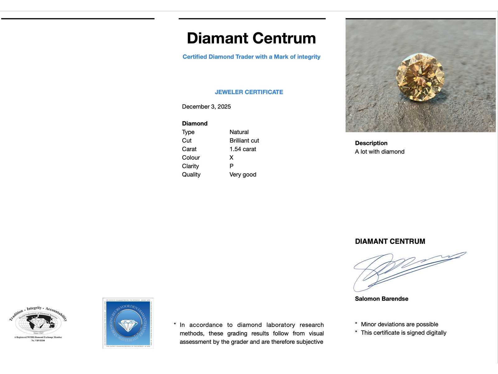 Samenvatting van gegevens Diamant - 1.54 natuurlijke diamant Diamant: Natuurlijk; Aantal: 1 stuks; Slijpvorm: Briljant geslepen; Gewicht (carat): 1.54 carat; Kleur: Commercial (X); Zuiverheid: P; Slijpkwaliteit: Zeer mooi; Conditie: Nieuw; Verpakking: Edelsteendoos; Toelichting: De kwaliteit is overgenomen van het rapport behorend bij item. De waardebepaling is een beoordeling van een gecertificeerde diamantair, gebaseerd op consumentenprijzen.; Consumentenprijs: € 6.000,- Within 14 days Voornaamste diamant: Natuurlijk Kleur diamant: Commercial (X) Gewicht diamant: 1.54ct Slijpvorm diamant: Briljant geslepen Slijpkwaliteit diamant: Zeer mooi Zuiverheidsgraad diamant: P