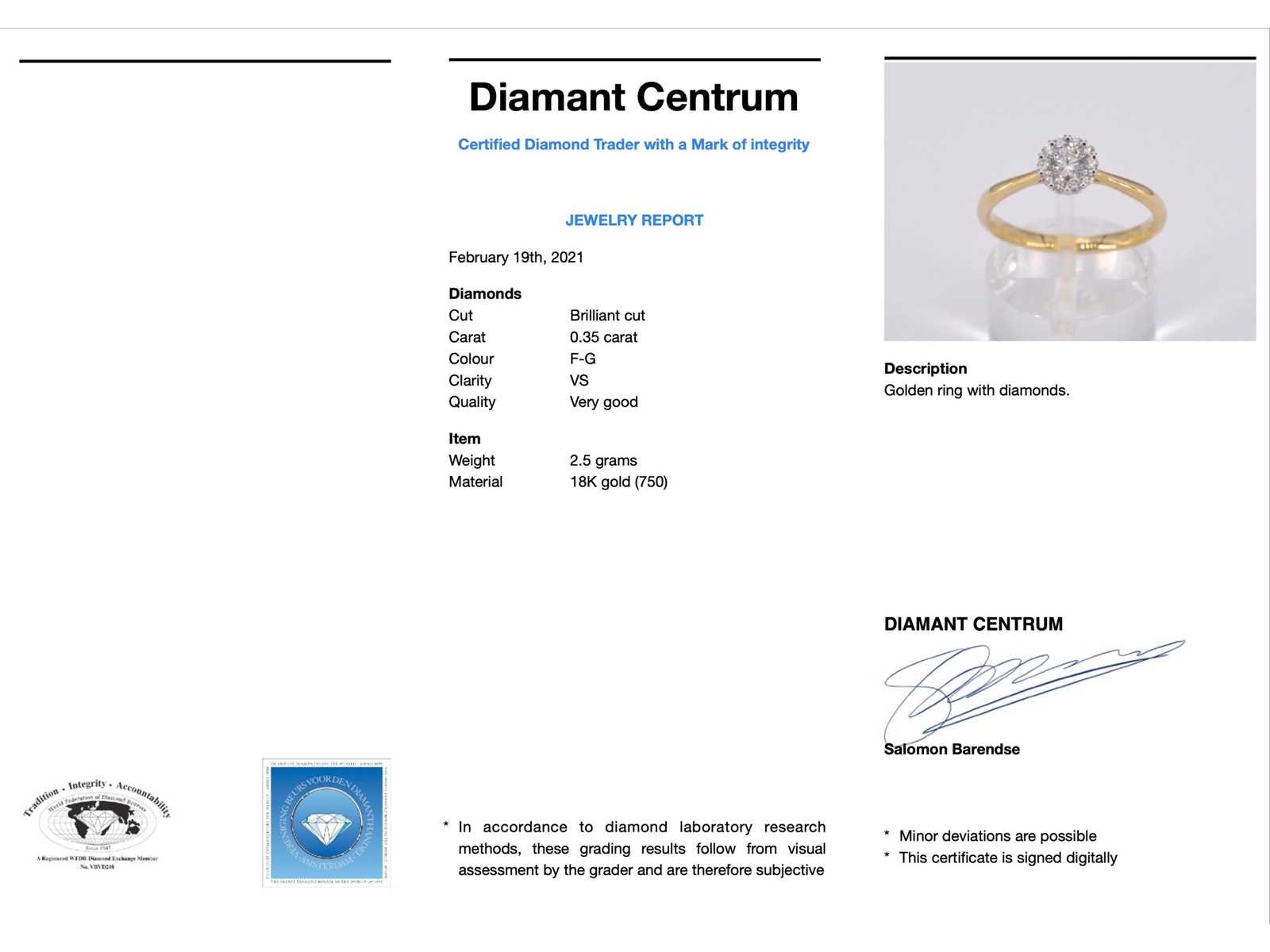 Samenvatting van gegevens Gouden ring met 0.35 carat diamant Diamant: Natuurlijk; Slijpvorm: Briljant geslepen; Gewicht (carat): 0.35 carat; Kleur: F-G; Zuiverheid: VS; Slijpkwaliteit: Zeer mooi; Juweel: Ring; Gewicht: 2.5 gram; Ringmaat (op maat gemaakt*): 53 (17 mm); Materiaal: 18K goud (750); Conditie: Nieuw; Verpakking: Luxe sieradendoos; Toelichting: De kwaliteit is overgenomen van het rapport behorend bij item. De waardebepaling is een beoordeling van een gecertificeerde diamantair, gebaseerd op consumentenprijzen.; Consumentenprijs: € 3.973,- Within 14 days Materiaal: Goud Voornaamste diamant: Natuurlijk Gewicht diamant: 0.35ct Totaal gewicht: 2.5g Keurmerk: 750 Kleur diamant: F-G Slijpvorm diamant: Briljant geslepen Slijpkwaliteit diamant: Zeer mooi Zuiverheidsgraad diamant: VS