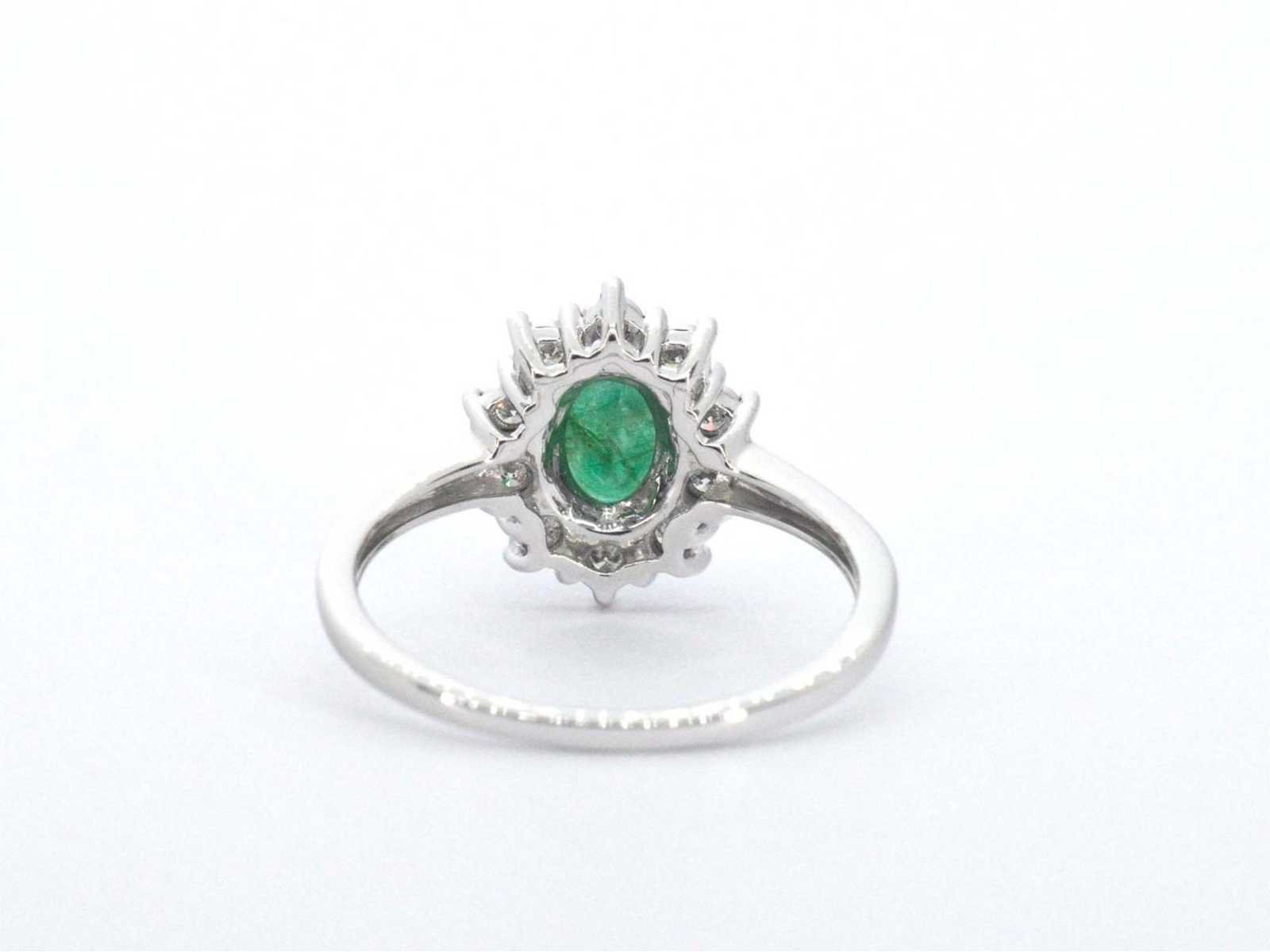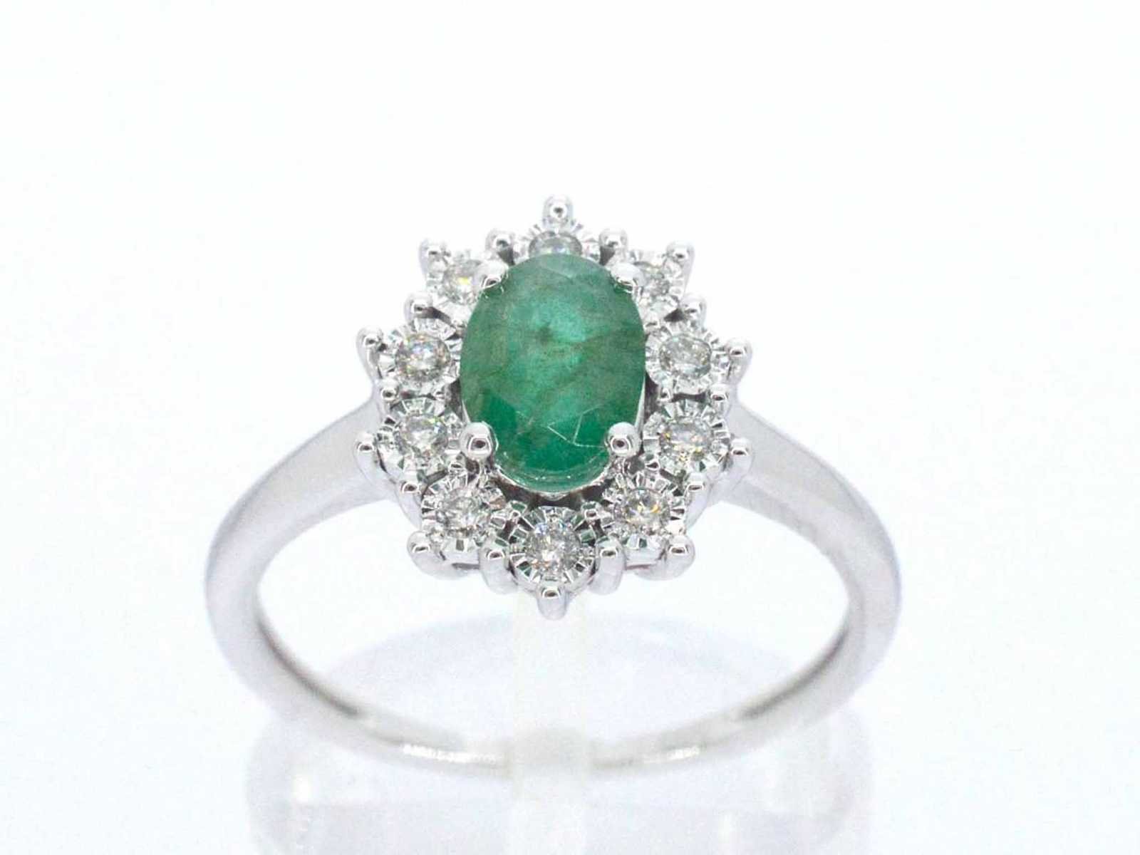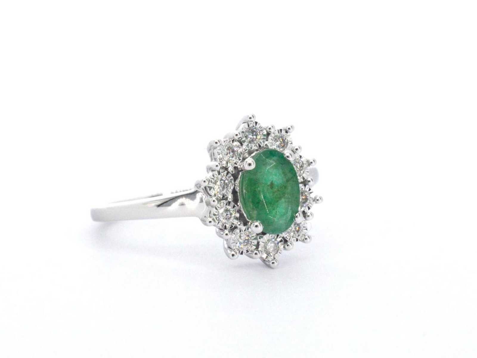 Samenvatting van gegevens Witgouden entourage ring met smaragd en diamanten Diamant: Natuurlijk; Slijpvorm: Briljant geslepen; Gewicht (carat): 0.15 carat; Kleur: F-G; Zuiverheid: SI-P; Slijpkwaliteit: Zeer mooi; Edelsteen: Smaragd; Slijpvorm: Ovaal geslepen; Gewicht (carat): 1.00 carat; Kleur: Groen; Juweel: Ring; Gewicht: 2 gram; Ringmaat (op maat gemaakt*): 54 (17.25 mm); Materiaal: 14 karaat (585); Conditie: Nieuw; Verpakking: Luxe sieradendoos; Toelichting: De kwaliteit is overgenomen van het rapport behorend bij item. De waardebepaling is een beoordeling van een gecertificeerde diamantair, gebaseerd op consumentenprijzen.; Consumentenprijs: € 1.925,- Within 14 days Voornaamste diamant: Natuurlijk Gewicht diamant: 0.15ct Edelsteen: Smaragd Totaal gewicht: 2g Keurmerk: 585 Kleur diamant: F-G Slijpvorm diamant: Briljant geslepen Slijpkwaliteit diamant: Zeer mooi Zuiverheidsgraad diamant: SI-P Kleur edelsteen: Groen Slijpvorm edelsteen: Ovaal geslepen