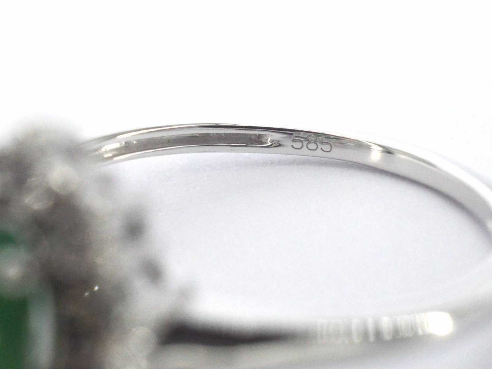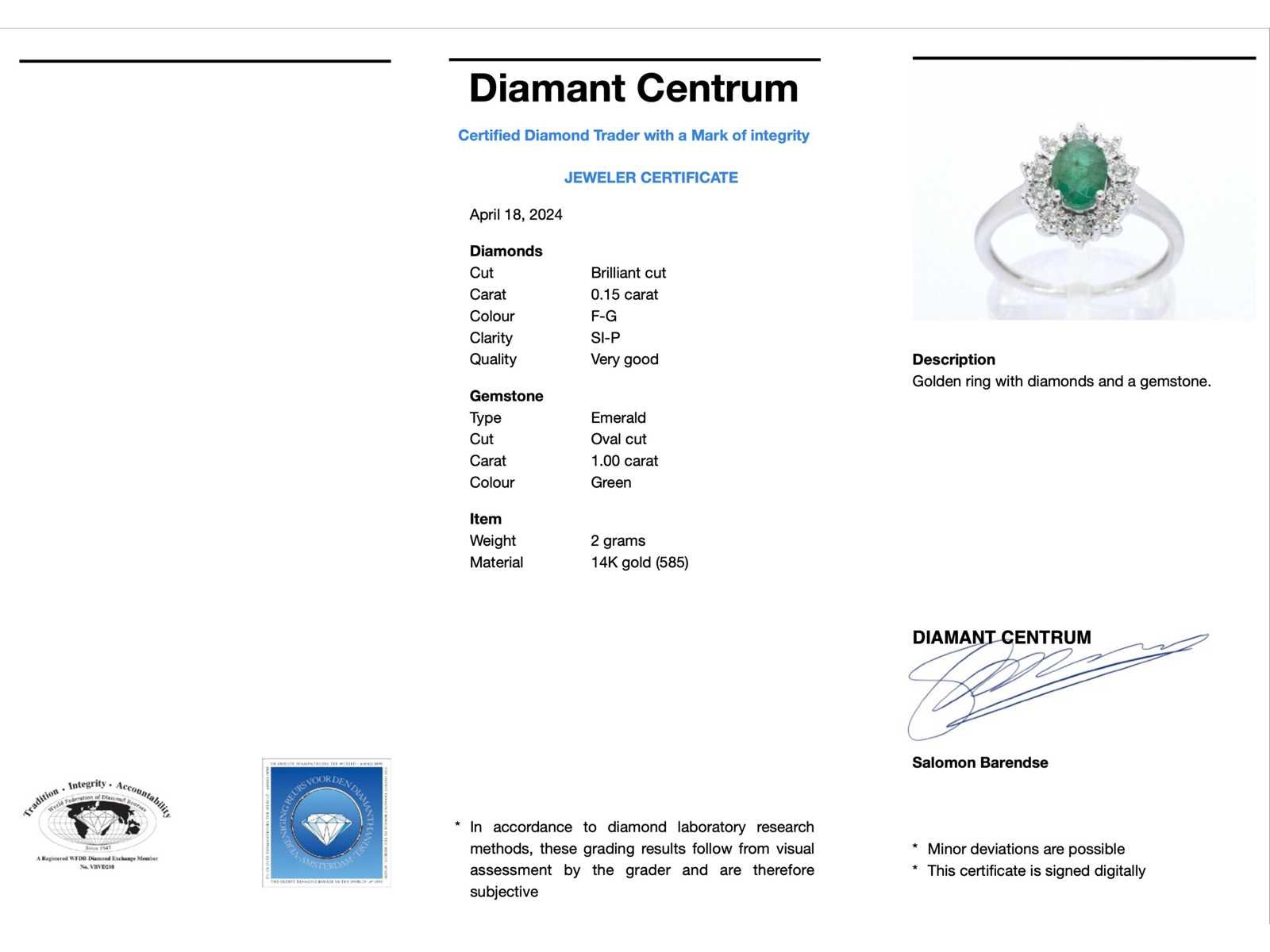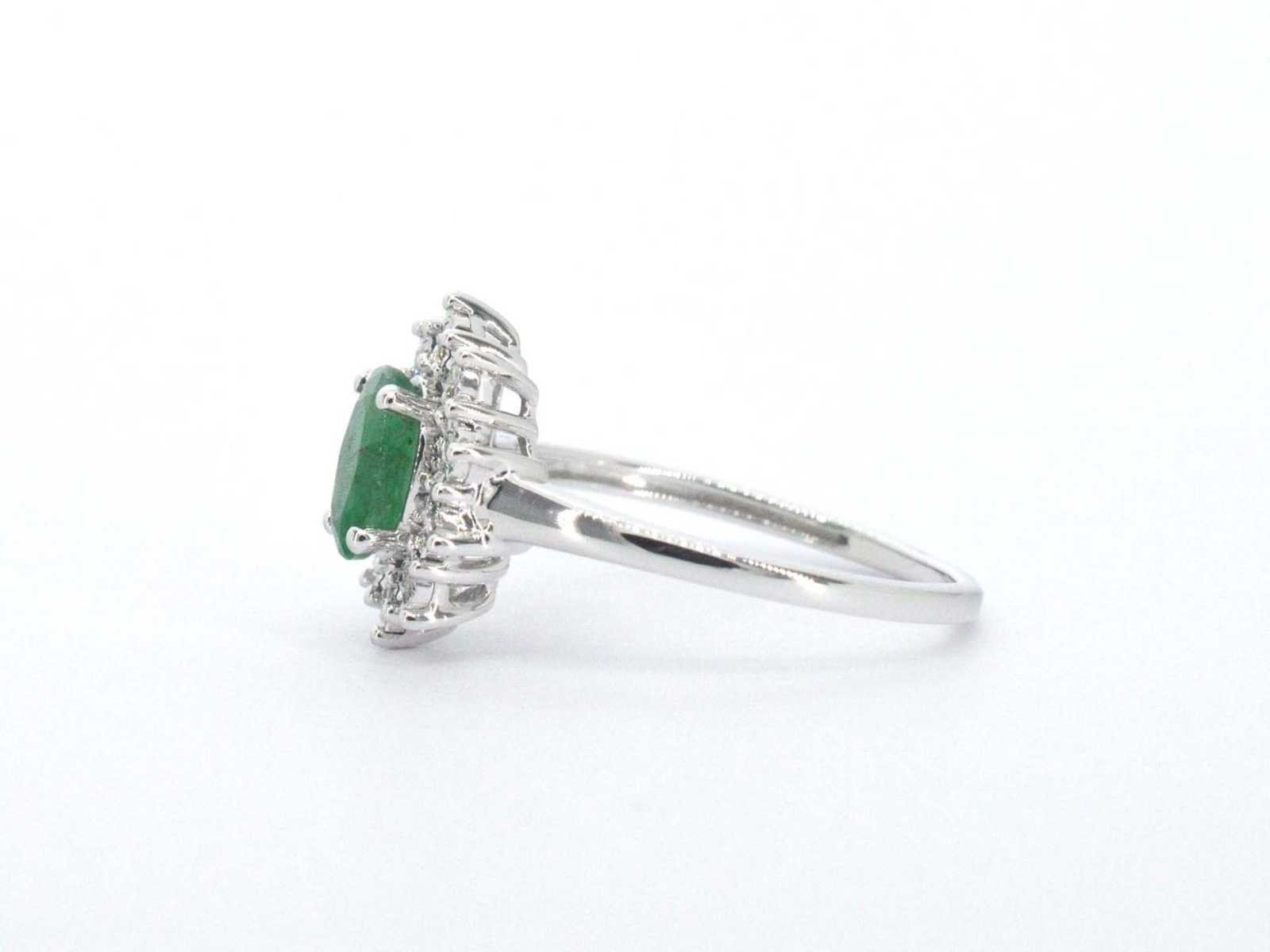 Samenvatting van gegevens Witgouden entourage ring met smaragd en diamanten Diamant: Natuurlijk; Slijpvorm: Briljant geslepen; Gewicht (carat): 0.15 carat; Kleur: F-G; Zuiverheid: SI-P; Slijpkwaliteit: Zeer mooi; Edelsteen: Smaragd; Slijpvorm: Ovaal geslepen; Gewicht (carat): 1.00 carat; Kleur: Groen; Juweel: Ring; Gewicht: 2 gram; Ringmaat (op maat gemaakt*): 54 (17.25 mm); Materiaal: 14 karaat (585); Conditie: Nieuw; Verpakking: Luxe sieradendoos; Toelichting: De kwaliteit is overgenomen van het rapport behorend bij item. De waardebepaling is een beoordeling van een gecertificeerde diamantair, gebaseerd op consumentenprijzen.; Consumentenprijs: € 1.925,- Within 14 days Voornaamste diamant: Natuurlijk Gewicht diamant: 0.15ct Edelsteen: Smaragd Totaal gewicht: 2g Keurmerk: 585 Kleur diamant: F-G Slijpvorm diamant: Briljant geslepen Slijpkwaliteit diamant: Zeer mooi Zuiverheidsgraad diamant: SI-P Kleur edelsteen: Groen Slijpvorm edelsteen: Ovaal geslepen