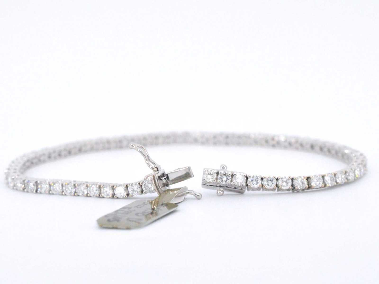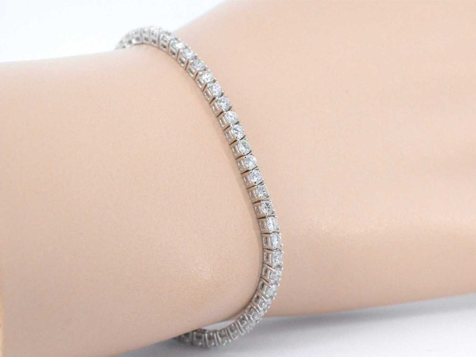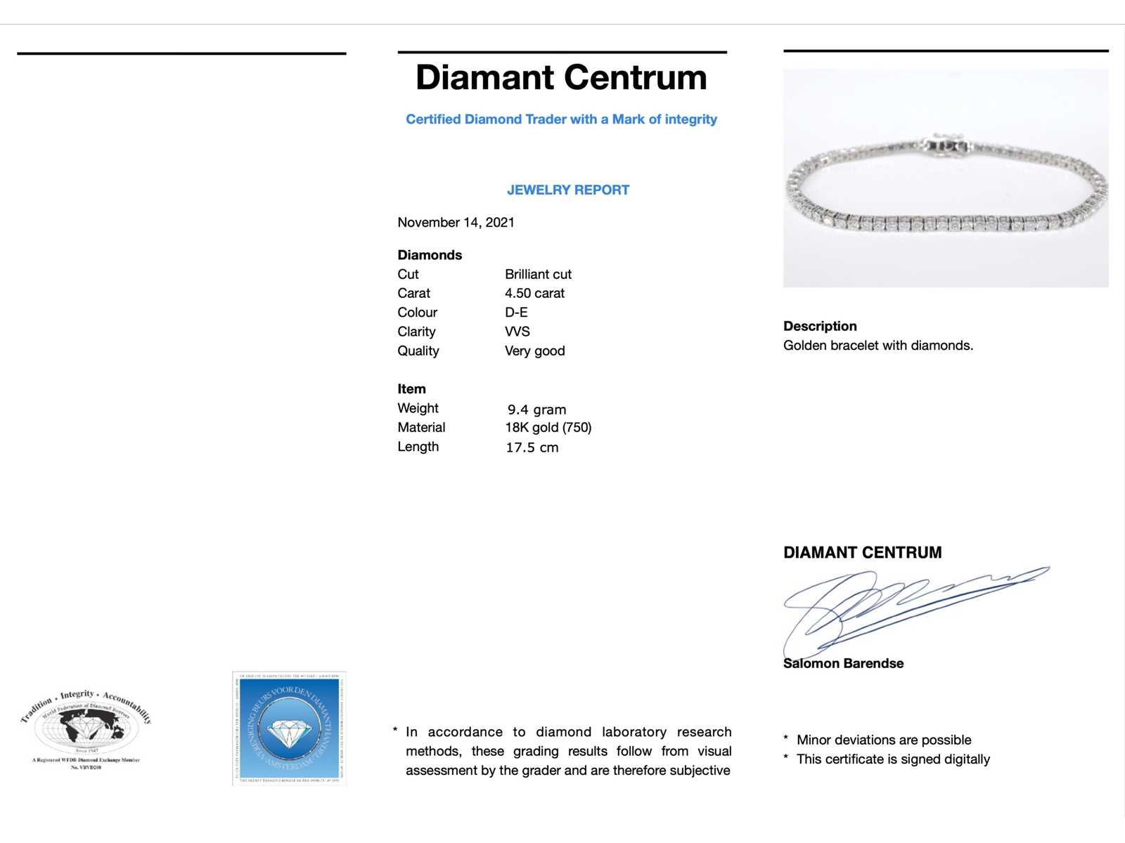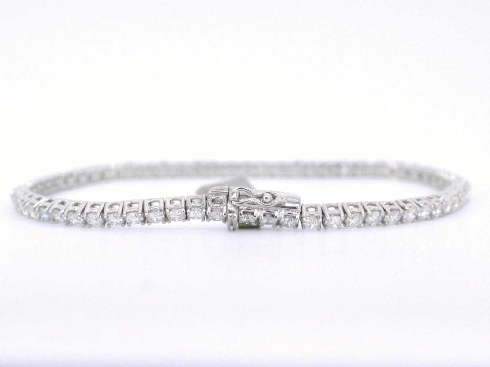 Samenvatting van gegevens Witgouden armband vol met briljant geslepen diamanten 4.50 carat Diamant: Natuurlijk; Aantal: 64 stuks; Slijpvorm: Briljant geslepen; Gewicht (carat): 4.50 carat; Kleur: D-E; Zuiverheid: VVS-VS; Slijpkwaliteit: Zeer mooi; Juweel: Armband; Gewicht: 9.4 gram; Afmetingen/lengte: 17,5 cm (aanpasbaar); Materiaal: 18K goud (750); Conditie: Nieuw; Verpakking: Luxe sieradendoos; Toelichting: De kwaliteit is overgenomen van het rapport behorend bij item. De waardebepaling is een beoordeling van een gecertificeerde diamantair, gebaseerd op consumentenprijzen.; Consumentenprijs: € 26.640,- Within 14 days Materiaal: Goud Voornaamste diamant: Natuurlijk Kleur diamant: D-E Gewicht diamant: 4.50ct Slijpvorm diamant: Briljant geslepen Slijpkwaliteit diamant: Zeer mooi Zuiverheidsgraad diamant: VVS-VS Totaal gewicht: 9.4g Keurmerk: 750