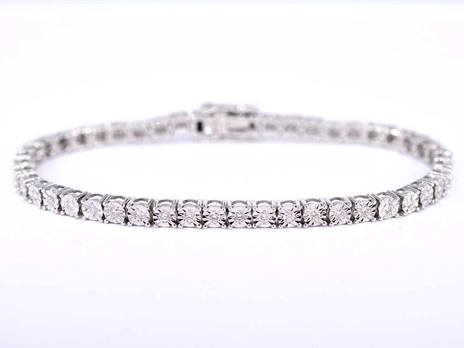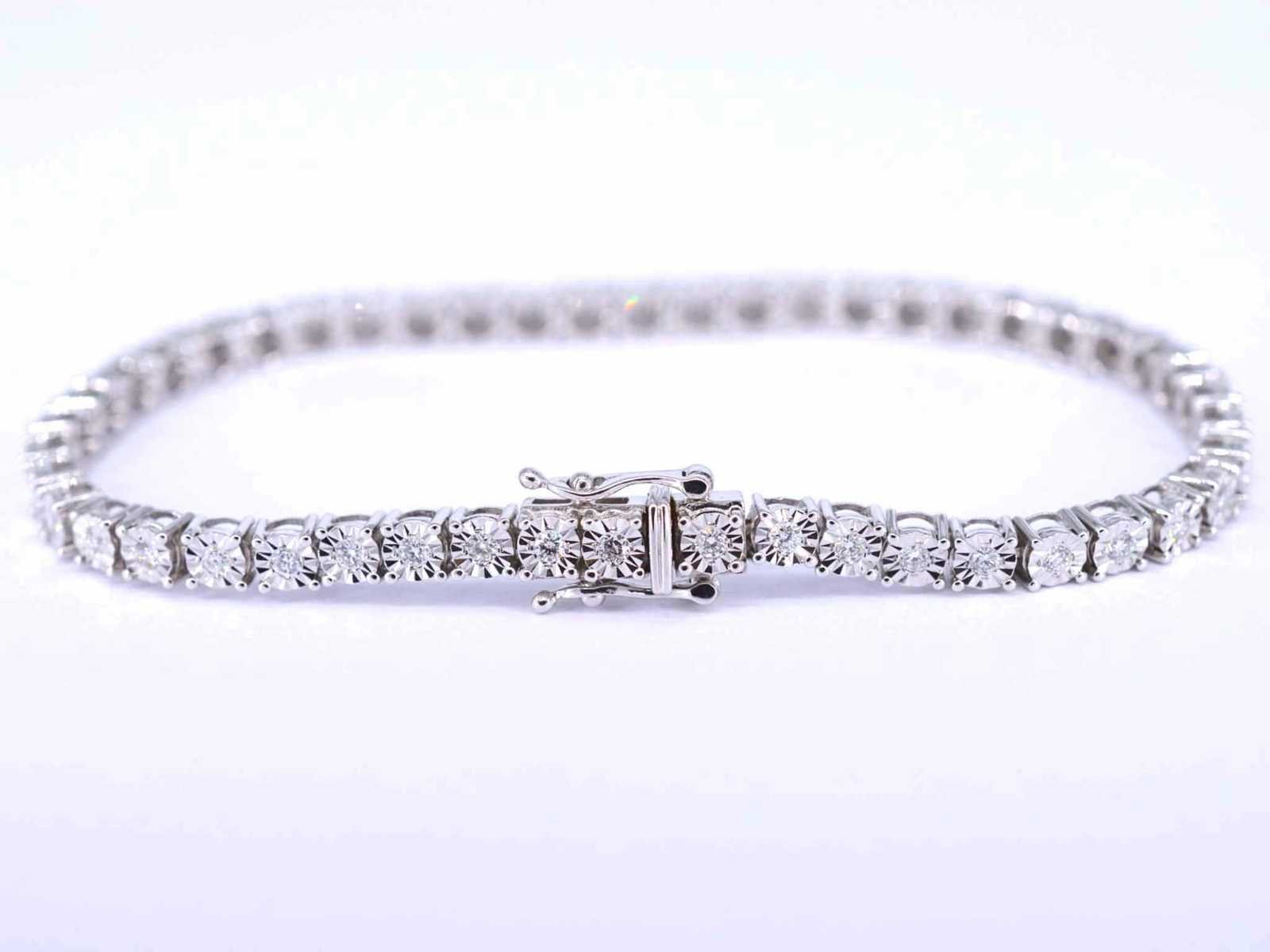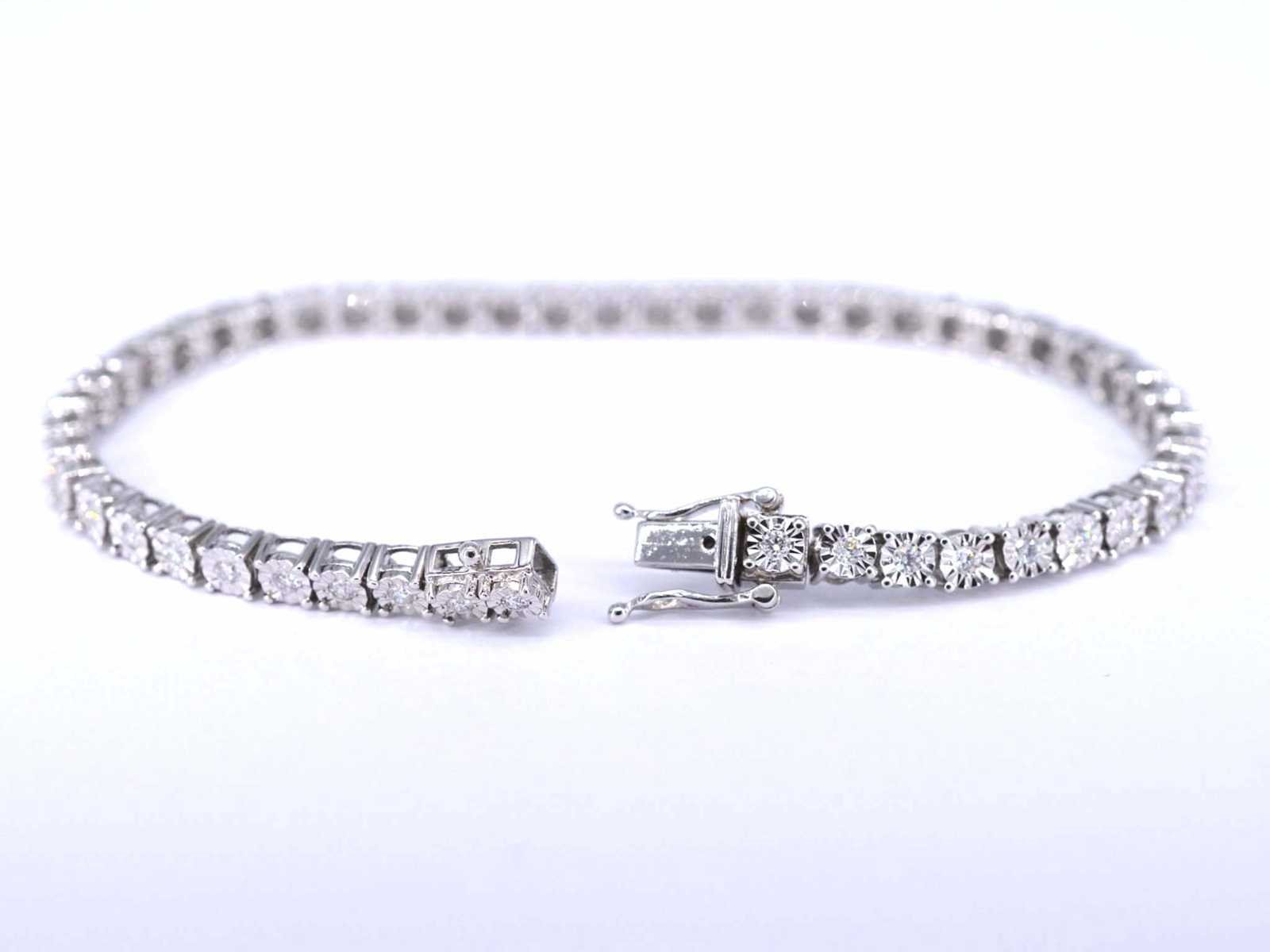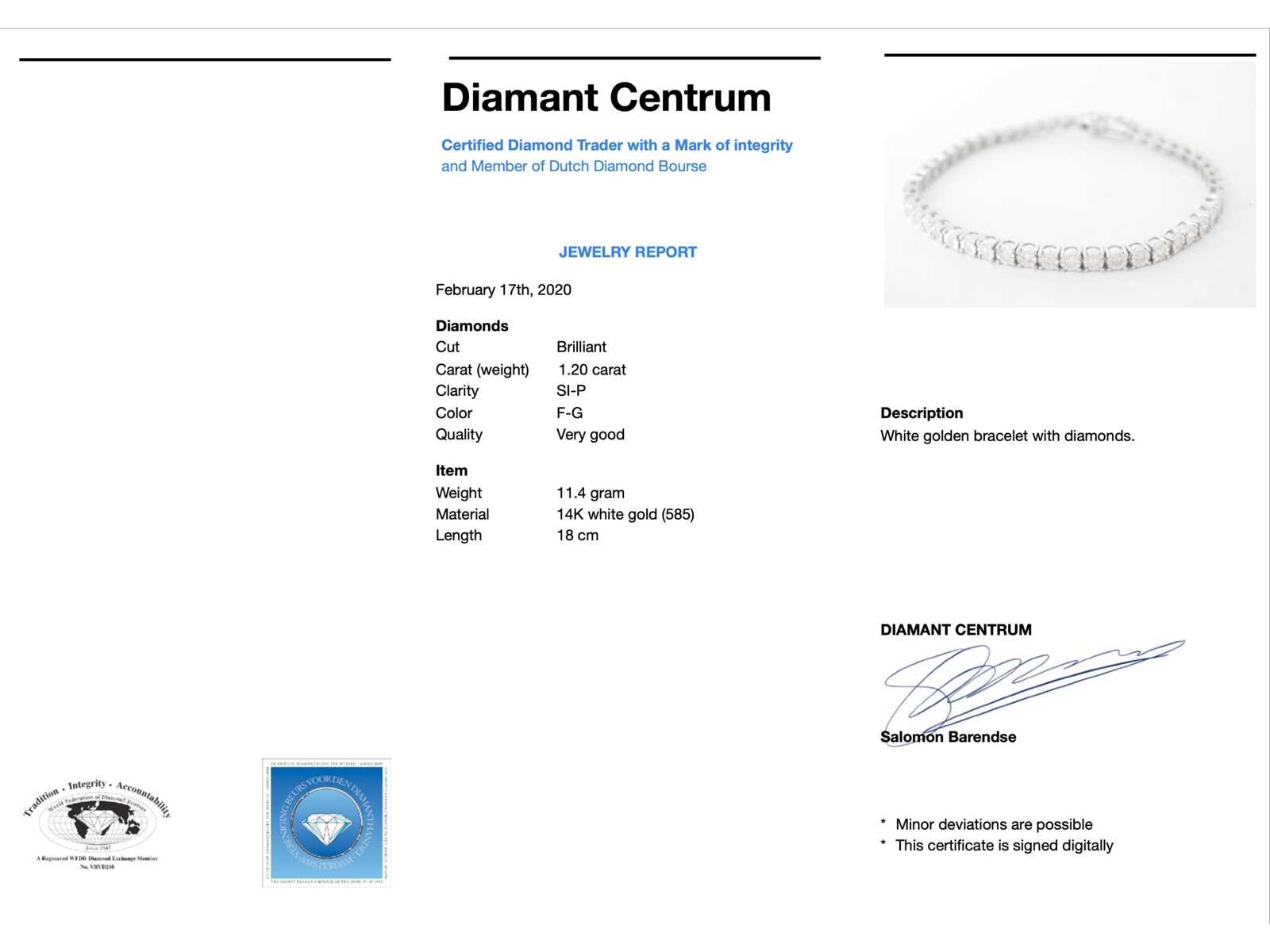 Samenvatting van gegevens Witgouden tennisarmband met diamanten 1.20 carat Diamant: Natuurlijk; Slijpvorm: Briljant geslepen; Gewicht (carat): 1.20 carat; Kleur: F-G; Zuiverheid: SI-P; Slijpkwaliteit: Zeer mooi; Juweel: Armband; Gewicht: 11.4 gram; Afmetingen/lengte: 18 cm; Materiaal: 14 karaat (585); Conditie: Nieuw; Verpakking: Luxe sieradendoos; Toelichting: De kwaliteit is overgenomen van het rapport behorend bij item. De waardebepaling is een beoordeling van een gecertificeerde diamantair, gebaseerd op consumentenprijzen.; Consumentenprijs: € 7.350,- Within 14 days Voornaamste diamant: Natuurlijk Kleur diamant: F-G Gewicht diamant: 1.20ct Slijpvorm diamant: Briljant geslepen Slijpkwaliteit diamant: Zeer mooi Zuiverheidsgraad diamant: SI-P Totaal gewicht: 11.4g Keurmerk: 585
