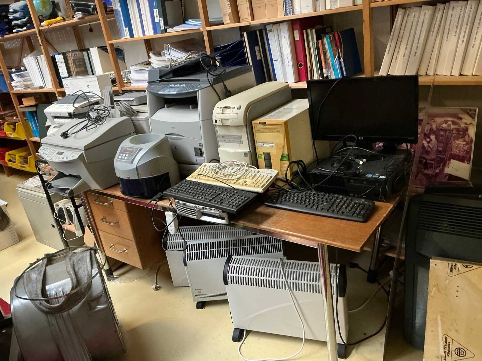 Bestaande uit 5 printers, geldtelmachine 8 desktops ( 3x Lenovo Thinkcentre M71e in doos)met studiemateriaal en 3 elektroheaters.