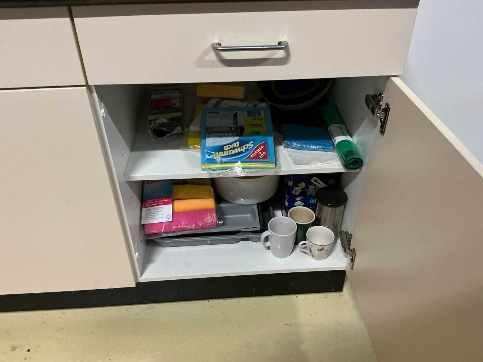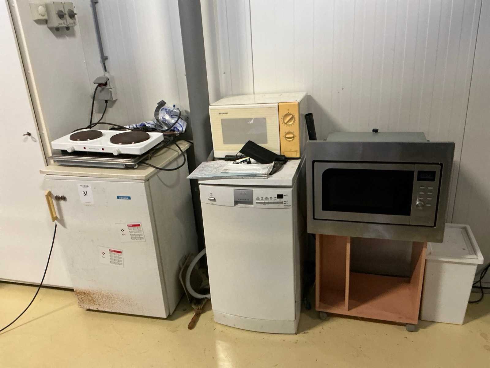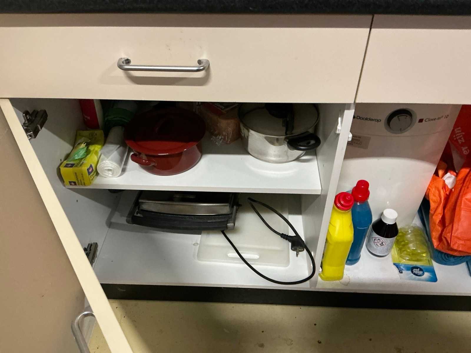 Bestaande uit Rommelsbacher kookplaat, AEG vaatwasmachine, Frilec koelkast, Combimagnetron, Sharp magnetron, koffiezetapparaat, waterkoker en inhoud keukenkastjes, zonder de boiler. Dit kavel dient bezemschoon opgeleverd te worden.