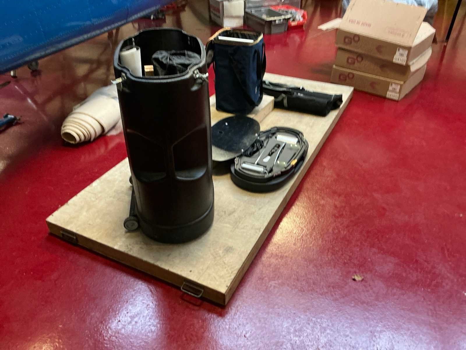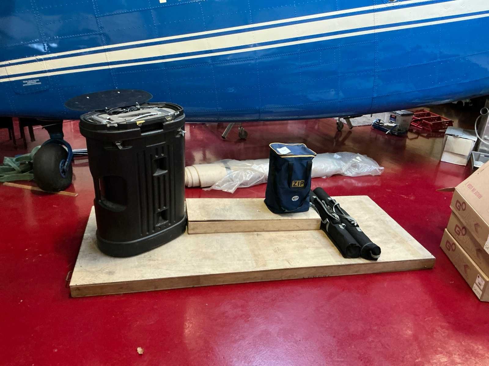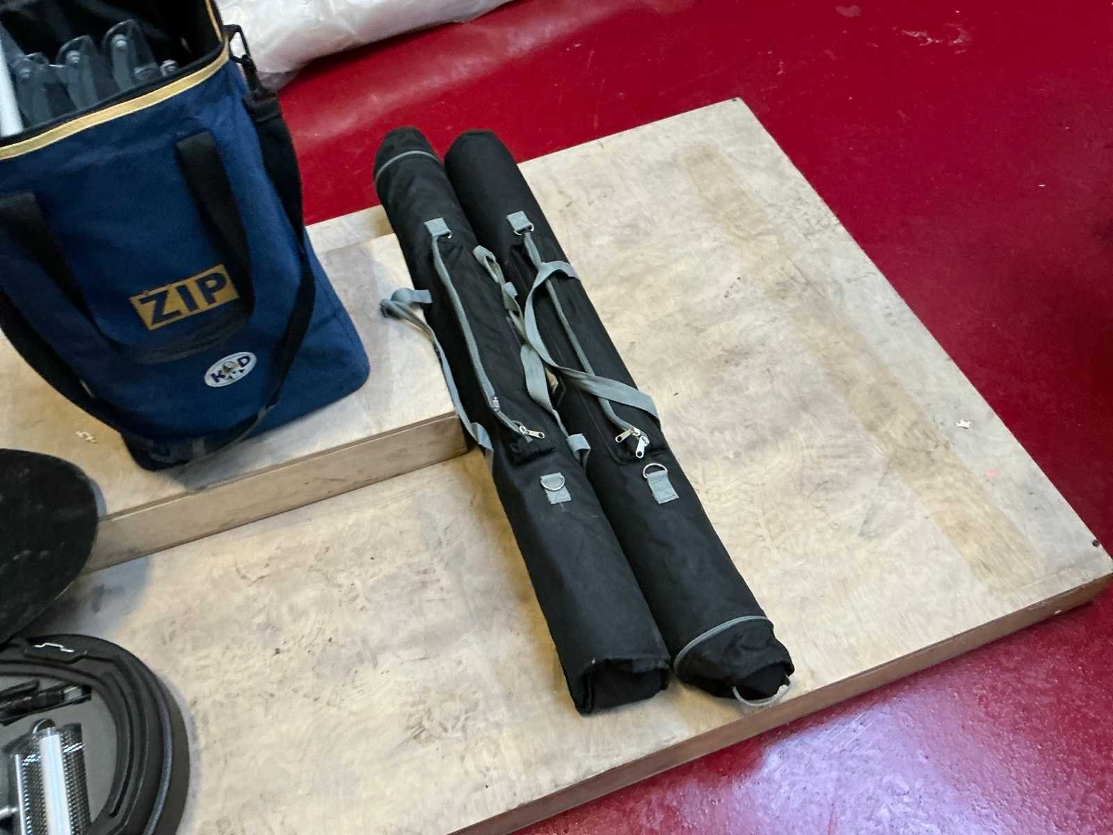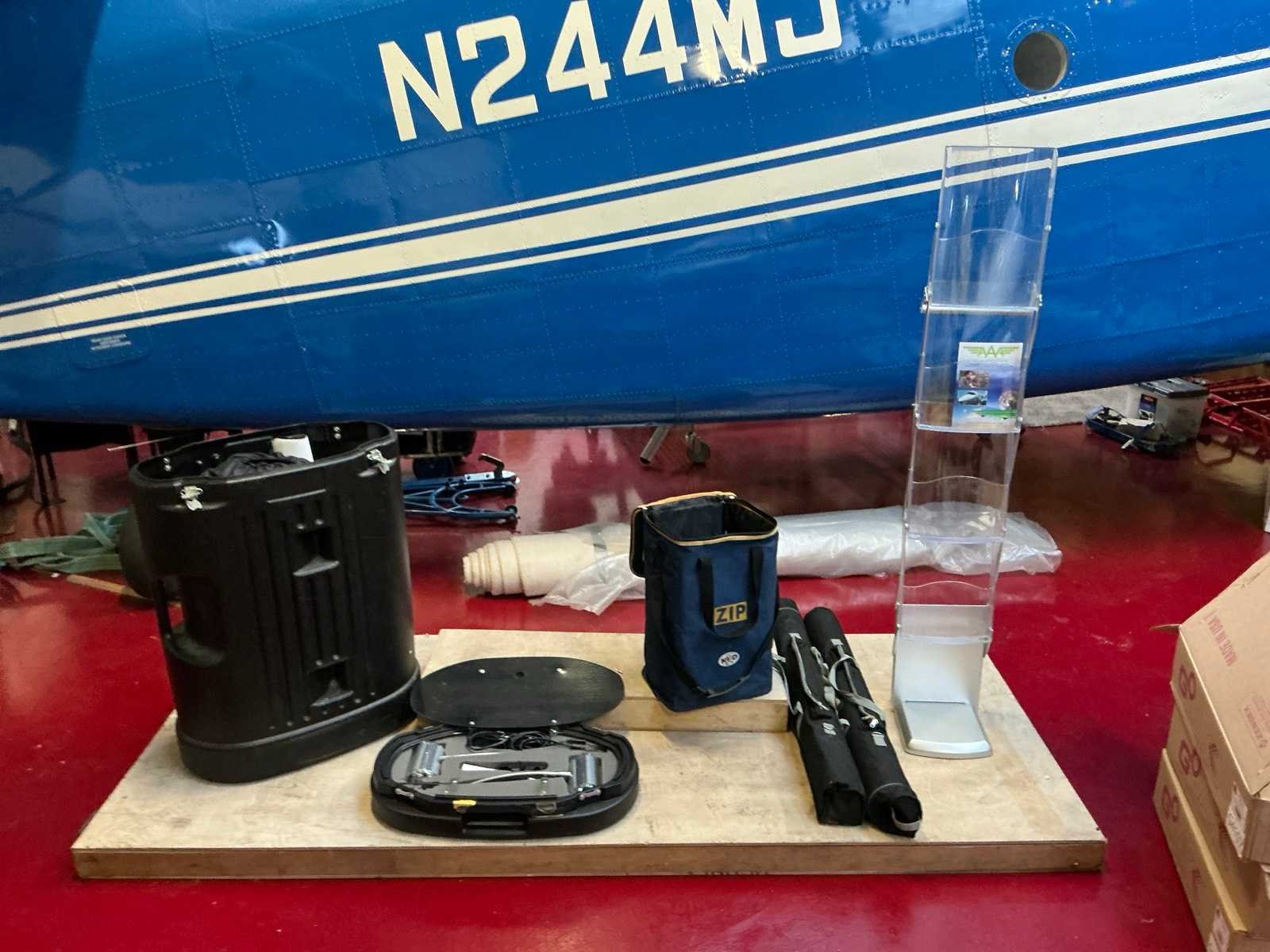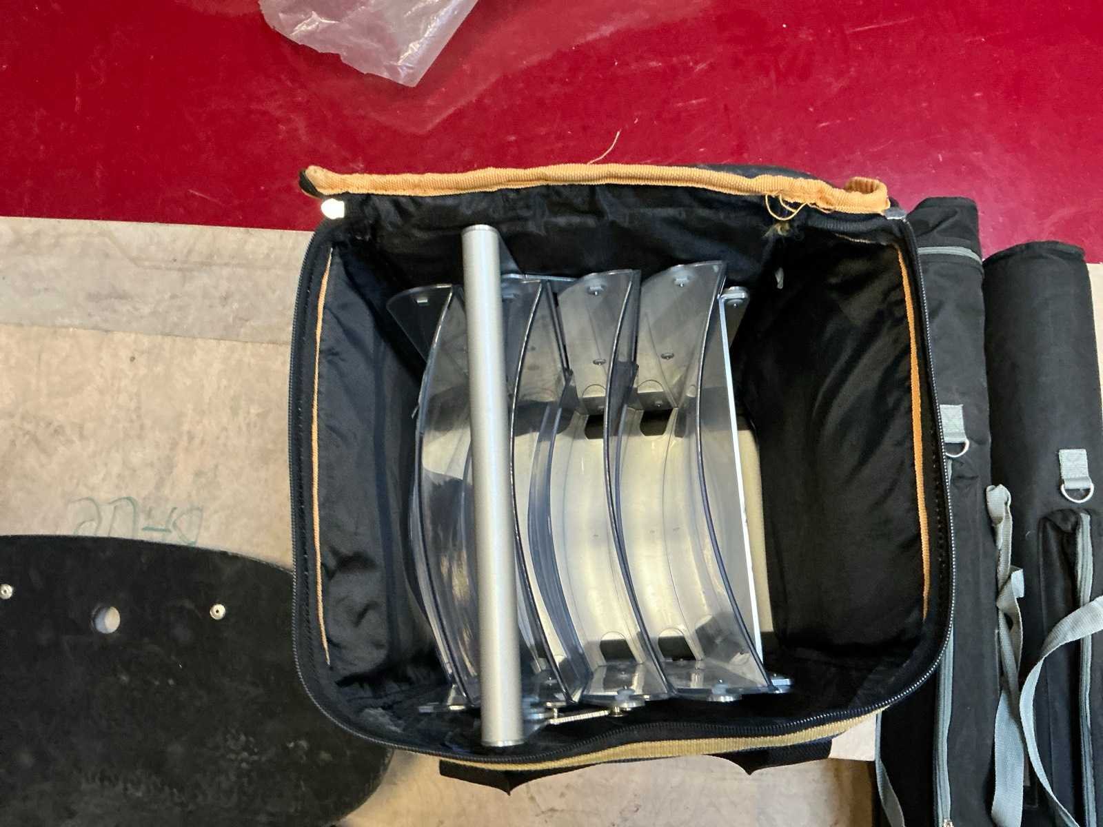 Bestaande uit een verrijdbare kist met een tent en verlichting, podium (248x104x9cm), uitklapbare folderstandaard