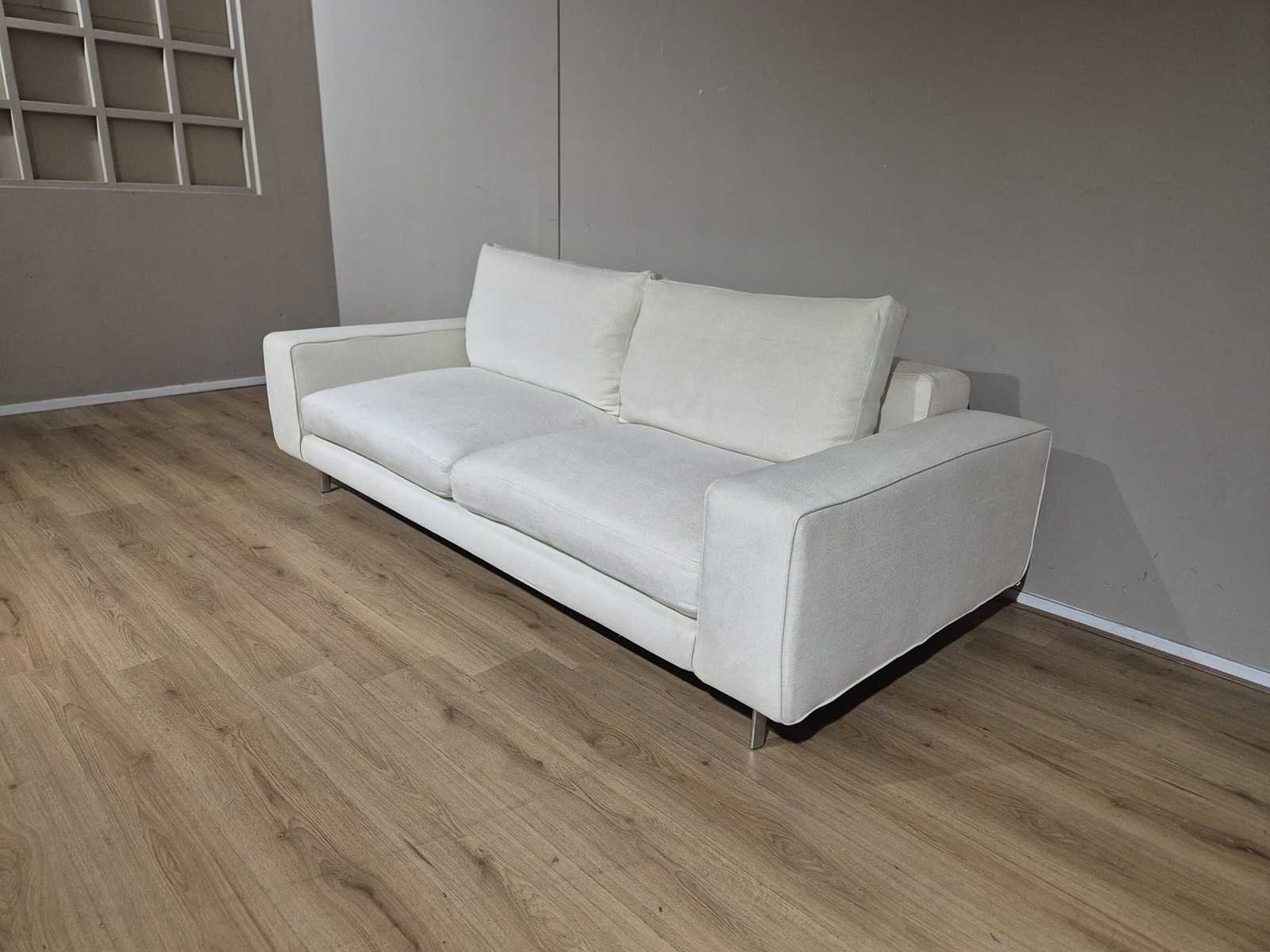 Merk: Minotti Model: Sherman Product type: 3 zits Bank + Hocker Kleur: Wit Gewicht: 80kg Lengte: 222cm Breedte: 103cm Hoogte: 84cm Zithoogte: 38cm Diepte: 52cm Materiaal: Stof