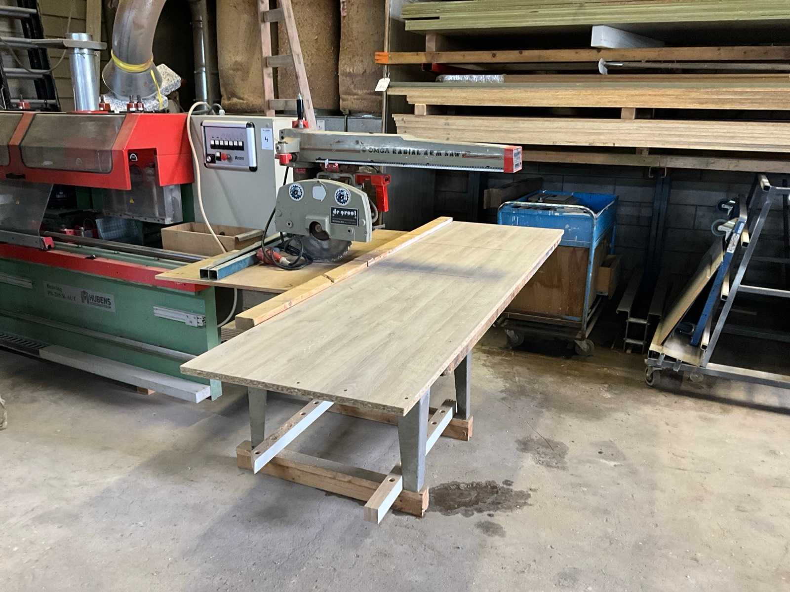 Merk: Omga Type: Radial 600 P3S Zaagblad Ø: 300mm Zaaghoogte: 100mm Tafel afmeting l: 2270mm Tafel afmeting b: 610mm Afmeting l: 1330mm Afmeting b: 2270mm Afmeting h: 1550mm Aansluiting: 400V