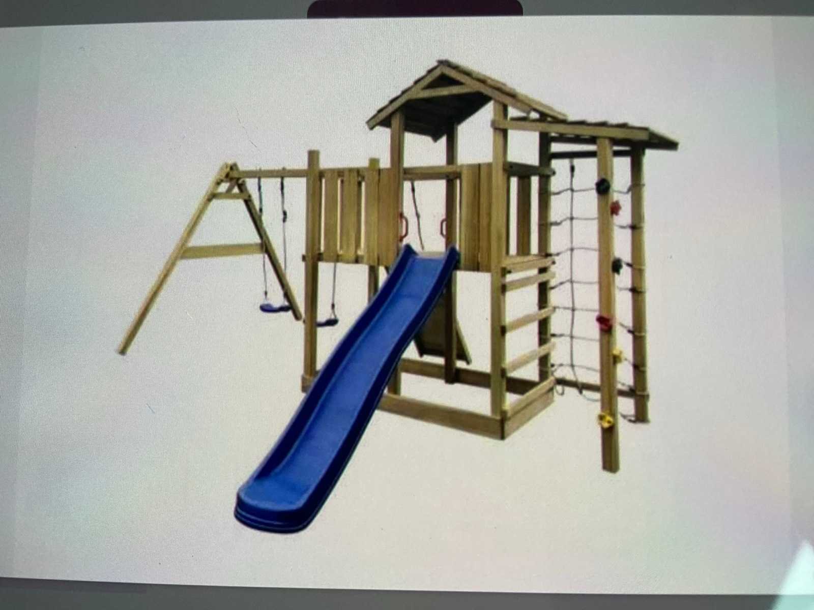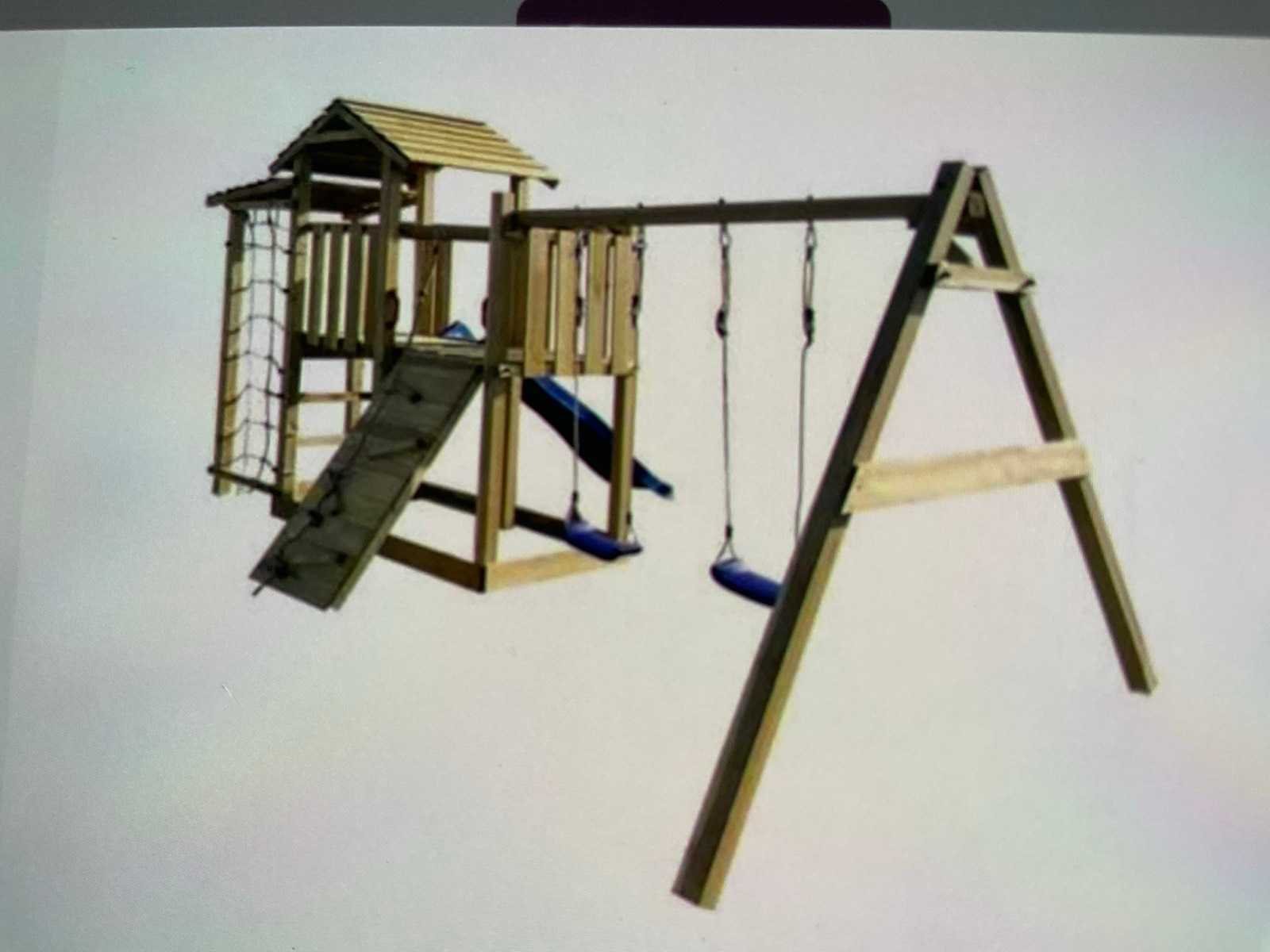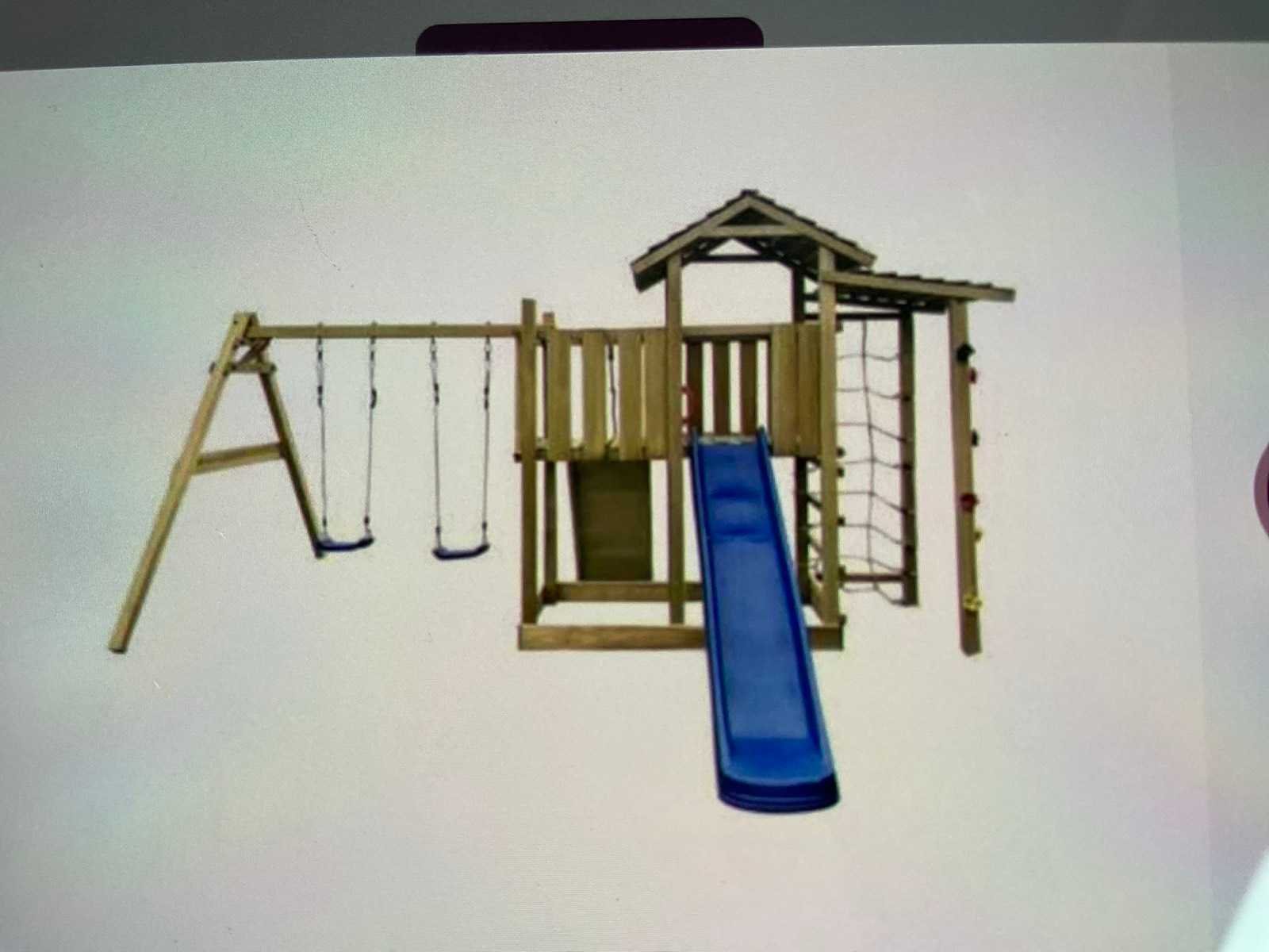 Geleverd met bevestigingsmateriaal en handleidingen. Glijbaan met schommels klimnet en klimstenen. Let op! Dit is een retour pallet pakket ligt verkleurt zie foto Gewicht: 275kg Lengte: 353cm Breedte: 390cm Hoogte: 268cm Materiaal: Grenen geimpregneerd