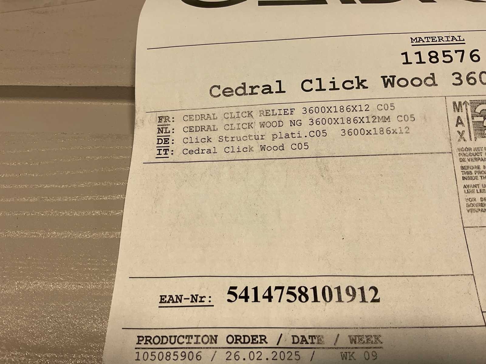 Cedral Click Wood 3600x186x12 mm gevelplaten Brandklasse: A2-s1, d0 Gewicht per plank: 12,86 kg Merk: Cedral Model: Click Wood Product type: Gevelstrook Kleur: Platinagrijs Lengte: 360cm Breedte: 18,6cm Hoogte: 1,2cm Materiaal: Cementvezel