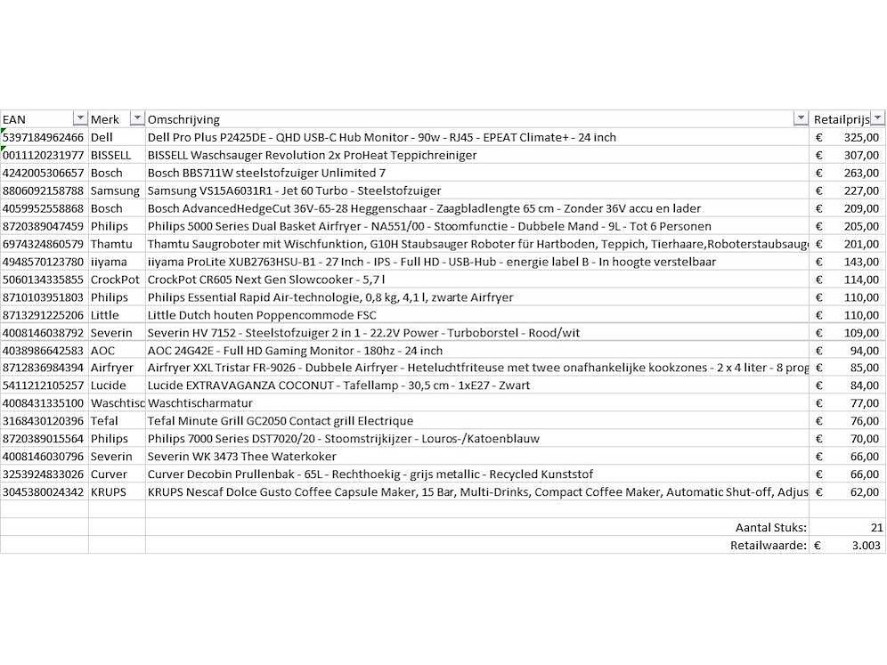 Dit betreft een partij A-merk retourgoederen van een grote online retailer. De partij bestaat uit diverse productcategorieën. Aantal stuks: 21. Retailwaarde: €3003,- Ongecontroleerd: werking onbekend (mix van werkend, incompleet, beschadigd, te gebruiken voor onderdelen). Kom op de kijkdag om te om zo een goed beeld te krijgen van de reden van retour. Zie foto's voor lijst met inhoud. Bezorgtermijn 14 dagen Merk: Pallet Retourgoederen