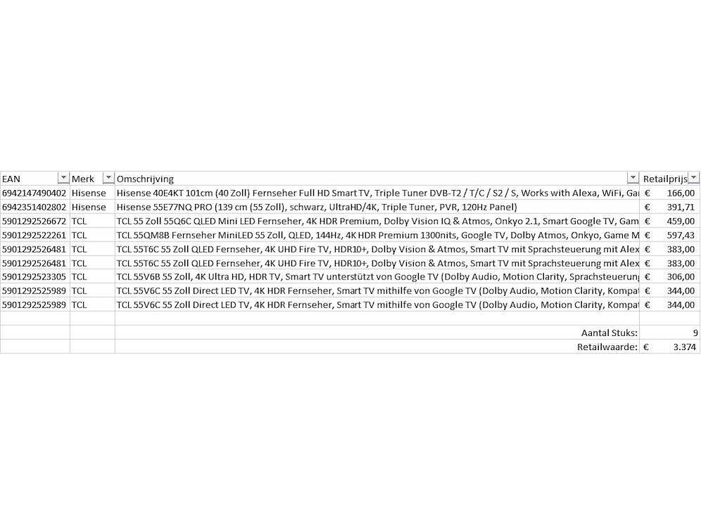 Dit betreft een partij televisies retourgoederen van een grote online retailer. De partij bestaat uit diverse diverse maten televisies. Aantal stuks: 9. Retailwaarde: €3374,- De televisies zijn niet werkend en zijn te gebruiken voor onderdelen. Kom op de kijkdag om te om zo een goed beeld te krijgen van de reden van retour. Zie foto's voor lijst met inhoud. Bezorgtermijn 14 dagen Merk: Pallet Retourgoederen - Televisies
