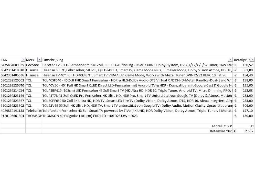 Dit betreft een partij televisies retourgoederen van een grote online retailer. De partij bestaat uit diverse diverse maten televisies. Aantal stuks: 11. Retailwaarde: €2587,- De televisies zijn niet werkend en zijn te gebruiken voor onderdelen. Kom op de kijkdag om te om zo een goed beeld te krijgen van de reden van retour. Zie foto's voor lijst met inhoud. Bezorgtermijn 14 dagen Merk: Pallet Retourgoederen - Televisies