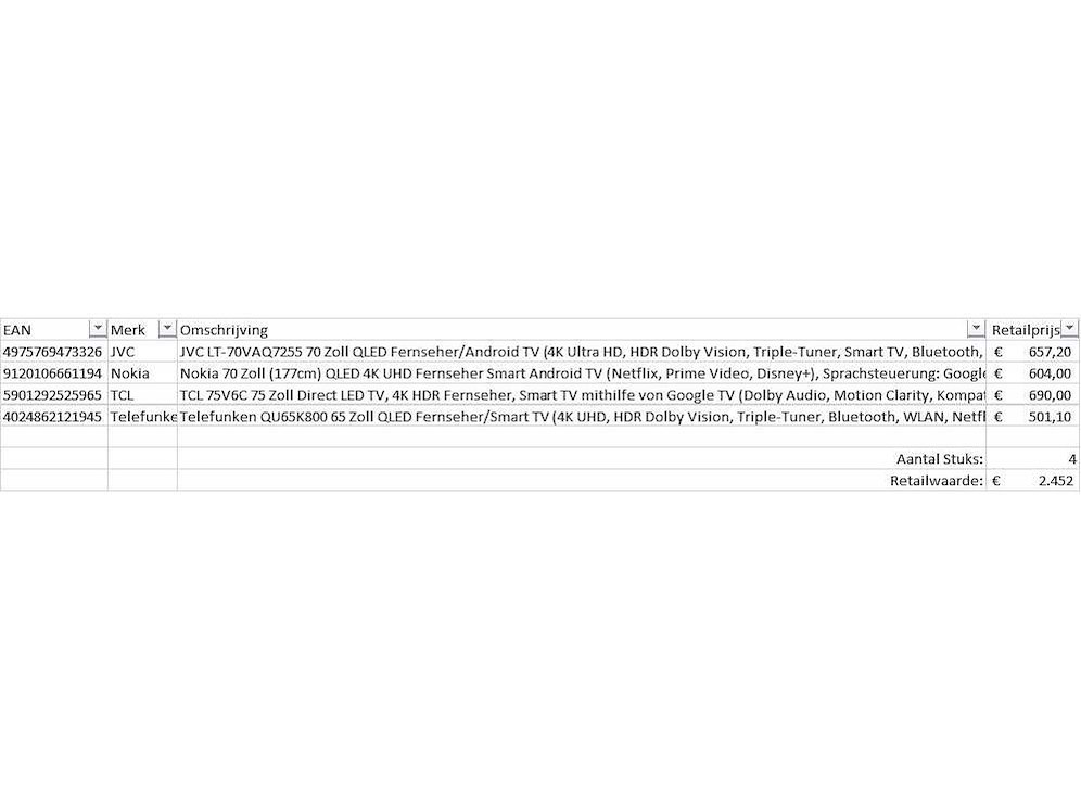 Dit betreft een partij televisies retourgoederen van een grote online retailer. De partij bestaat uit diverse diverse maten televisies. Aantal stuks: 4. Retailwaarde: €2452,- De televisies zijn niet werkend en zijn te gebruiken voor onderdelen. Kom op de kijkdag om te om zo een goed beeld te krijgen van de reden van retour. Zie foto's voor lijst met inhoud. Bezorgtermijn 14 dagen Merk: Pallet Retourgoederen - Televisies