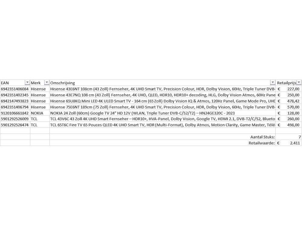 Dit betreft een partij televisies retourgoederen van een grote online retailer. De partij bestaat uit diverse diverse maten televisies. Aantal stuks: 7. Retailwaarde: €2411,- De televisies zijn niet werkend en zijn te gebruiken voor onderdelen. Kom op de kijkdag om te om zo een goed beeld te krijgen van de reden van retour. Zie foto's voor lijst met inhoud. Bezorgtermijn 14 dagen Merk: Pallet Retourgoederen - Televisies