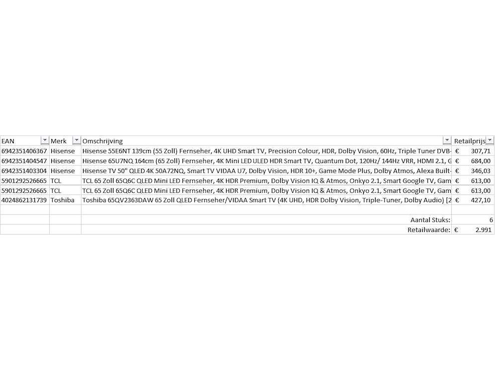 Dit betreft een partij televisies retourgoederen van een grote online retailer. De partij bestaat uit diverse diverse maten televisies. Aantal stuks: 6. Retailwaarde: €2991,- De televisies zijn niet werkend en zijn te gebruiken voor onderdelen. Kom op de kijkdag om te om zo een goed beeld te krijgen van de reden van retour. Zie foto's voor lijst met inhoud. Bezorgtermijn 14 dagen Merk: Pallet Retourgoederen - Televisies