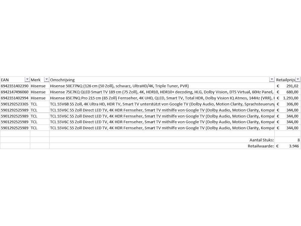 Dit betreft een partij televisies retourgoederen van een grote online retailer. De partij bestaat uit diverse diverse maten televisies. Aantal stuks: 8. Retailwaarde: €3946,- De televisies zijn niet werkend en zijn te gebruiken voor onderdelen. Kom op de kijkdag om te om zo een goed beeld te krijgen van de reden van retour. Zie foto's voor lijst met inhoud. Bezorgtermijn 14 dagen Merk: Pallet Retourgoederen - Televisies