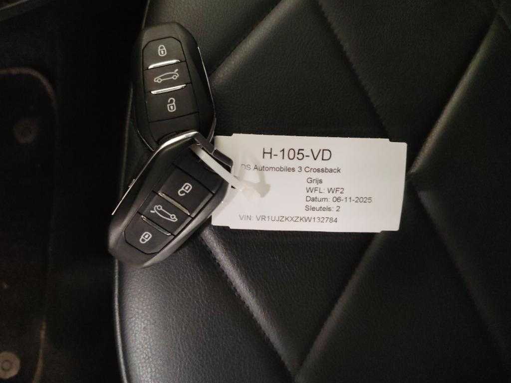 - 360 graden camera - Cruisecontrol - Navigatie - Apple Carpl./Android Auto - Elektrische ramen voor en achter - Parkeersensoren voor en achter - Audio installatie - LED verlichting - Regensensor - Automatische airconditioning ECC - Lederen bekleding - Stuurbekrachtiging - Bluetooth telefoonvoorbereiding - Lichtmetalen velgen - Verwarmde voorstoelen - Centrale vergrendeling afstandsbediening - Metallic lak Kenteken: H-105-VD Merk: DS Model: 3 Crossback Type: E-Tense Grand Chic Bouwjaar: 2020 Afgelezen kilometerstand: 114507km Brandstof: Elektriciteit Chassisnummer: VR1UJZKXZKW132784 Datum eerste toelating: 2020-06-02 Datum eerste toelating (NL): 2020-06-02 APK vervaldatum: 2026-06-02 Aandrijving: Voorwiel Aantal zitplaatsen: 5 Kleur: grijs Transmissie: Automaat Stuurwiel: Links Emissieklasse: Z Aantal deuren: 4 Aantal sleutels: 2 Ledig gewicht: 1498kg Carrosserie: Stationwagen Onderhoudshistorie: Aanwezig Carfax Link: https://was.carfax.eu/v0/api/ccdid/5100016408/svc/201/vinreg/H105VD/checksum/eyJhbGciOiJIUzI1NiIsInR5cCI6IkpXVCJ9.eyJleHAiOjE3NzMzNDM4Mzl9.1GQLm_EO1vFqx8SK_7gtFFmNQ1s99h7NbCQJpcBHq8w Start en rijdt: Start en rijdt startinformatie : Start en rijdt Self drive export possible : true oplaadkabel : Aanwezig Navigatie: true